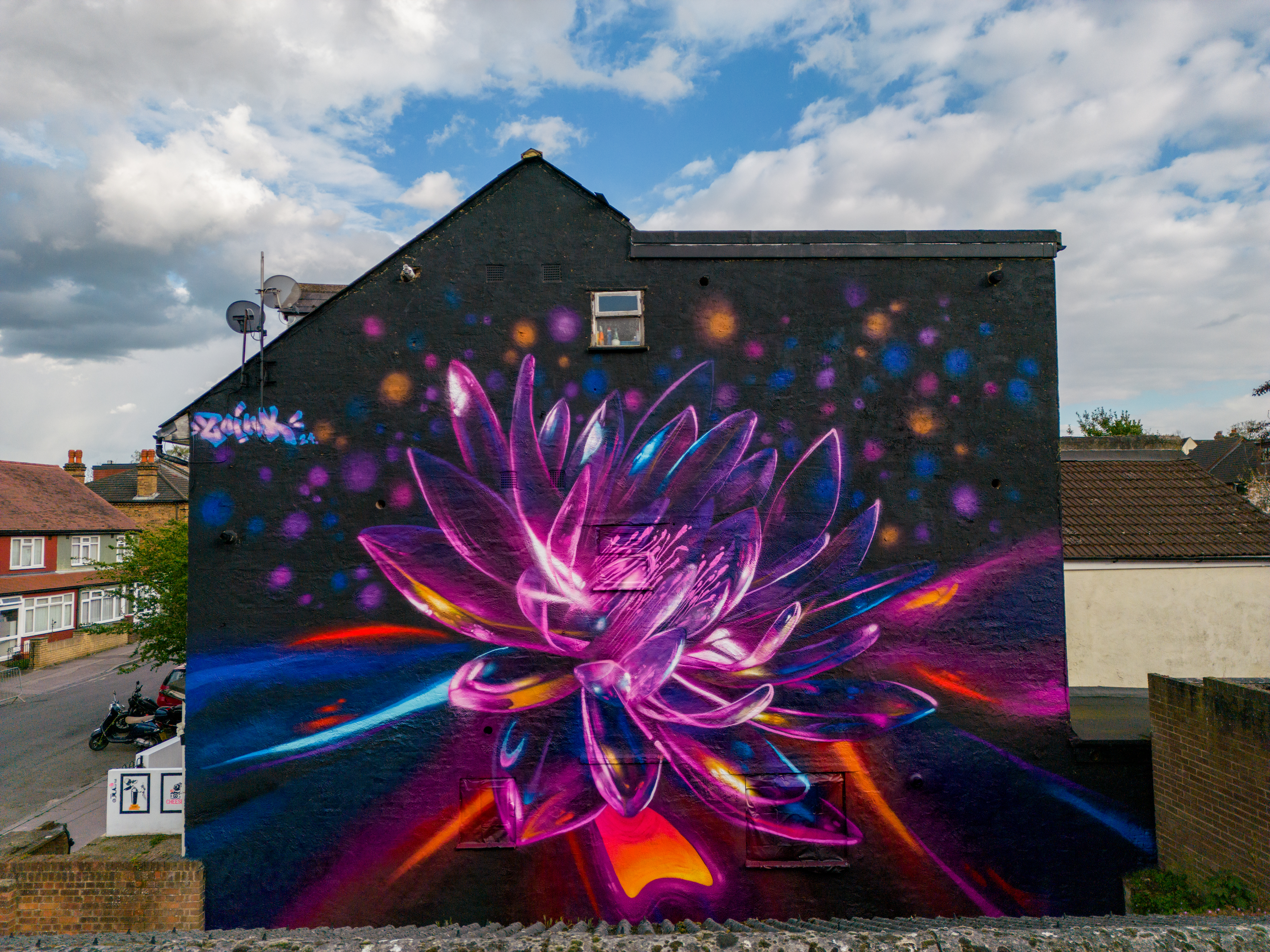 For our next blog post catching up with 2024, we are back in our corner of South-East London and looking at a pair of stunning largescale artworks from visiting Hawaiian artist and graffiti writer Zoinky, who spent a few months in London from late 2023 to early 2024. One of our favourite things about the scene is the continuous exposure to work from new artists, and it was an absolute pleasure to have this artist come to London and leave an array of diverse subjects – abstract, dreamlike realism and letter works – all imbued with his distinct style and striking purple and blue heavy colour palette. For this pair of works – presenting two out of three large scale works the artist painting in London, with the other being in Hackney Wick – Zoinky painted two floral inspired compositions piece which were both rich in textures and colours. Whilst both of the works below are exceptional, the one in Padua Road is our favourite of the two. This superb pair of works were placed with support from ourselves London Calling Blog for our SprayExhibition20 community mural project in SE20.