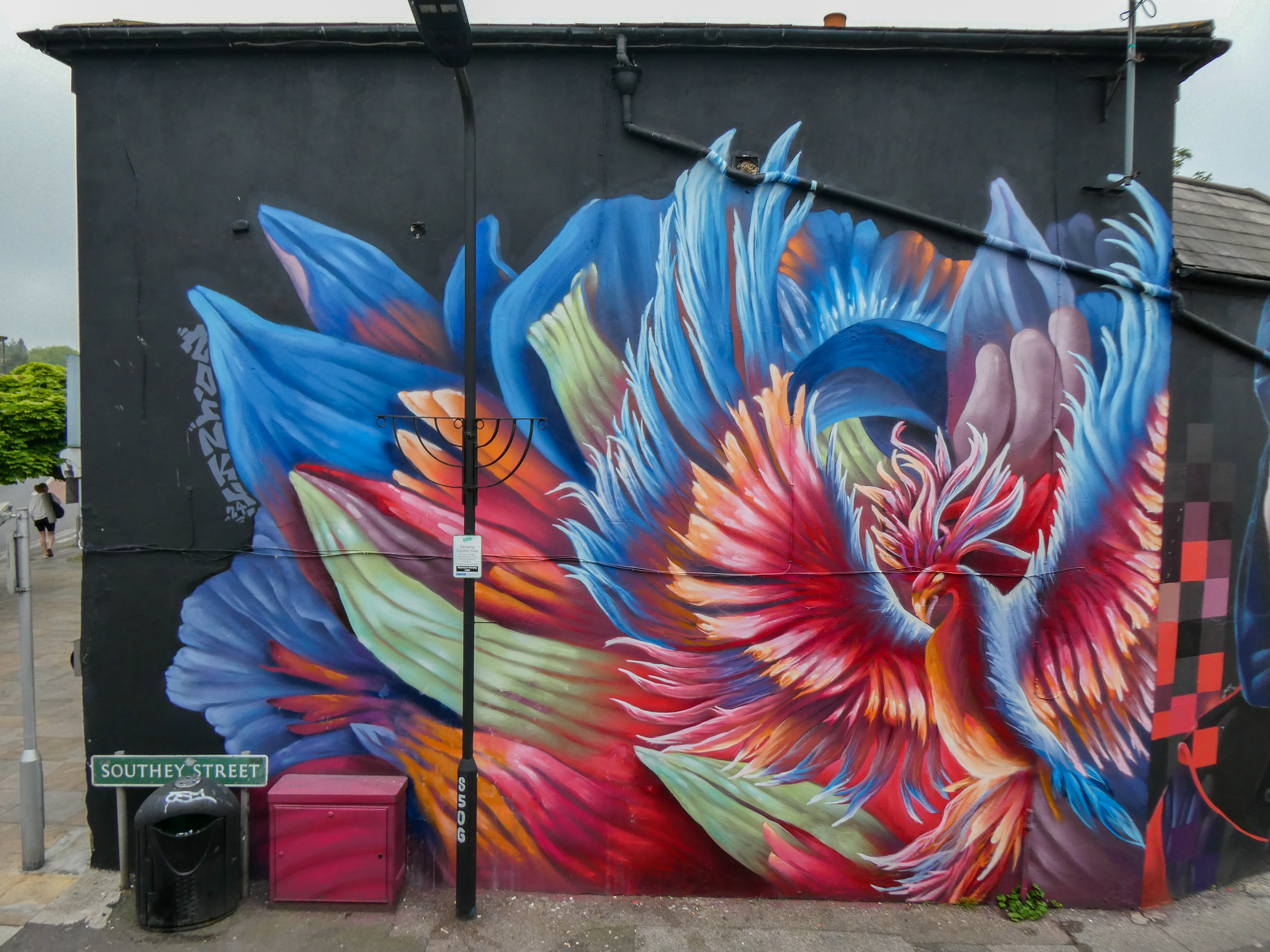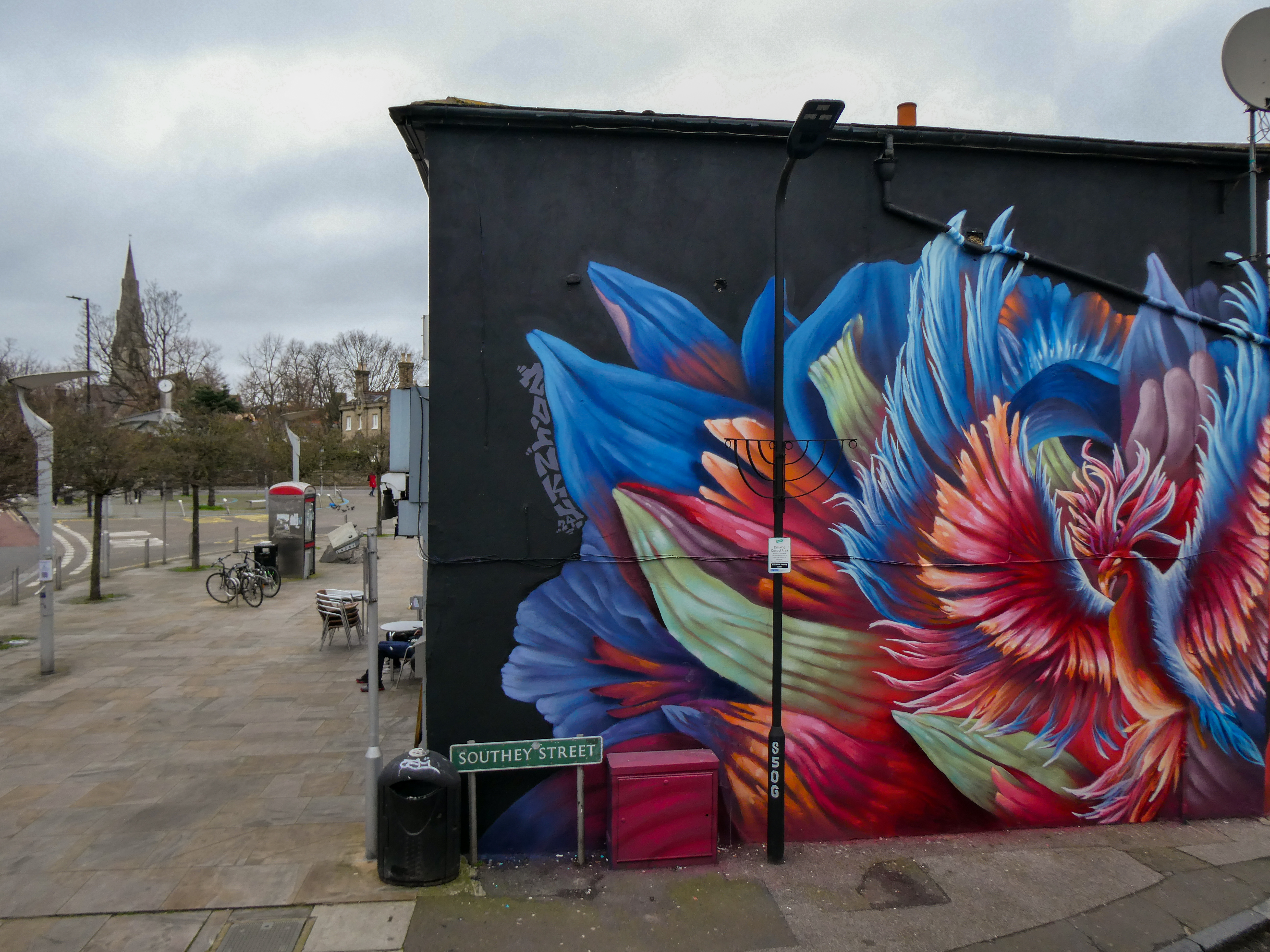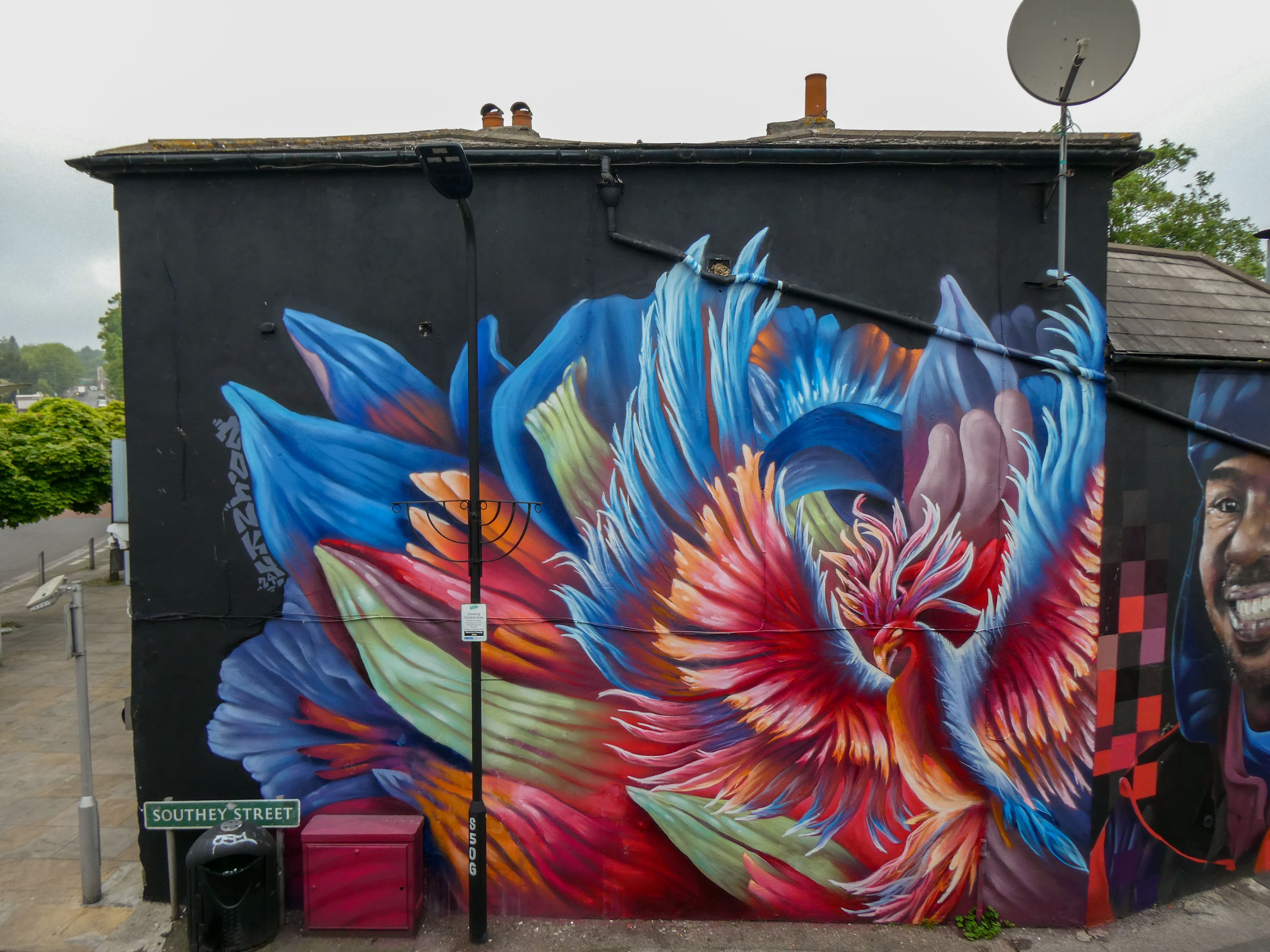 Work in Southey Street, at the heart of Penge’s High Street. This striking artwork featuring a series of flowers and a Phoenix in flight which is so full of life truly commands your attention upon passing it.
