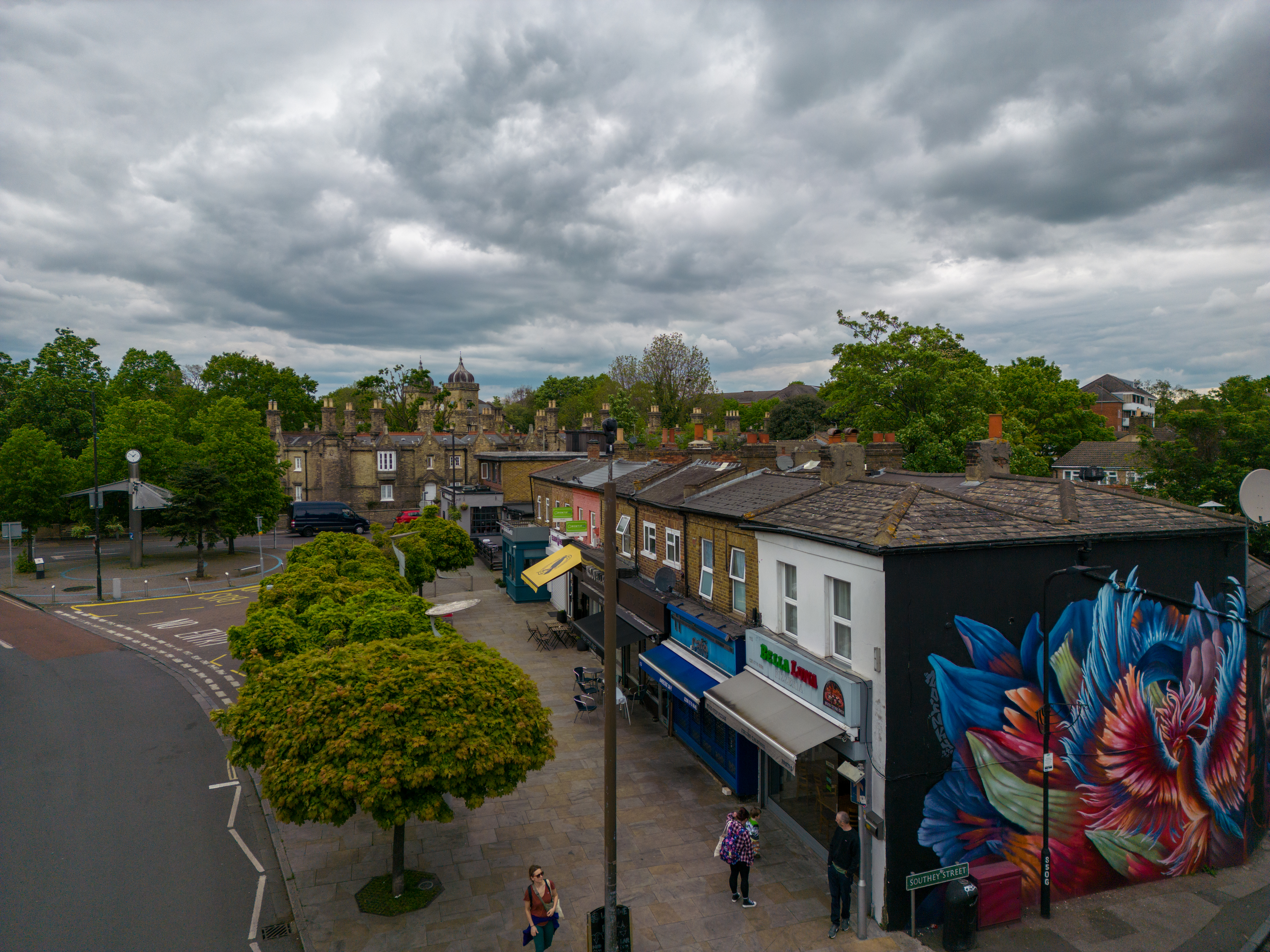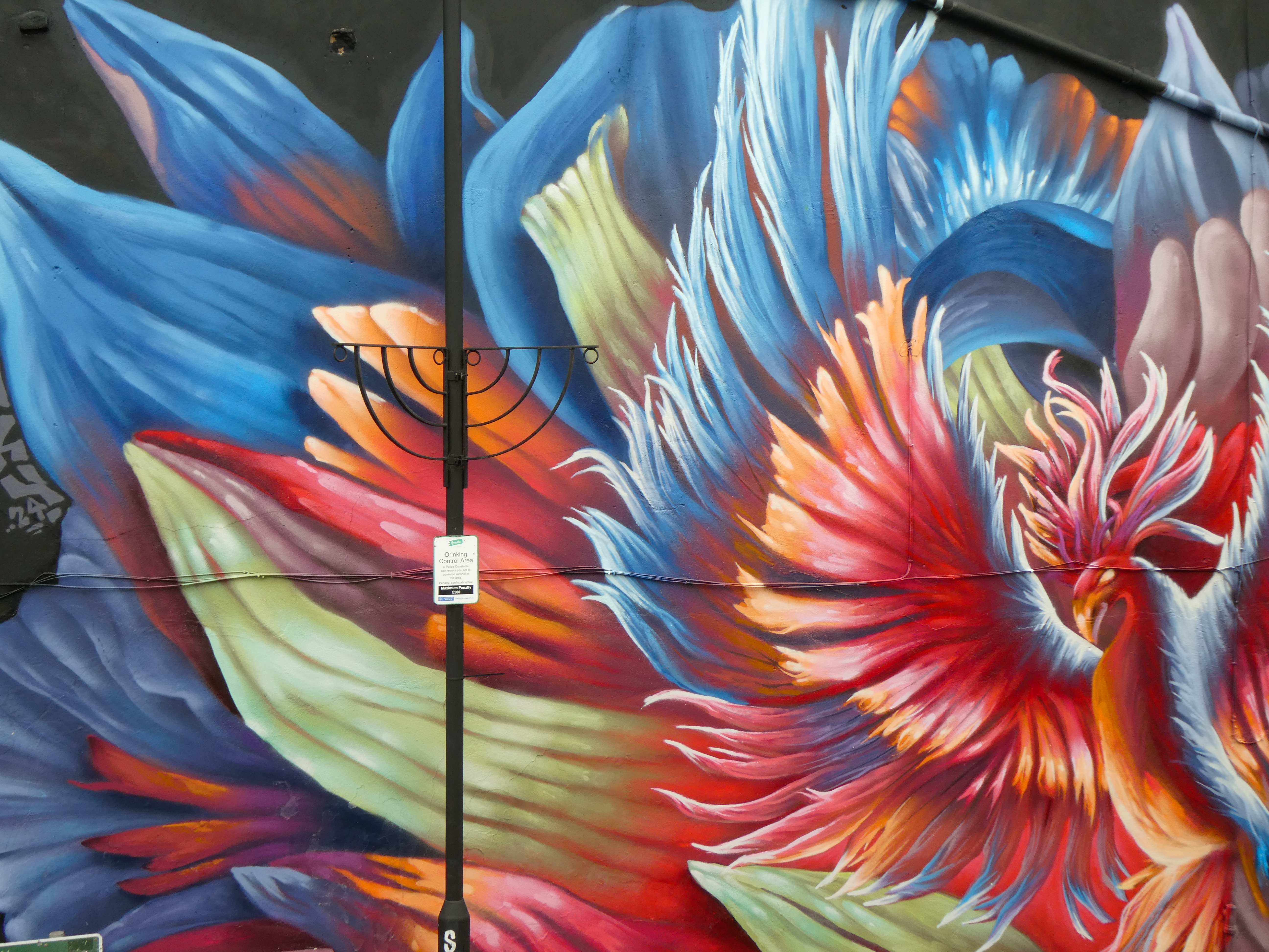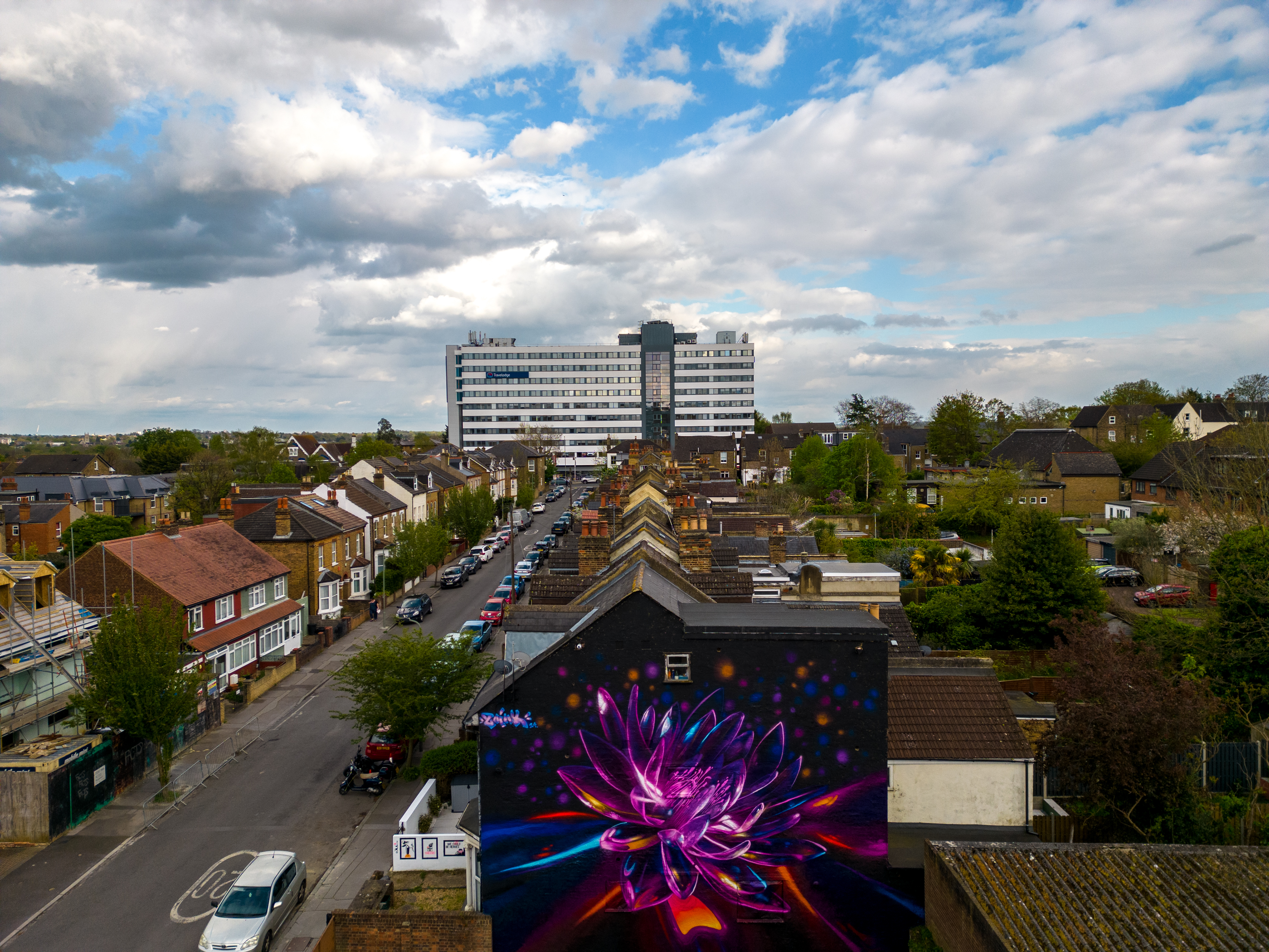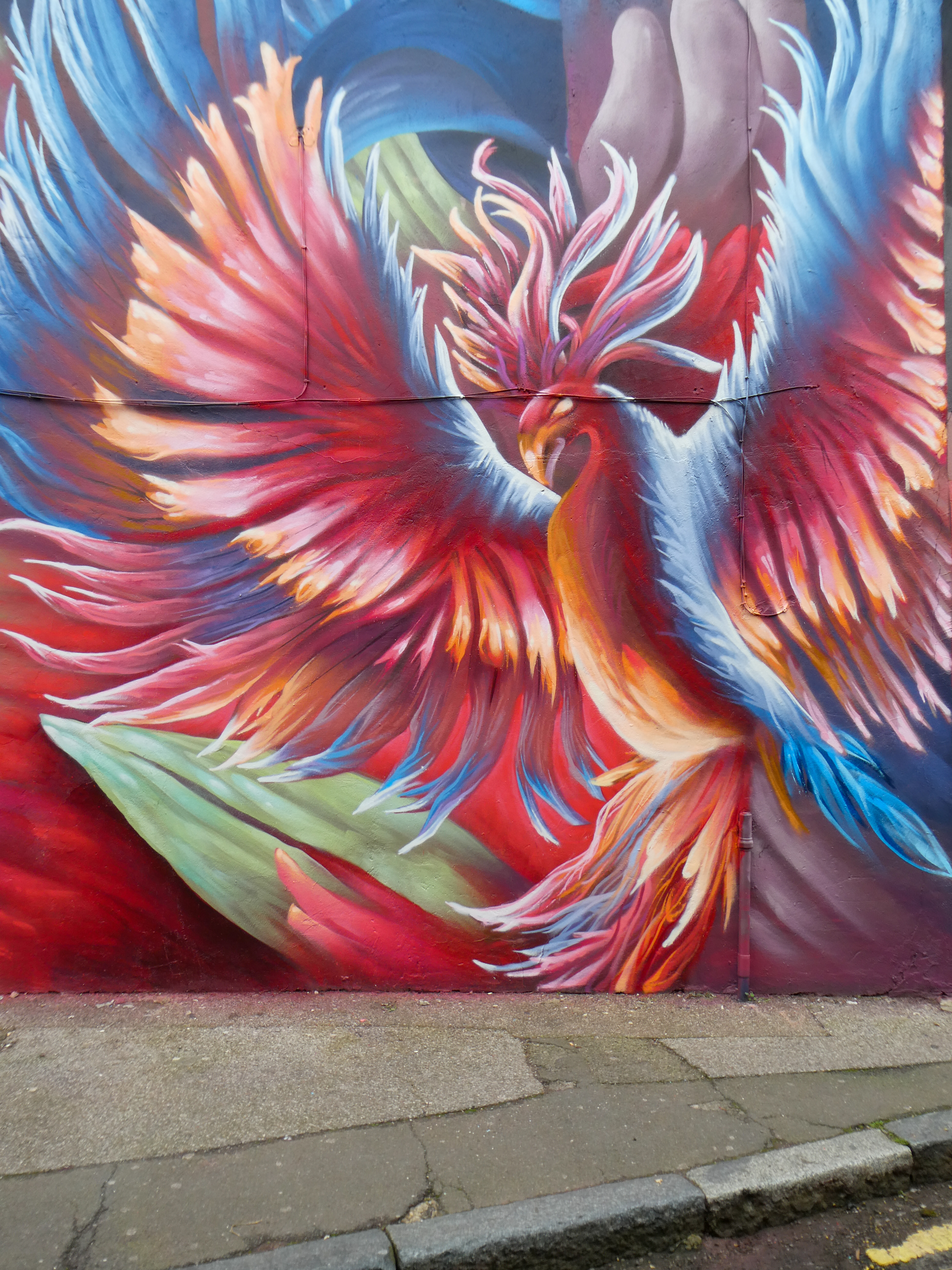 Work in Southey Street, at the heart of Penge’s High Street. This striking artwork featuring a series of flowers and a Phoenix in flight which is so full of life truly commands your attention upon passing it.
