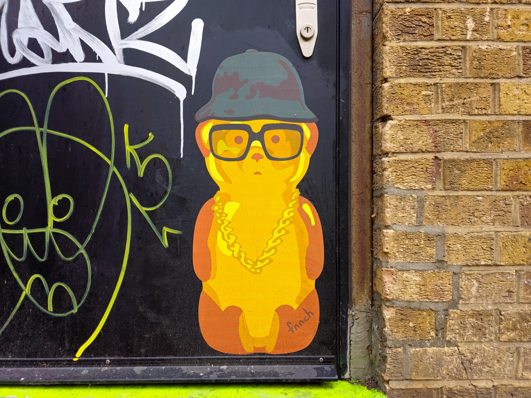 Over the summer London received a visit from American street artist Fnnch, who works primarily with stencils fusing nature and Pop Art dynamics in his art. However he is most well known for his Honey Bear series that he has been consistently adding to since 2015. Whilst over Fnnch placed up a number of paste-up featuring his distinct and fun Honey Bear subject around Shoreditch and Brick Lane. We have been fortunate enough to stumble upon seven variants of the Honey Bear across several jaunts around the East End. We cannot remember exactly where some of these works were placed up, however keep your eyes peeled around Brick Lane and the wider Shoreditch area and you are sure to find one or more.