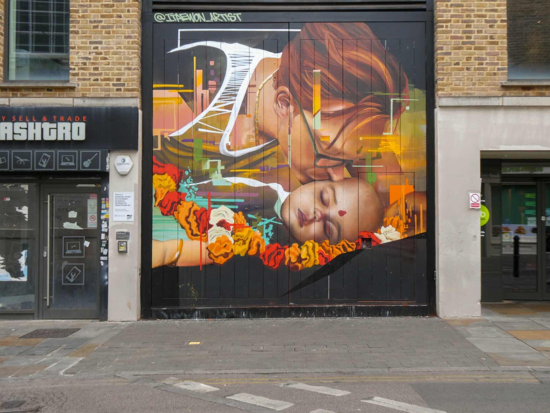 Next up in our catch up with artworks we have seen throughout 2024, we are taking a look at a pair of artworks from street artist Itaewon, both painted on the same spots in Brick Lane throughout the year. It has been a very long time since we saw anything from this artist on the streets of London, and in that time he has very much shifted his style and focus points, presenting two portraits of a child and with each of their respective parents. Figurative subjects like this was not something we would of previously associated with this artist, however you can still very much see the link to his former artistic output in the accompanying bold almost mechanical geometrics running around and through the portraits. The first work is no longer up and the second one can currently be seen in Brick Lane at the Whitechapel end.