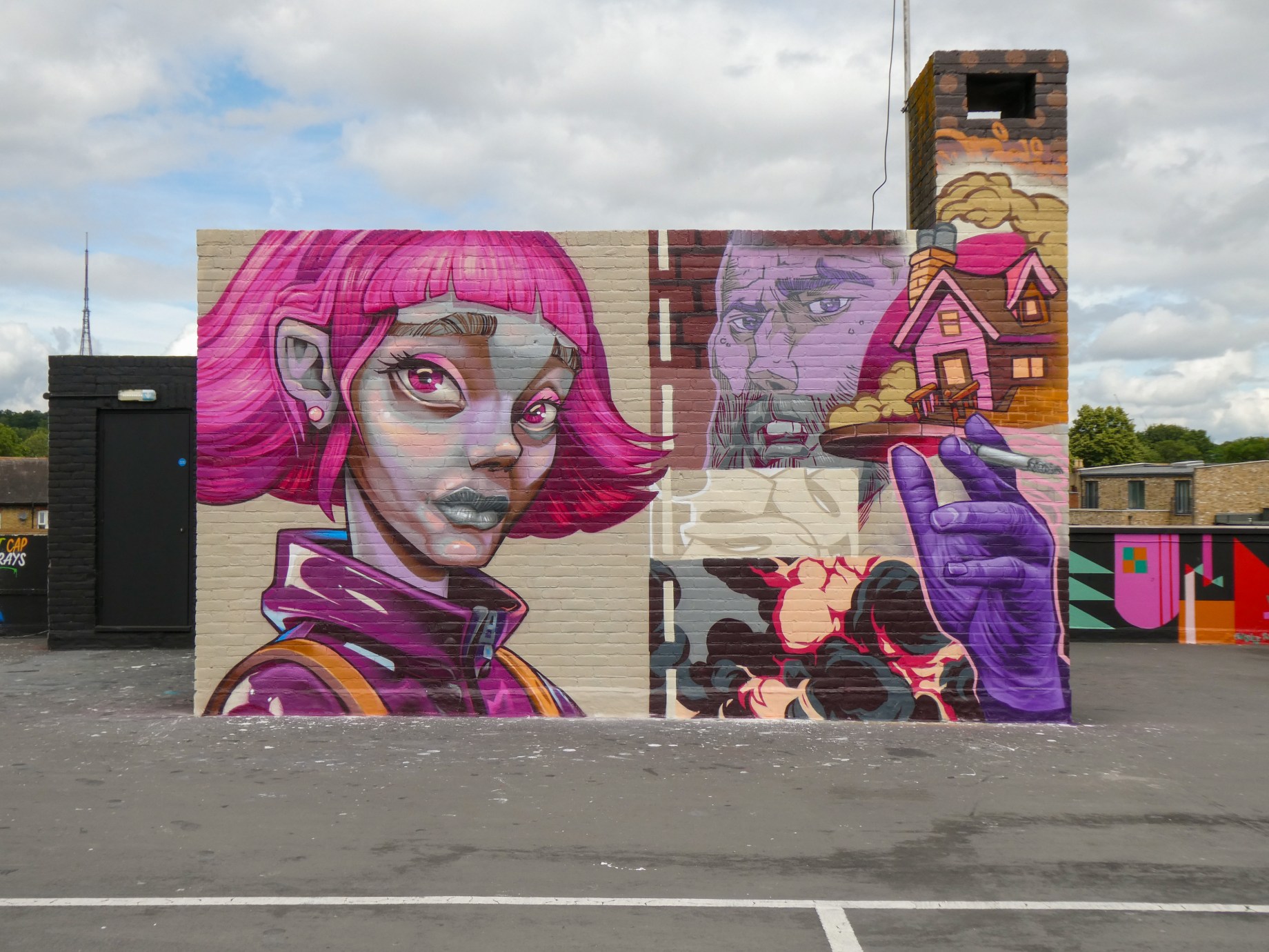 So it was quite the honour to have him come and paint a couple of excellent artworks with his immediately recognizable and distinct characters for our community project in our hometown. The first work was given a comic book layout and presents an array of characters, scenery and letter dynamics that fuse to a masterful whole and offered something so fresh and different to a space that has now seen hundreds of first rate artworks.