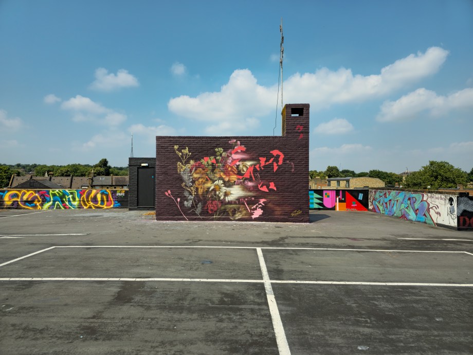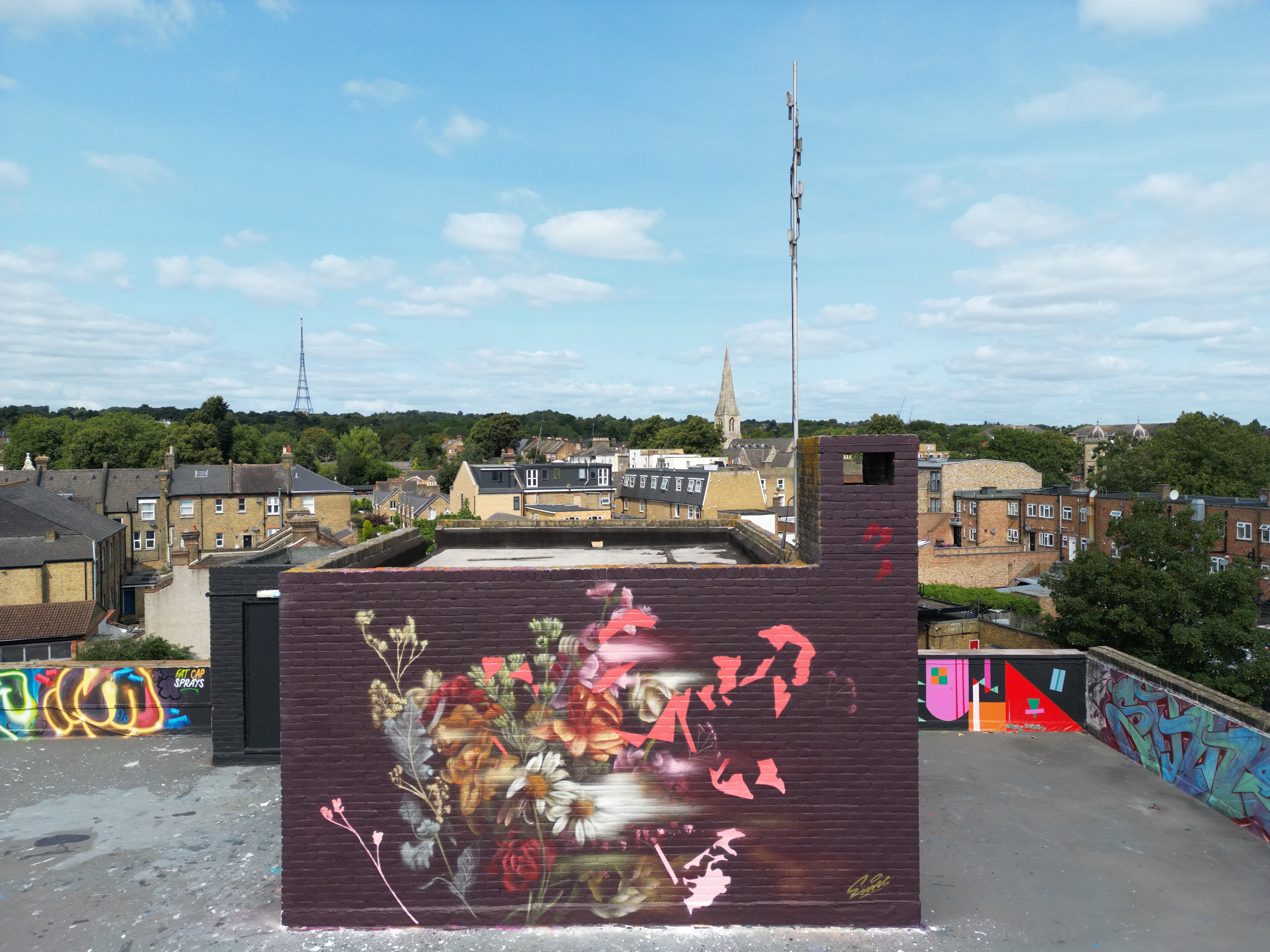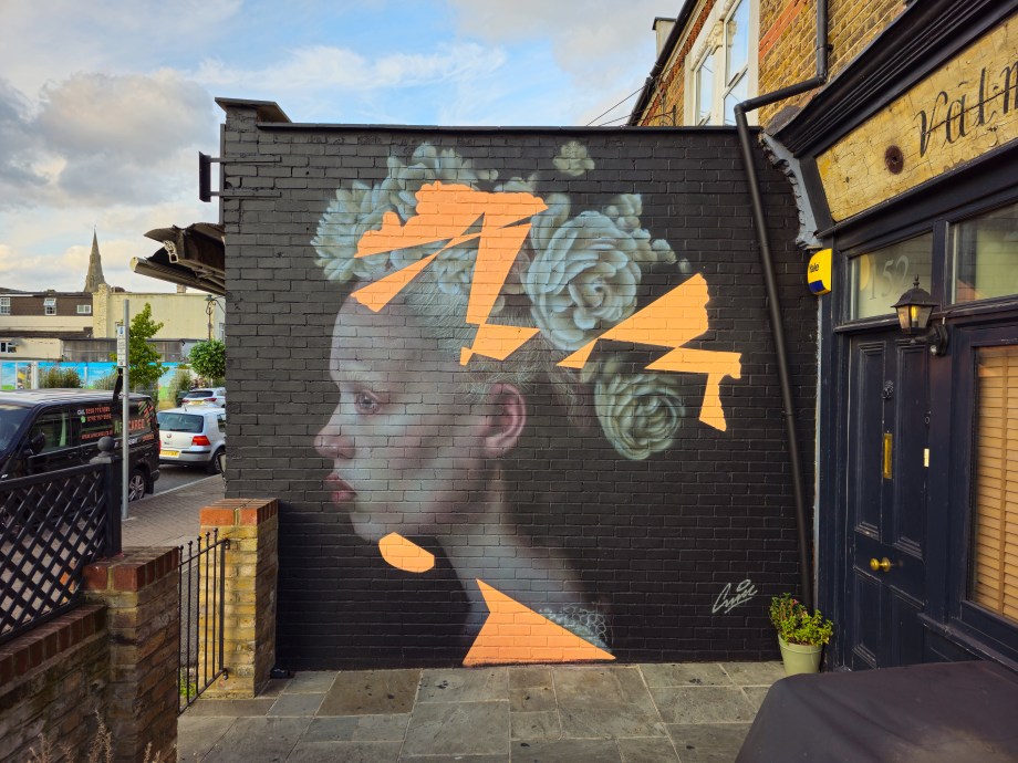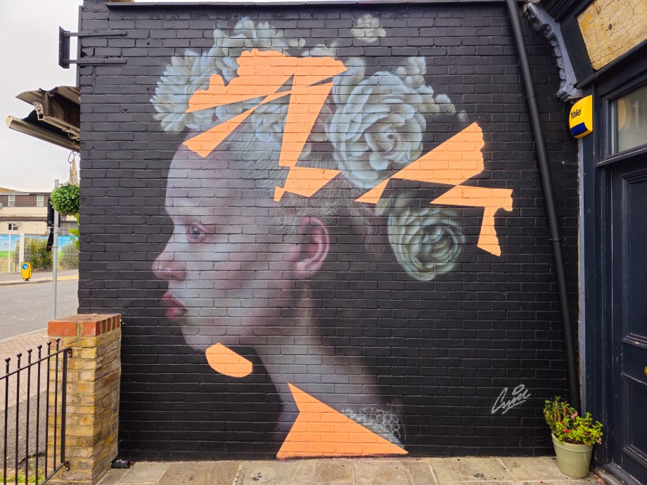 During the summer London received a visit from Belfast artist Emic who whilst over took the time to visit Penge and place up a pair of stunning works that are among the highlights of a year absolutely packed with pieces. Taking to a spot in Maple Road – which hosts the area’s biggest concentration of street art – , and to the Penge Rooftop Gallery, Emic shared a portrait and a still life scene, which both showcased not just interesting designs, but how masterful he is with a spray can. The effect in each of these captivating and striking artworks is incredible fusing incredibly delicate realism with bold and bright block geometrics, bringing classical art worthy of the Old Masters of the Renaissance period together with very modern aesthetics to excellent effect. We for one sincerely hope Emic returns to London to share his talents before too long, and even more so that it may get to be in Penge again. In the meantime we consider ourselves very privileged that this artist’s only piece in London currently is on our doorstep and we get to enjoy on a daily basis. Both of the superb pieces below were placed up with support from ourselves London Calling Blog for our SprayExhibition20 community street art project.