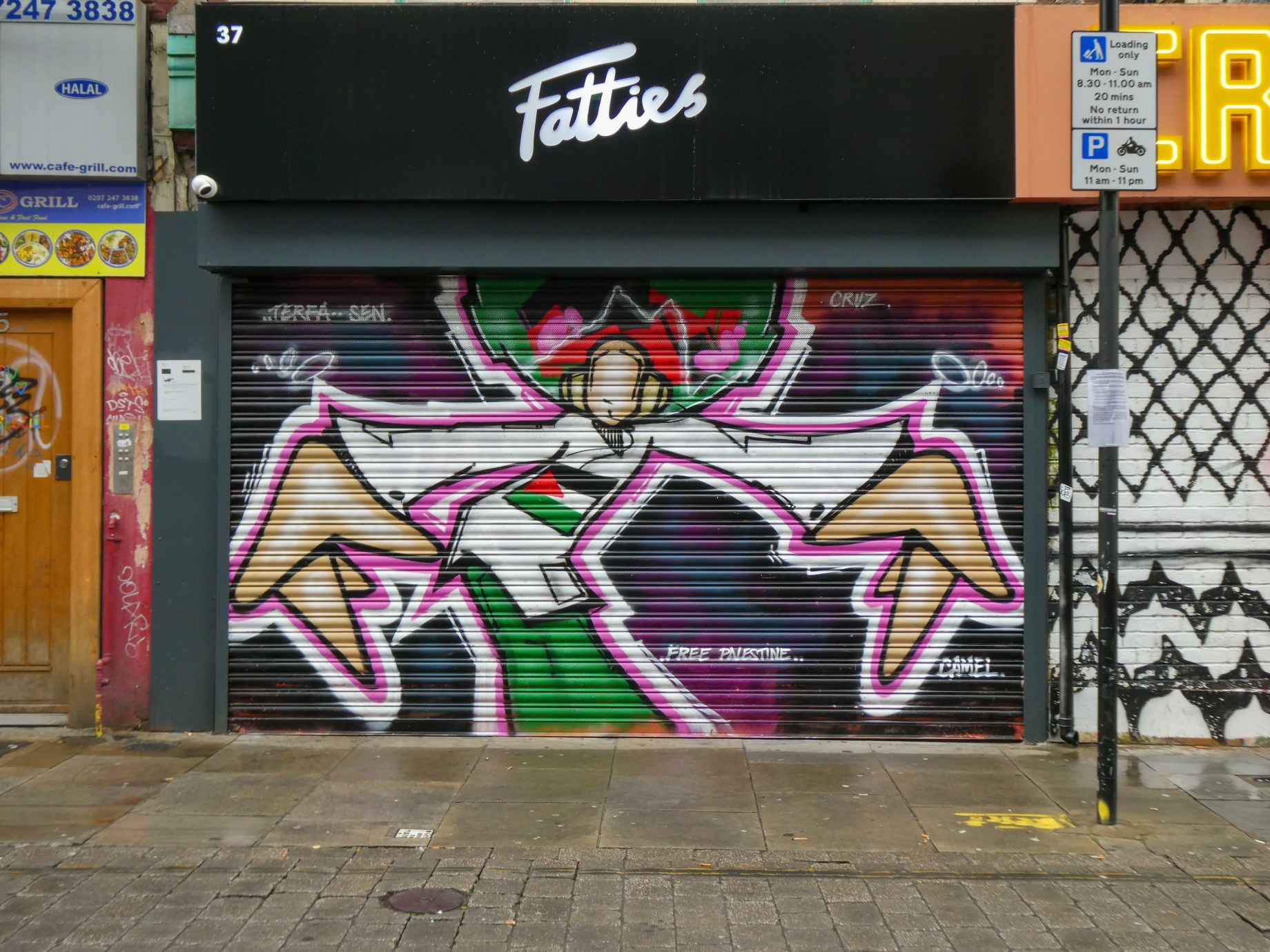 For this evening’s blog post playing catch up with what’s been painted around London during 2024, we are taking a look at a series of five pieces by graffiti legend Zomby. The works below comprise one letter piece and four of Zomby’s unmistakable characters – which are nothing short of iconic in terms of the UK’s graffiti scene. Taking to shutters and walls around the East End, Zomby’s characters are instantly recognizable and a treat to see. One additional thing we have admired about these awesome character pieces is the nod of support in the designs to Palestine.