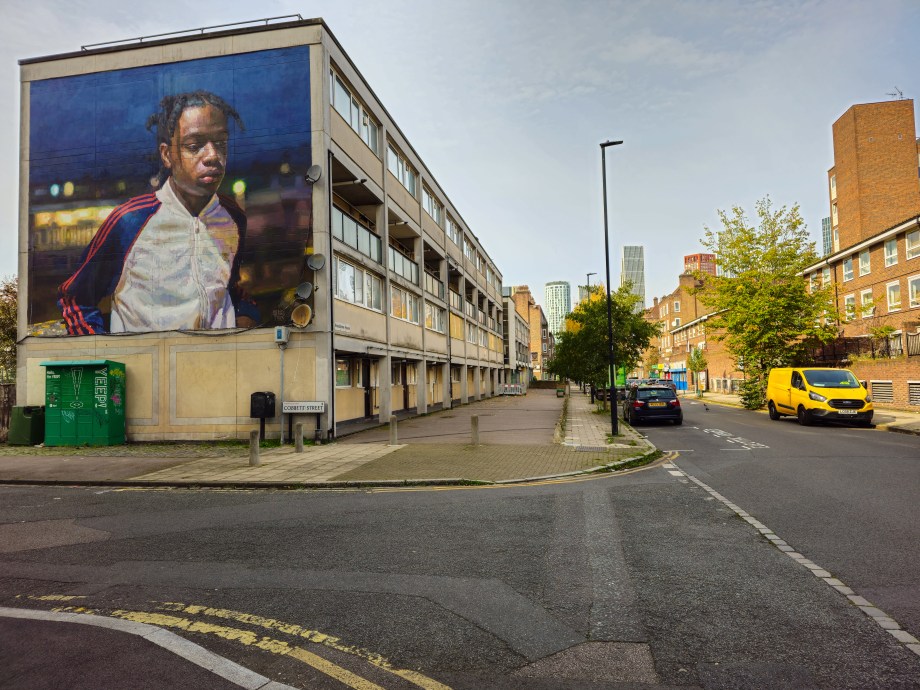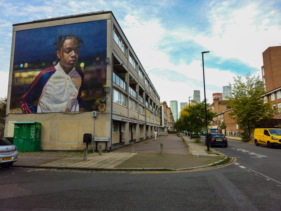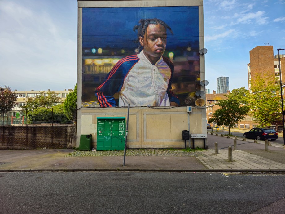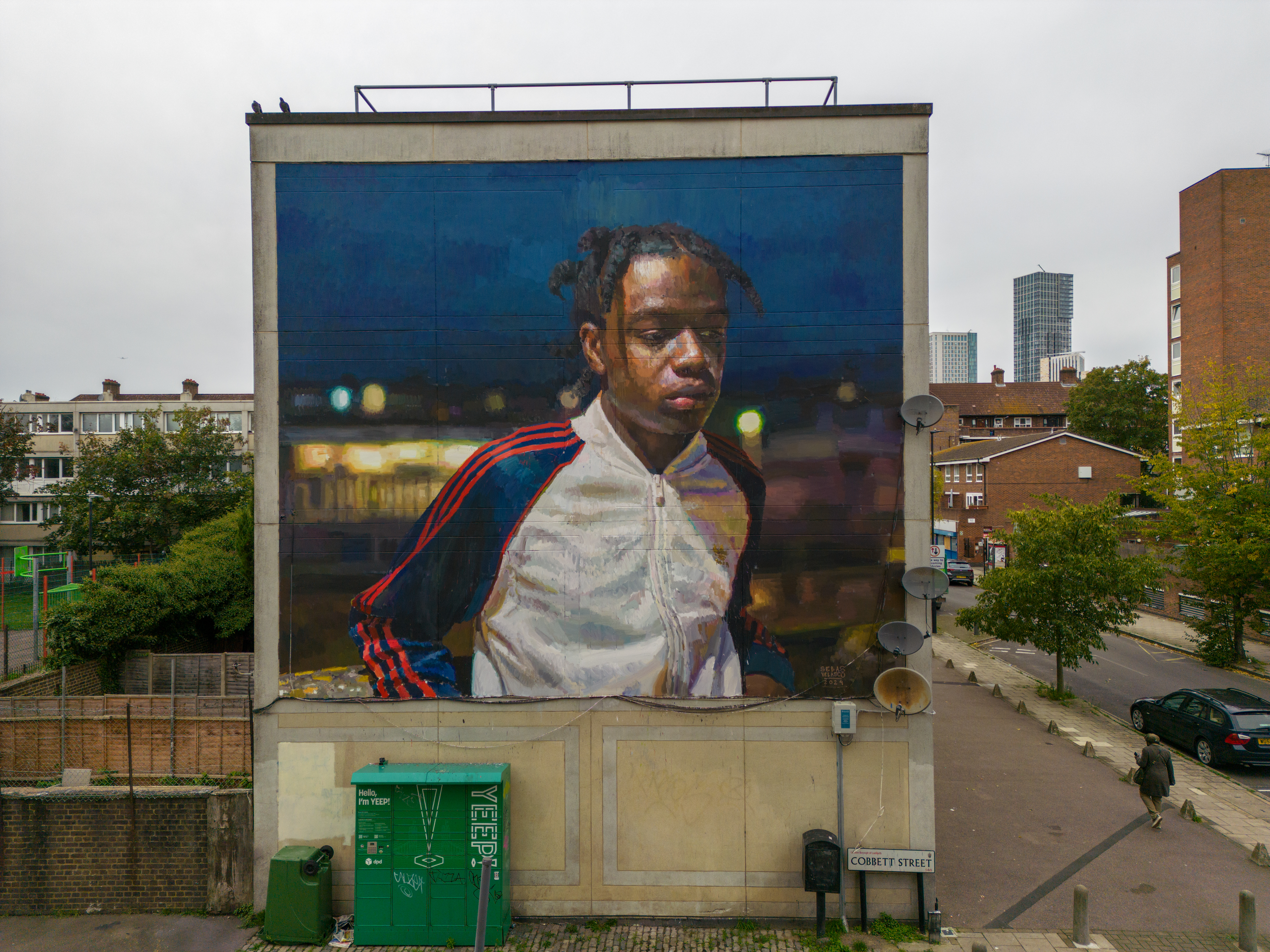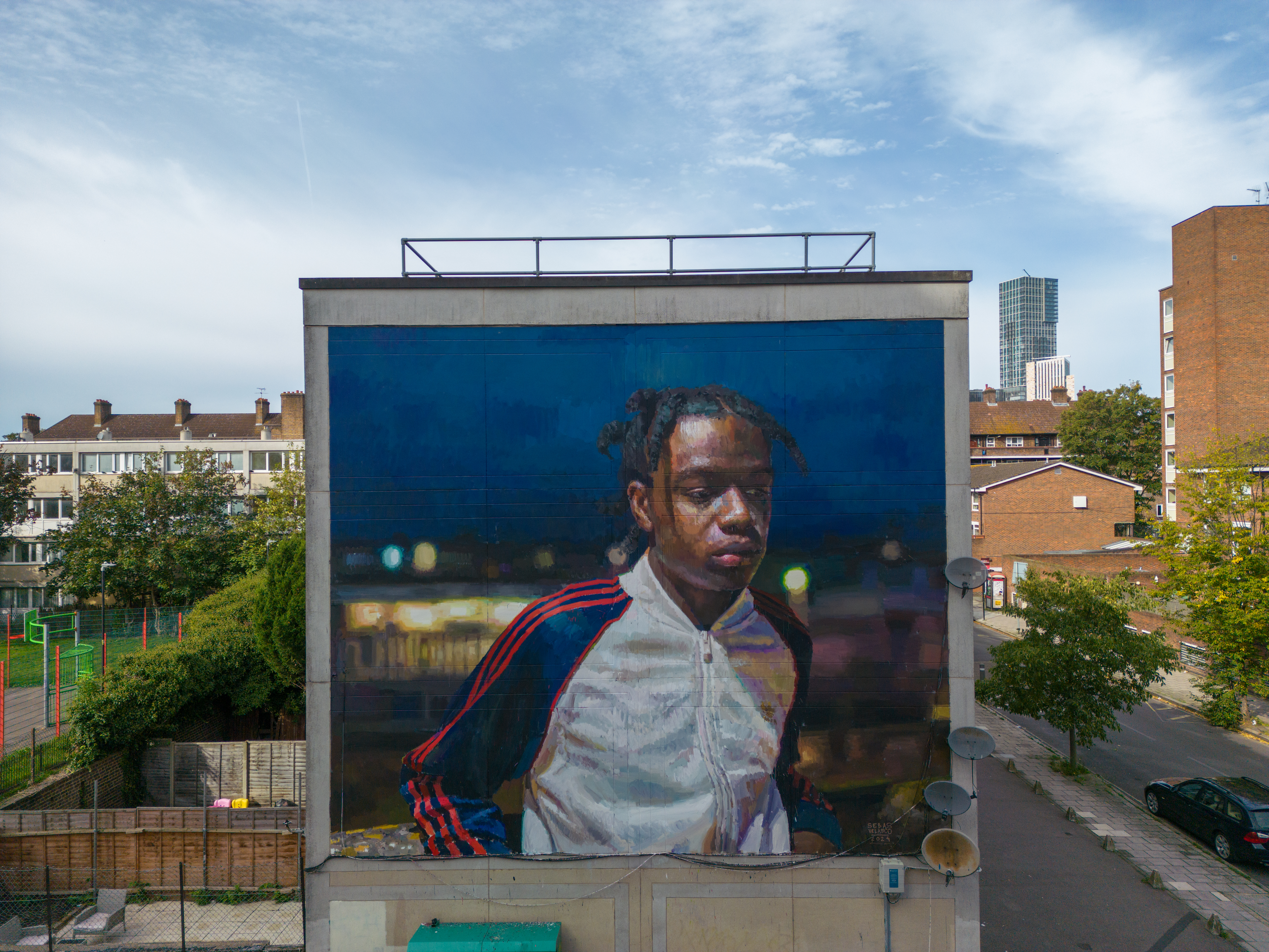 During the summer London received a visit from Spanish street artist Sebas Velasco who placed up this exceptional artwork titled ‘A Lasting Place’ in Stockwell. Certainly one of the standout pieces of the year on London’s scene. the work features a young male stood in front of Brixton’s train line at night. Through his work Sebas Velasco explores the relationship between urban life and nature through an expert understanding of light and space to align his scenes and subjects often set in a very urban landscape, such as a predilection for industrial areas and housing estates. This incredible piece can be found in Cobbett Street, Vauxhall.