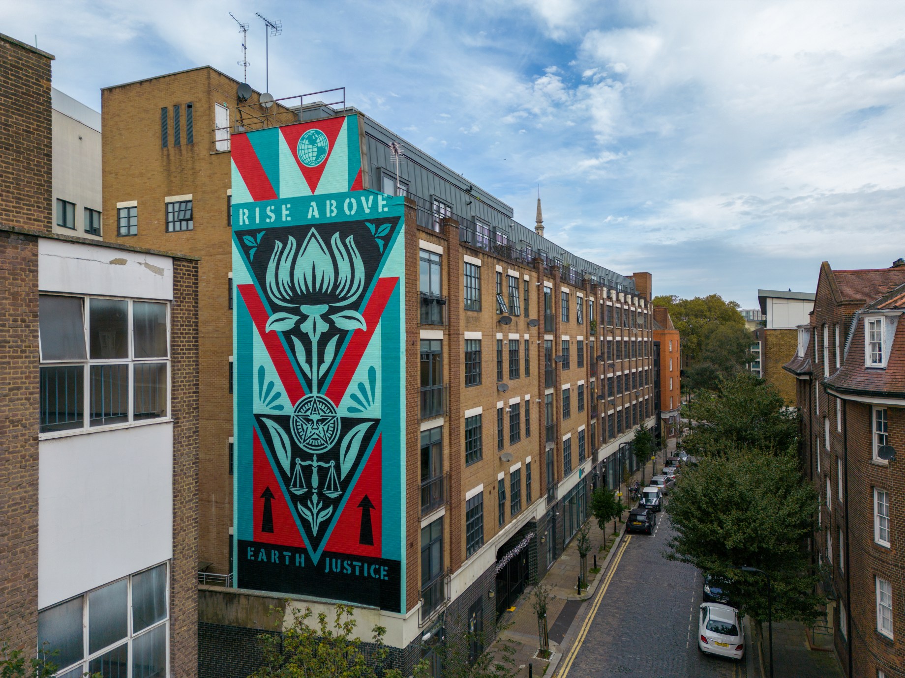 A few months back saw a visit to London from world famous American street artist Shepard Fairey who took to Shoreditch to leave his latest work for the city to enjoy. Titled ‘Rise Above Earth Justice’ this piece makes for the largest work Shepard Fairey has placed up in the city over a 25 year period of placing art up here. The piece is placed up in the artist’s very distinct and instantly recognizable style, depicting a flower growing from the scales of justice to represent howit is humanity’s responsibility to rise above the injustice of environmental irresponsibility and work towards a healthier planet. This striking artwork can be found in Boundary Street, Shoreditch.