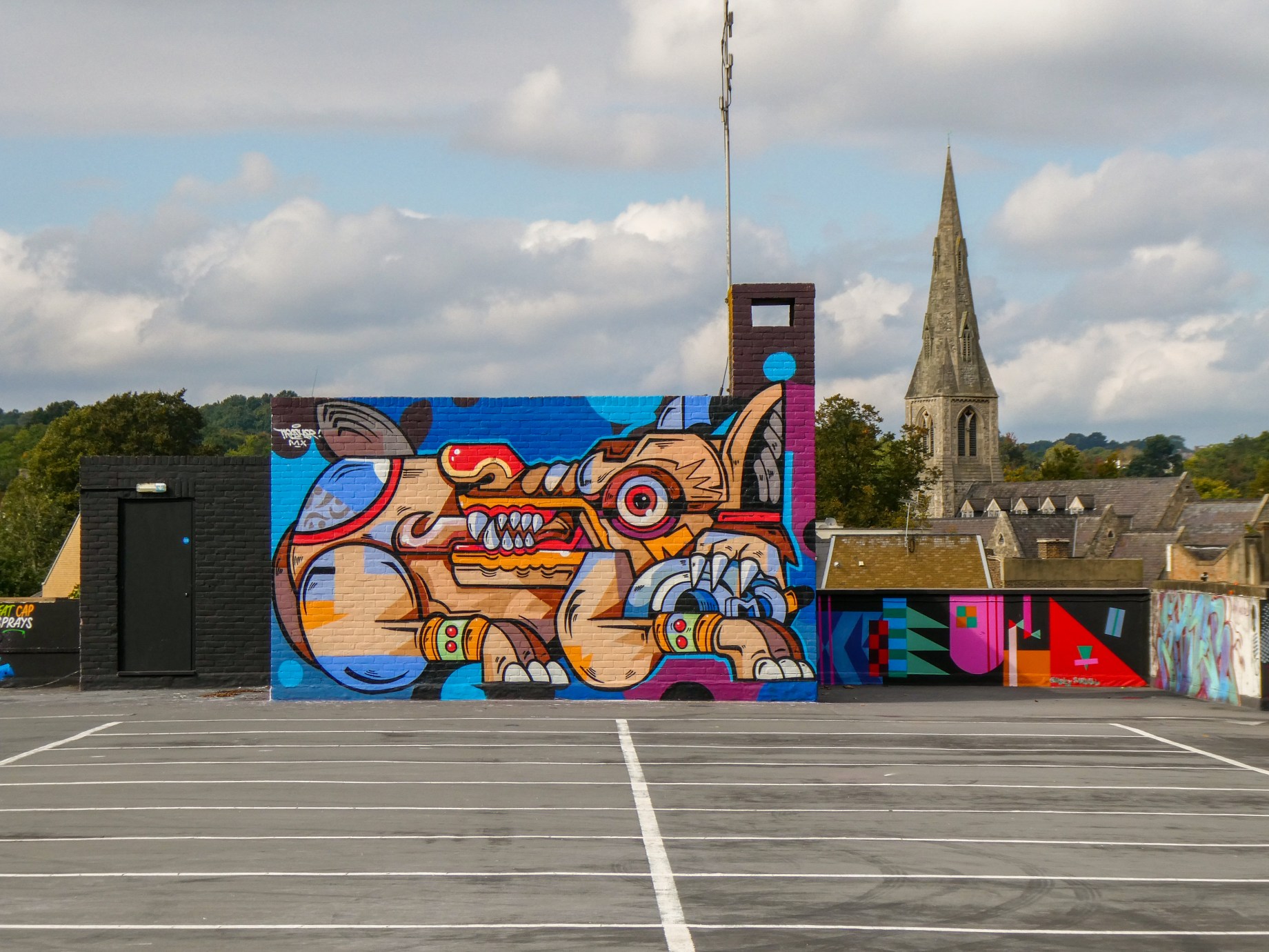 A few months back saw Mexican street artist Trasheer pass through London, following painting for the Southend City Jam Festival. Whilst on his brief visit to London, Penge was fortunate enough to host this artist and enjoy an excellent piece of art in the process. Presenting a rich illustrative scene the work is very much inspired by the artist’s Latin American cultural history, with the canine subject filling the space perfectly. Hopefully we will see this artist come and paint in London again, but for now we are grateful to have had this piece go up in our hometown. The striking work below was placed up at the Penge Rooftop Gallery, Penge, with support from ourselves London Calling Blog for our SprayExhibition20 community street art project.