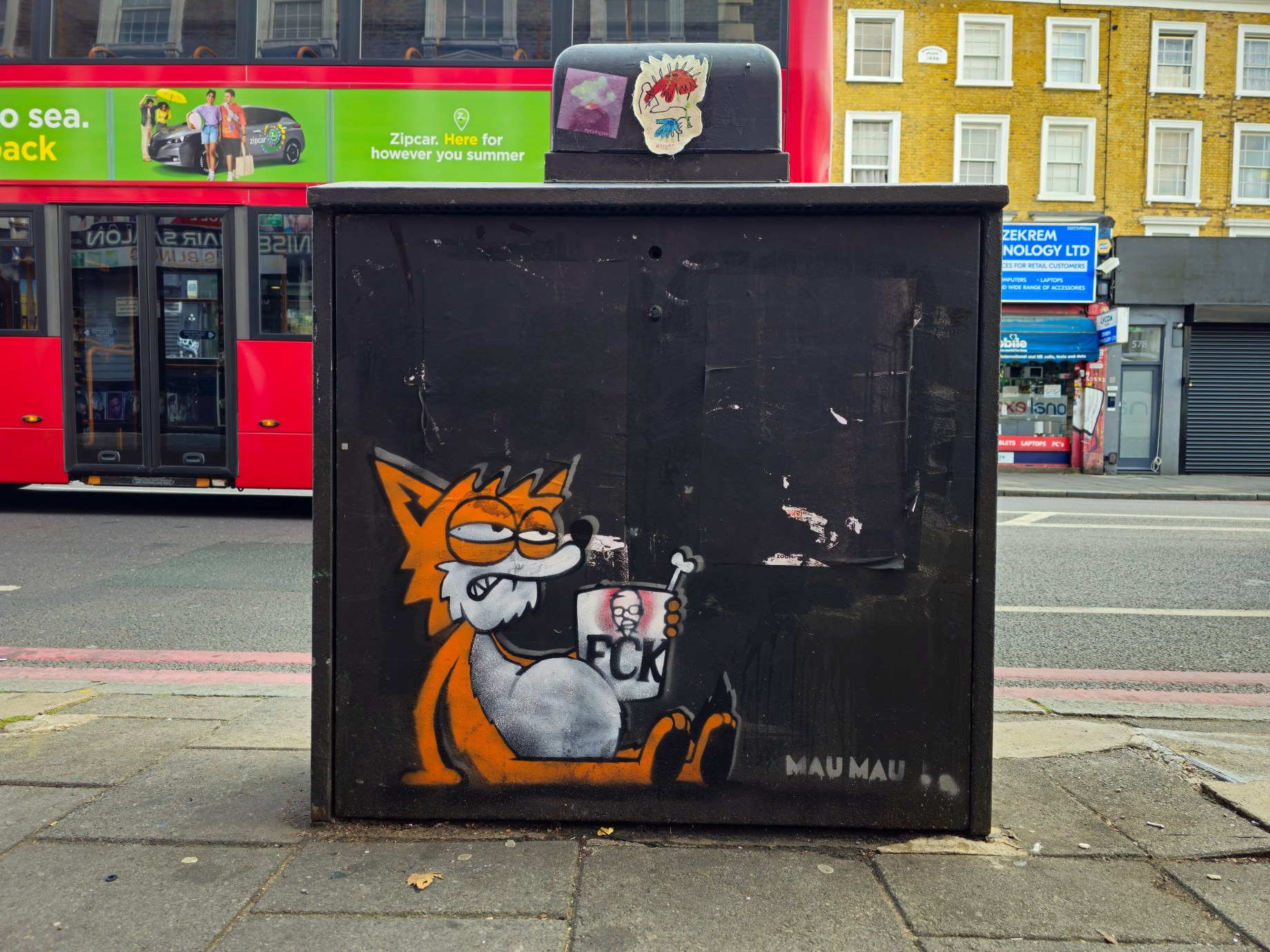 Next up we are taking a look at a series of four additions to London from Devon based artist Mau Mau that have been placed up in recent months in East and South London. Mau Mau works with a mixture of stencils and freehand works and his iconic rebellious fox character is both instantly recognizable and always certain to make you laugh with his defiant view on the world around us. The works below are generally on the smaller scale, and despite the stature, they definitely stand out when you pass them. There is also one large fox character in a fantastic collaboration with Cranio and Mighty Mo. Of the four below the work in Brixton is our favourite as it makes excellent use of the immediate environment.