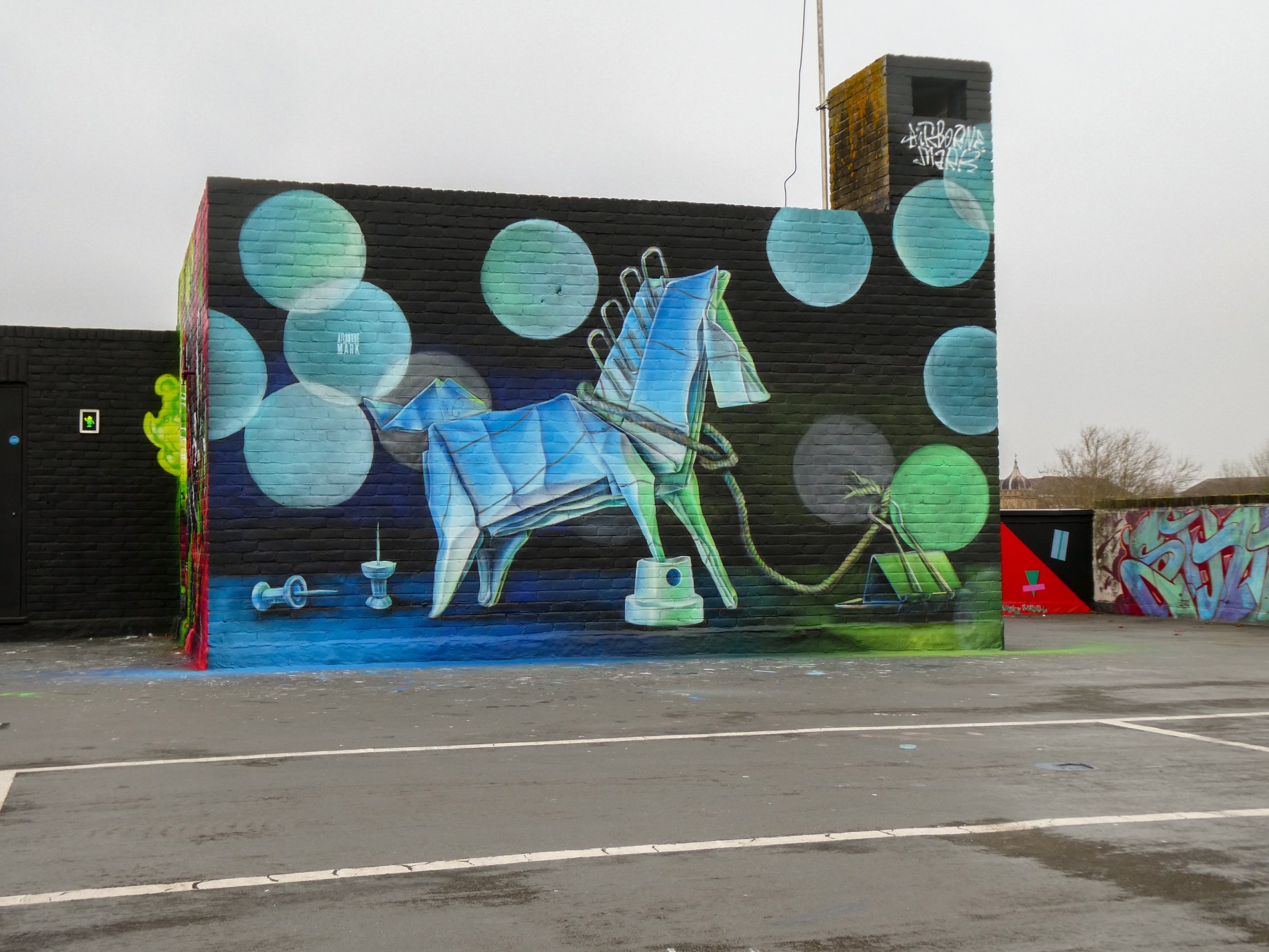 Next up we are taking a look at a series of three artworks placed up during 2024 by Polish born, but London based, street artist Airborne Mark, of which we are very fortunate that all three pieces he painted this year are in our corner of the world. Airborne Mark’s key focus in his art is origami, allowing him the chance to work his case studies in light and shadow through his favoured paper platforms. Of which he folds virtually all of his own reference models before photographing them in dramatic lighting and then ultimately painting them. Airborne Mark really is a one man production line. This year Airborne Mark has continued the motif of incorporating an additional accompaniment to his paper models, namely stationery in the form of paper clips, drawing pins, bulldog clips and string. This has made for some very interesting works that so naturally fit into the realm of paper whilst simultaneously allowing the artist to paint different structures and surfaces. Ever a pleasure to see art from this talented individual and it is normally difficult to look at a run of works from this artist and pick a favourite. Though not on this occasion, it is the horse focused piece which is nothing short of exceptional, one can see the time and effort that went into this piece. The works below were each placed up at the Penge Rooftop Gallery with support from London Calling Blog.
