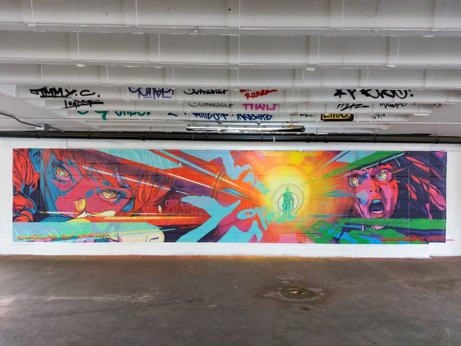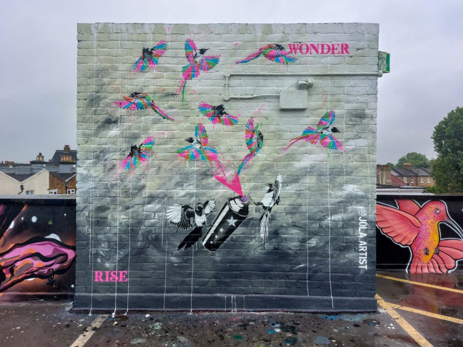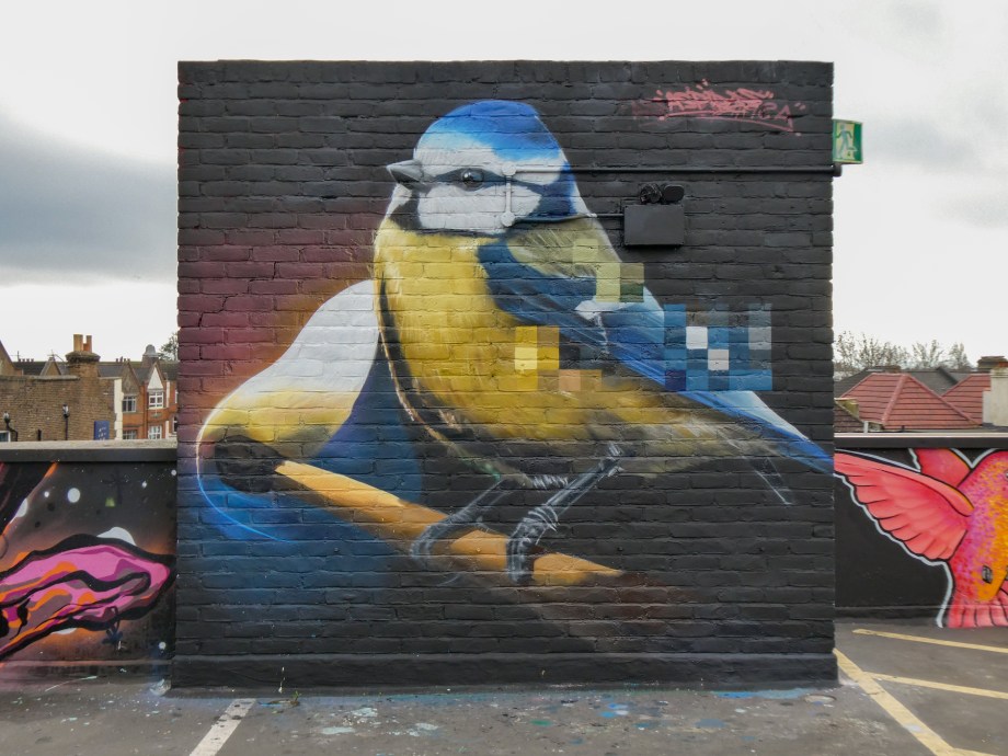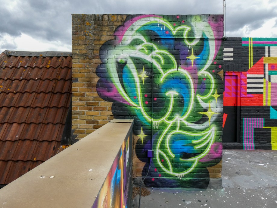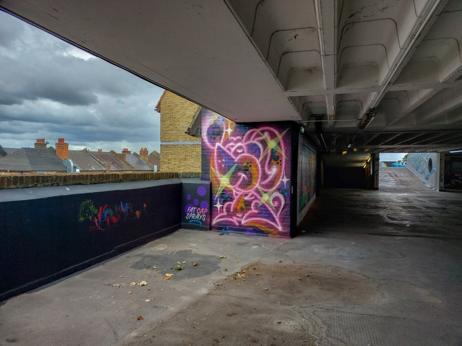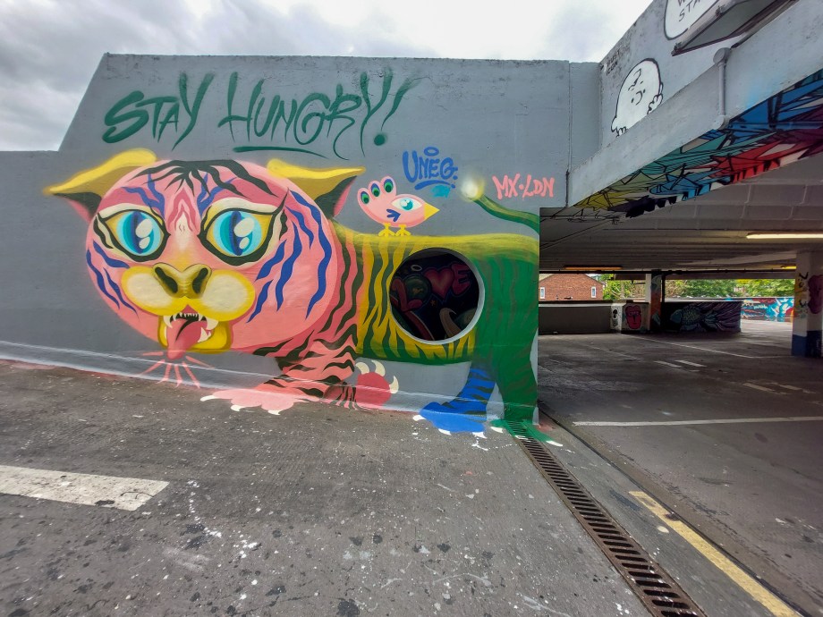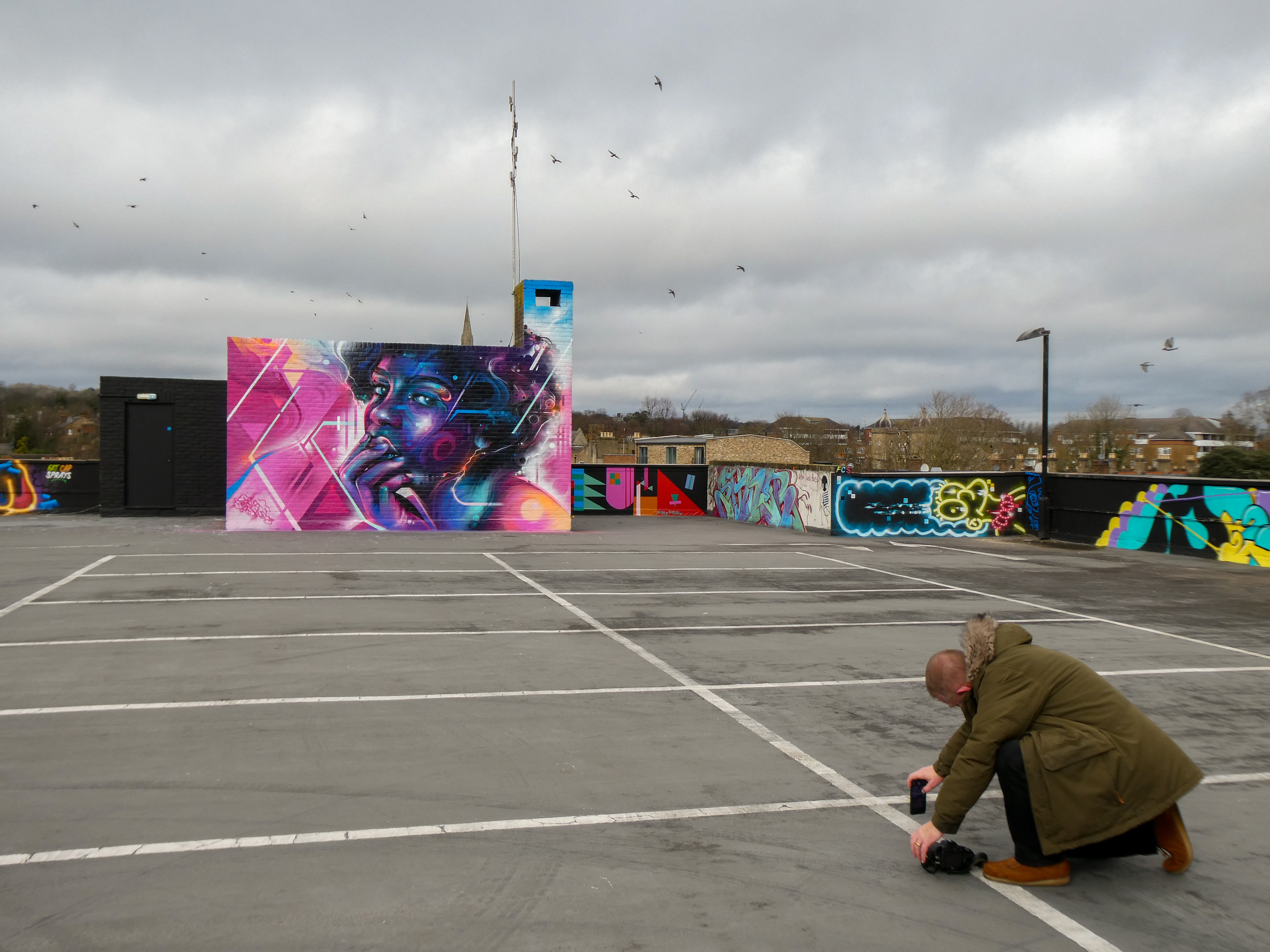 Over the last 34 months we have had the exceptional pleasure to work with the new owners and developers of the Blenheim Centre in the heart of Penge High Street, namely Clarion Housing – who we have worked with previously on a cluster of 20 spots within St Hugh’s Estate, Anerley since 2019 – and Hadley Property Group who are running the development of this location with a mind to utilize underused spaces on the top 3 floors of the multi-story car park to create the Penge Rooftop Gallery. We have facilitated a further 209 artworks in 2024, making for a total of 888 artworks placed up at the space to date, created by local street artists and graffiti writers that live in SE20 and surrounding towns, as well creatives from London, the wider UK and from as far a field as Scotland, Ireland, the Canary Islands, Spain, Greece, Malta, France, The Netherlands, Germany, Austria, Denmark, Sweden, Poland, Ukraine, Georgia, Kosovo, the United States, Hawaii, Canada, Lebanon, Palestine, Dubai, Colombia, Mexico, Brazil, Japan, Australia and South Africa.