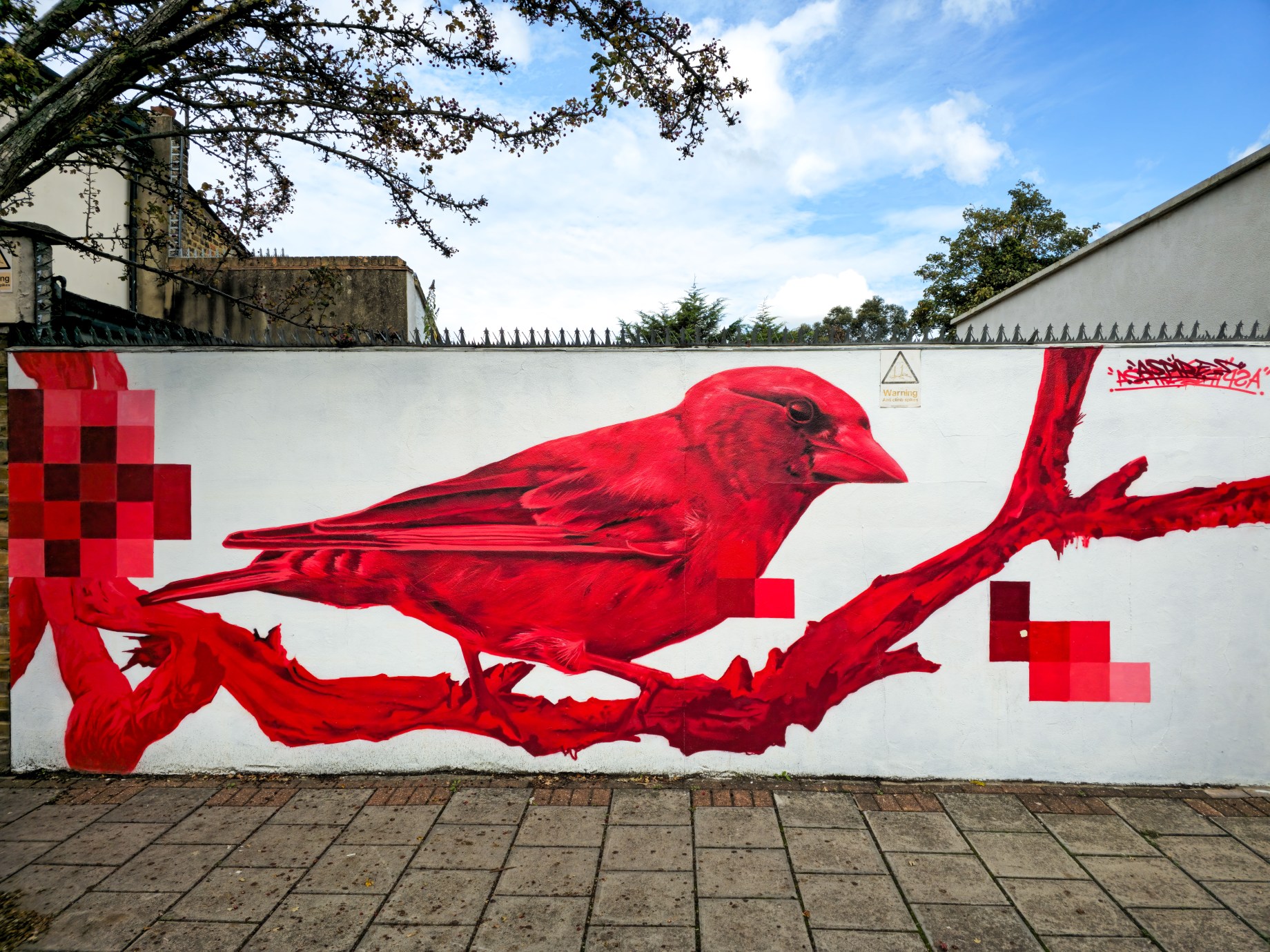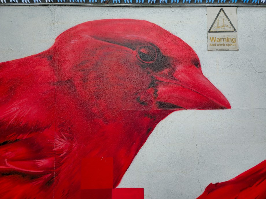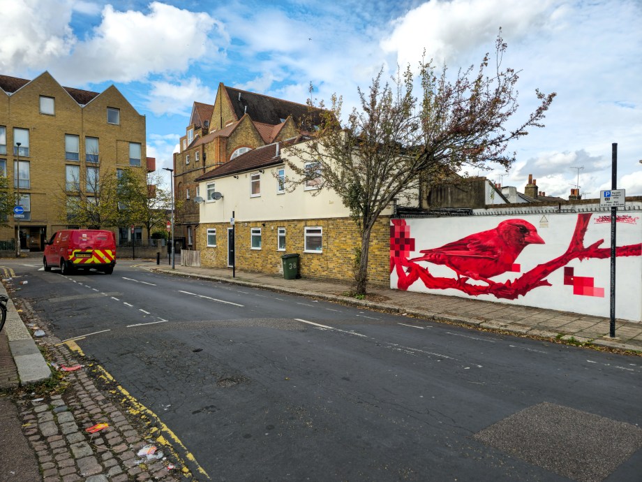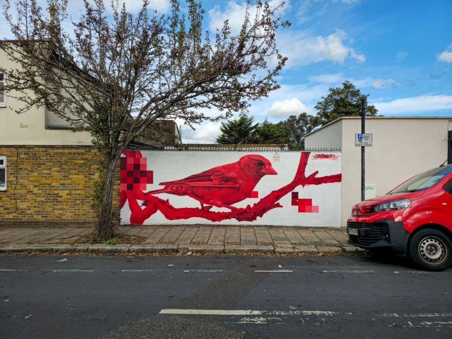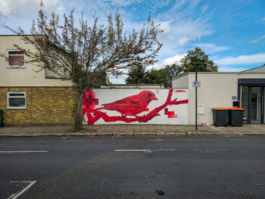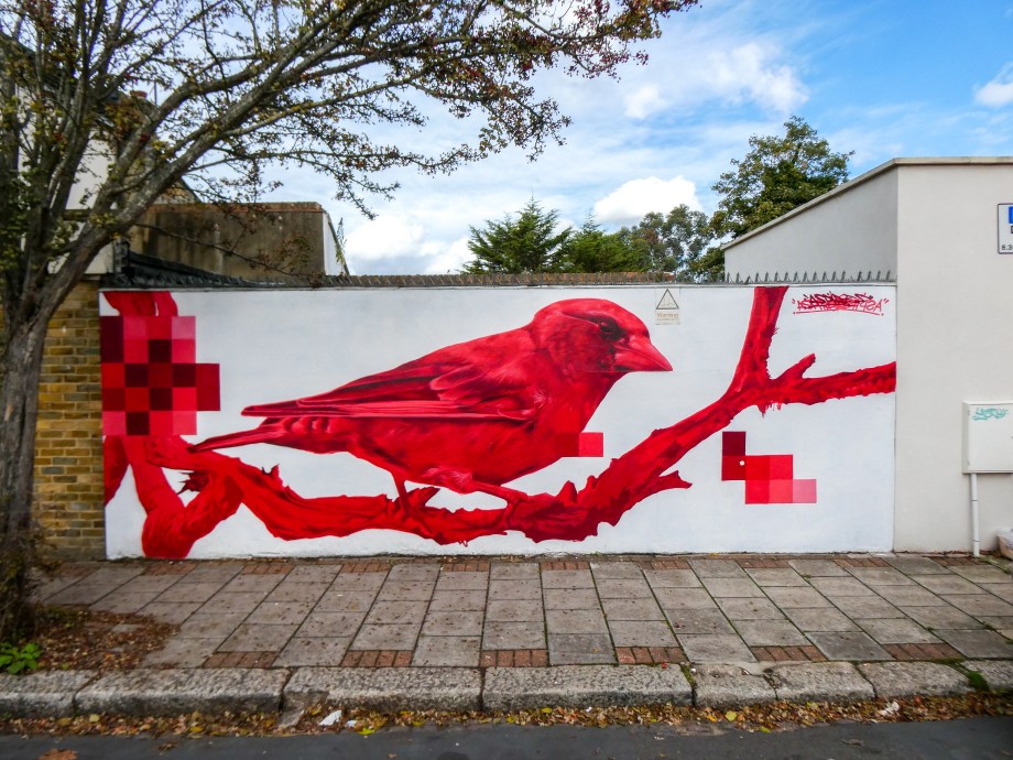Next up we are taking a look at a fantastic piece placed up in February this year from street artist Aspire in an area of London which isn’t particularly well known for its urban art, but for that reason it makes it all the more exciting that it exists, and also to have got to witness it. One thing we love about Aspire’s output is how they can take his prevalent avian subjects and paint them in so many different styles and compositions. In this case we have a striking red-scale depiction of a Green Finch set absolutely popping off the plain white background it inhabits. It is interesting to see Aspire work so effectively with such a minimal colour palette. This fantastic work can be found in Cambridge Row, Plumstead, and was placed up with support from Street Art Atlas.