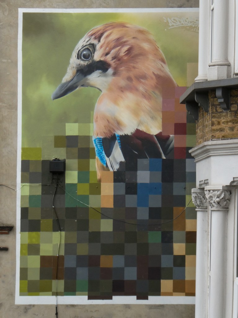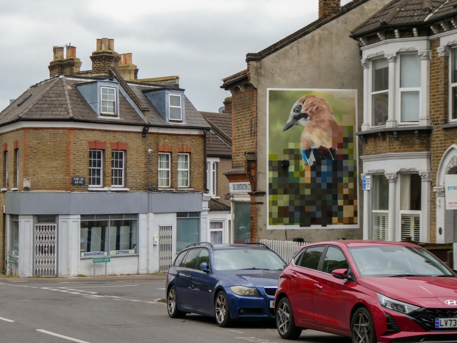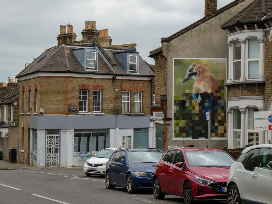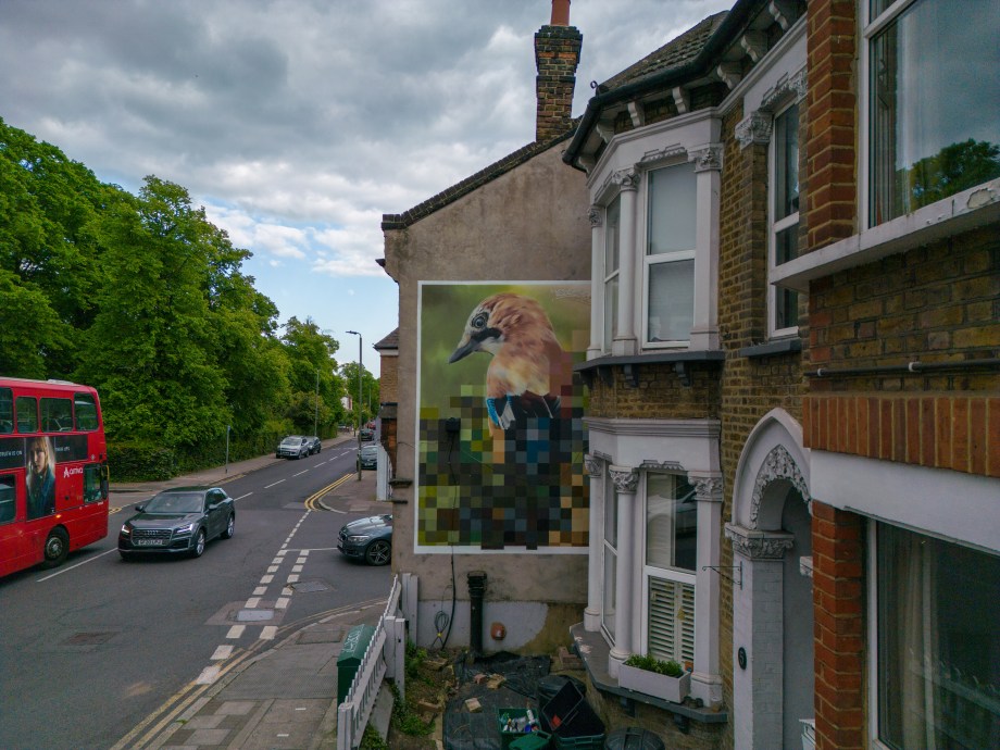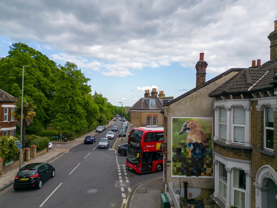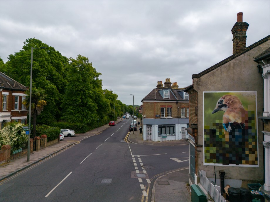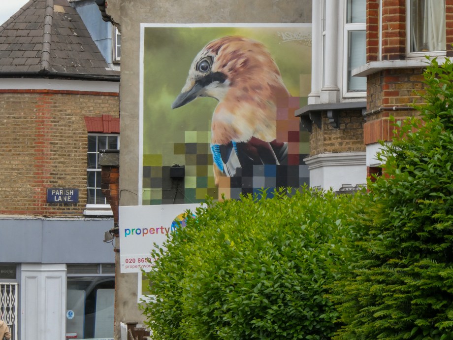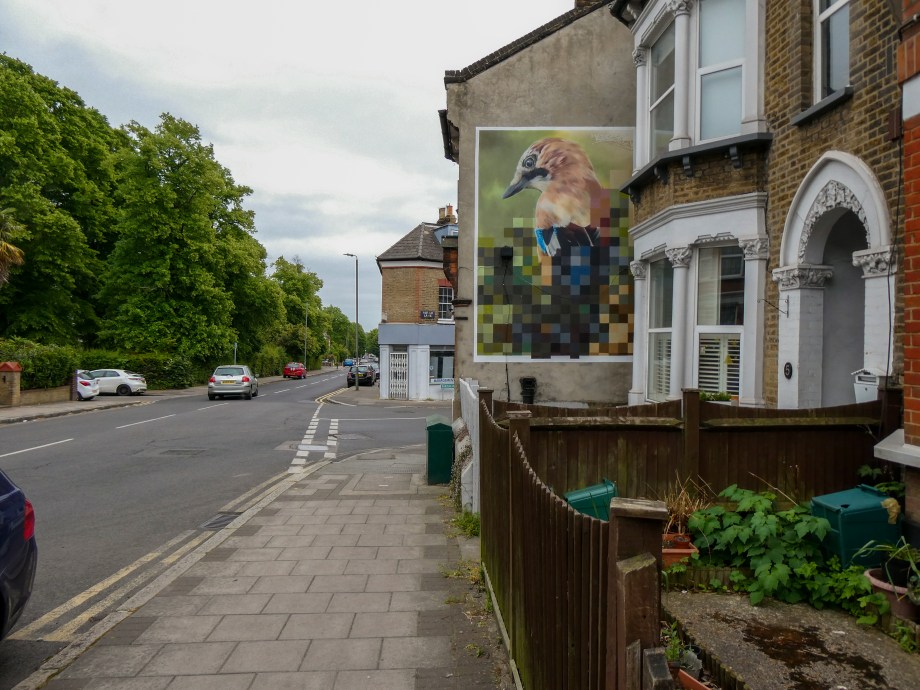 For this blog post we are taking a look a striking addition to Penge’s street art scene completed at the end of Spring by the ever prolific artist Aspire. Making excellent use of the raw render wall with this lovely calming piece featuring a Jay set in a frame to keep the raw aesthetic of the wall in the peripheral. Not only is this a lovely artwork, it is also one that is an absolute pleasure to photograph, with a number of viewing angles on offer. The striking work below was placed up in Lennard Road, Penge, with support from London Calling Blog for SprayExhibition20.