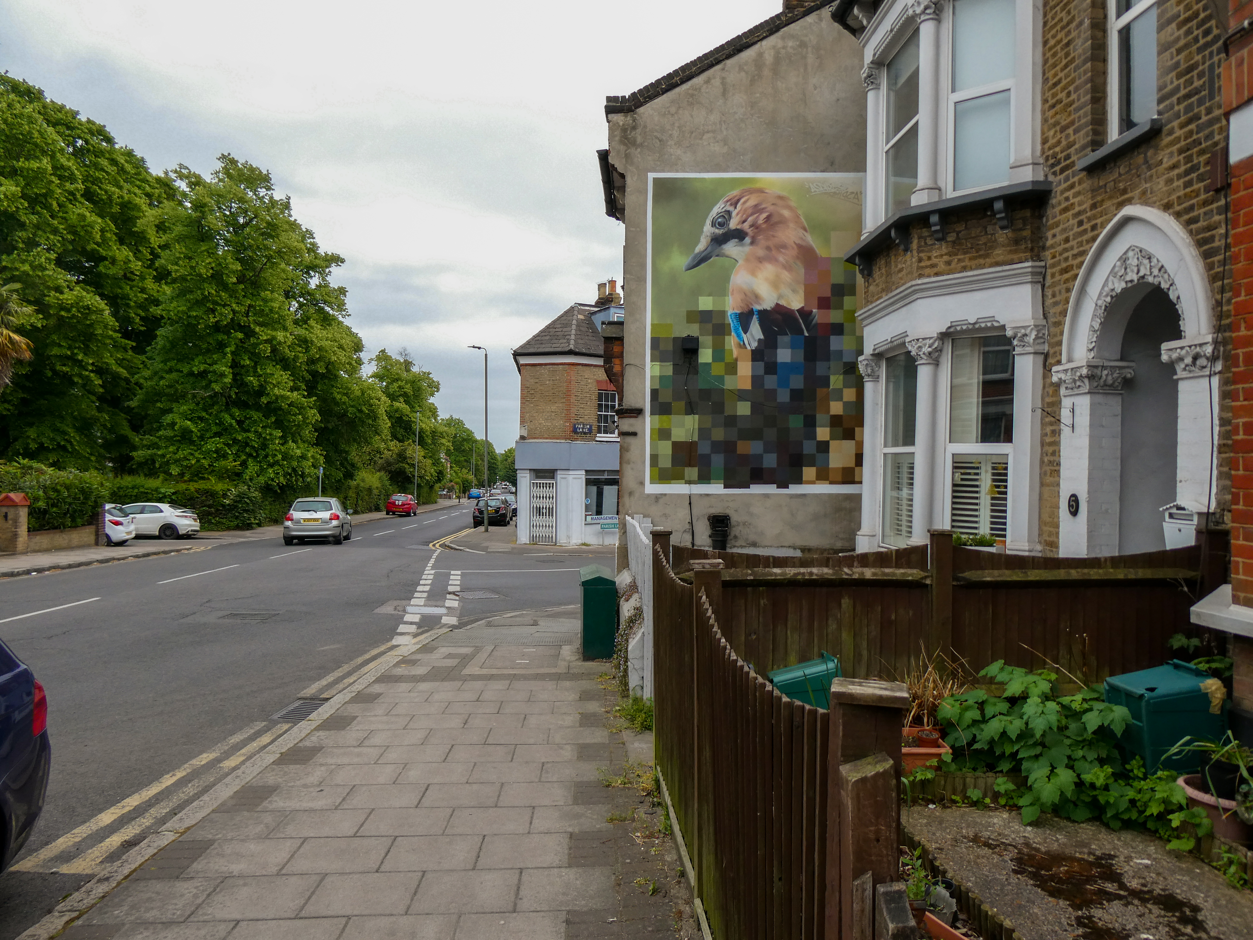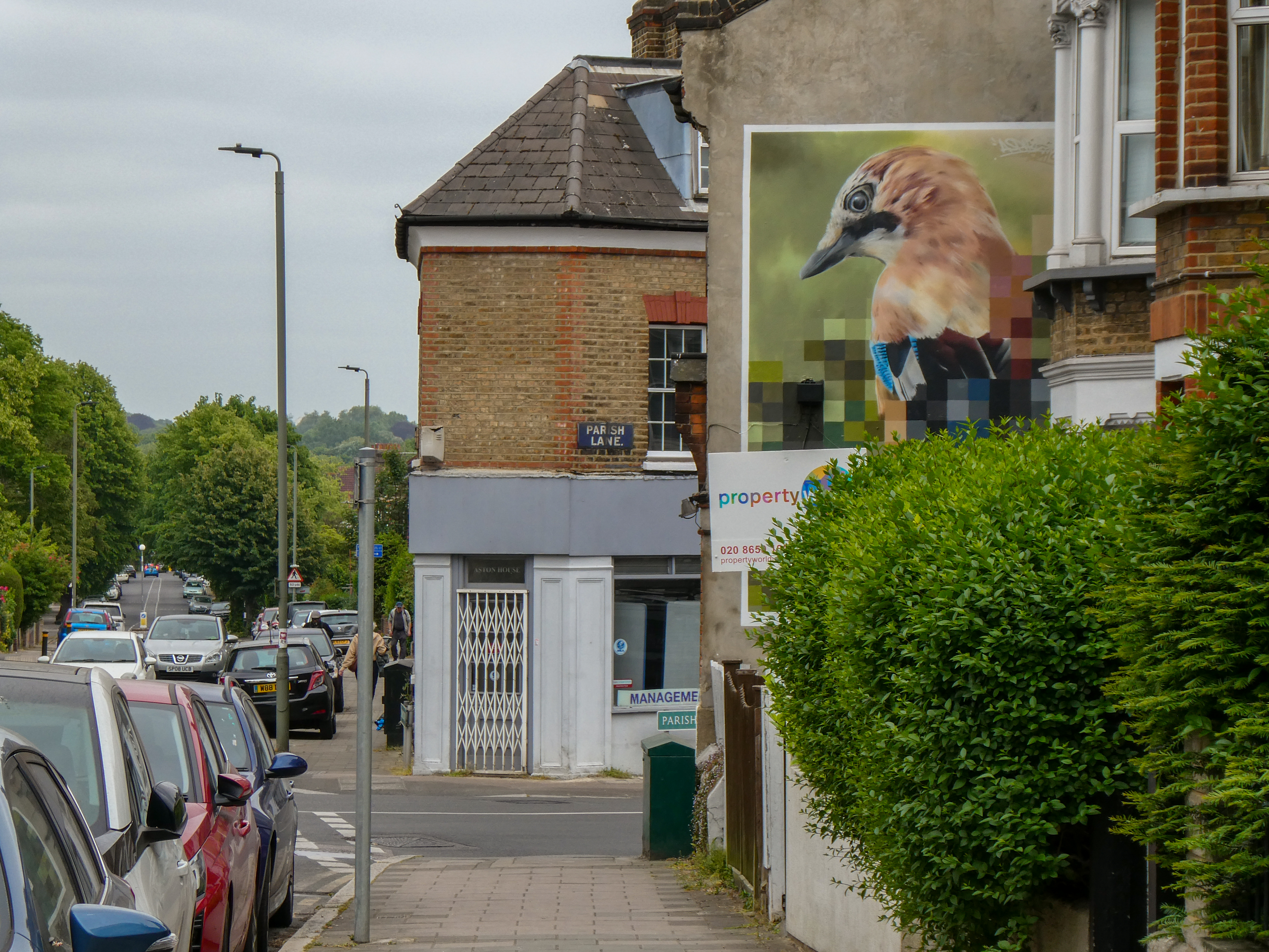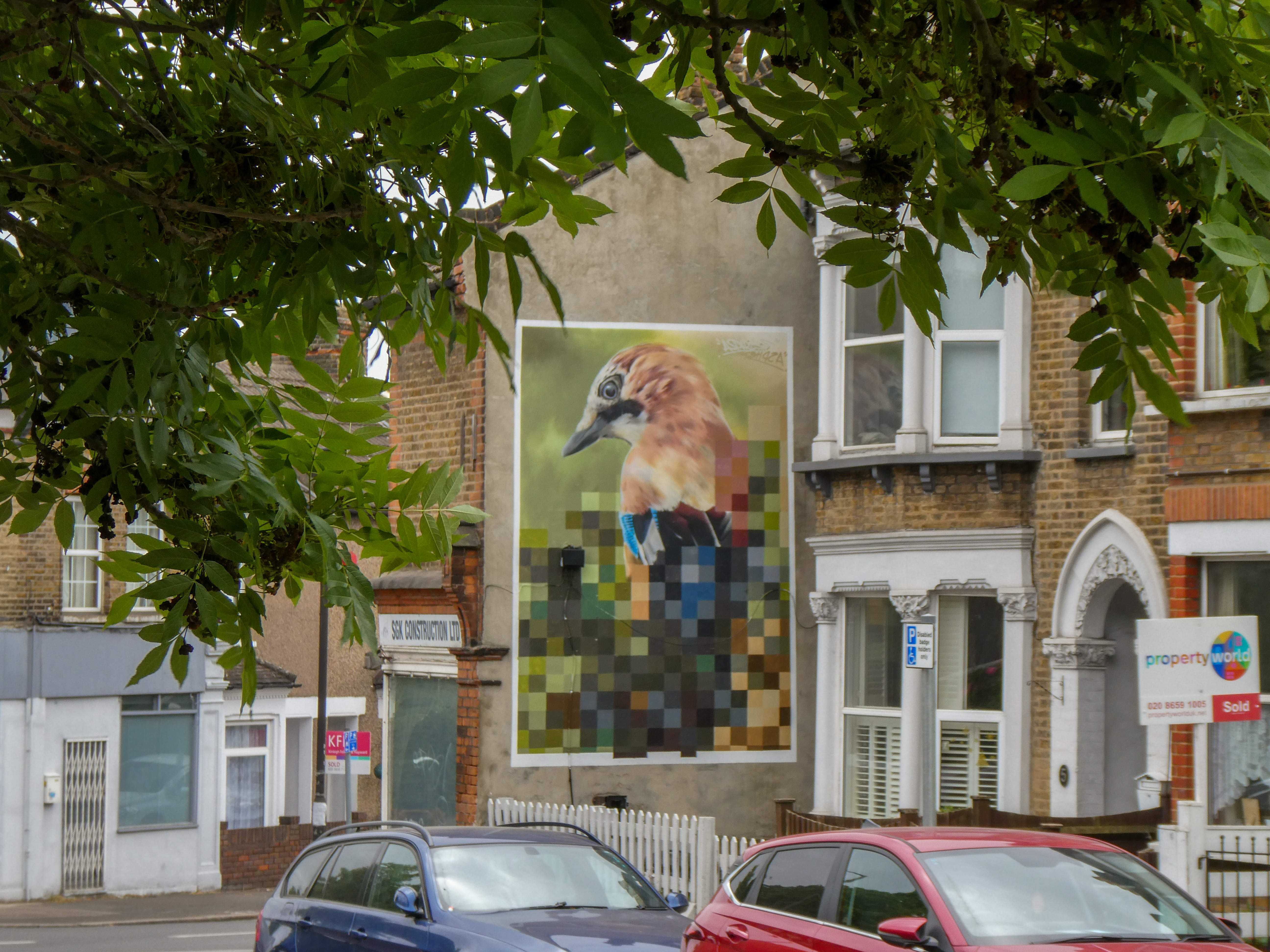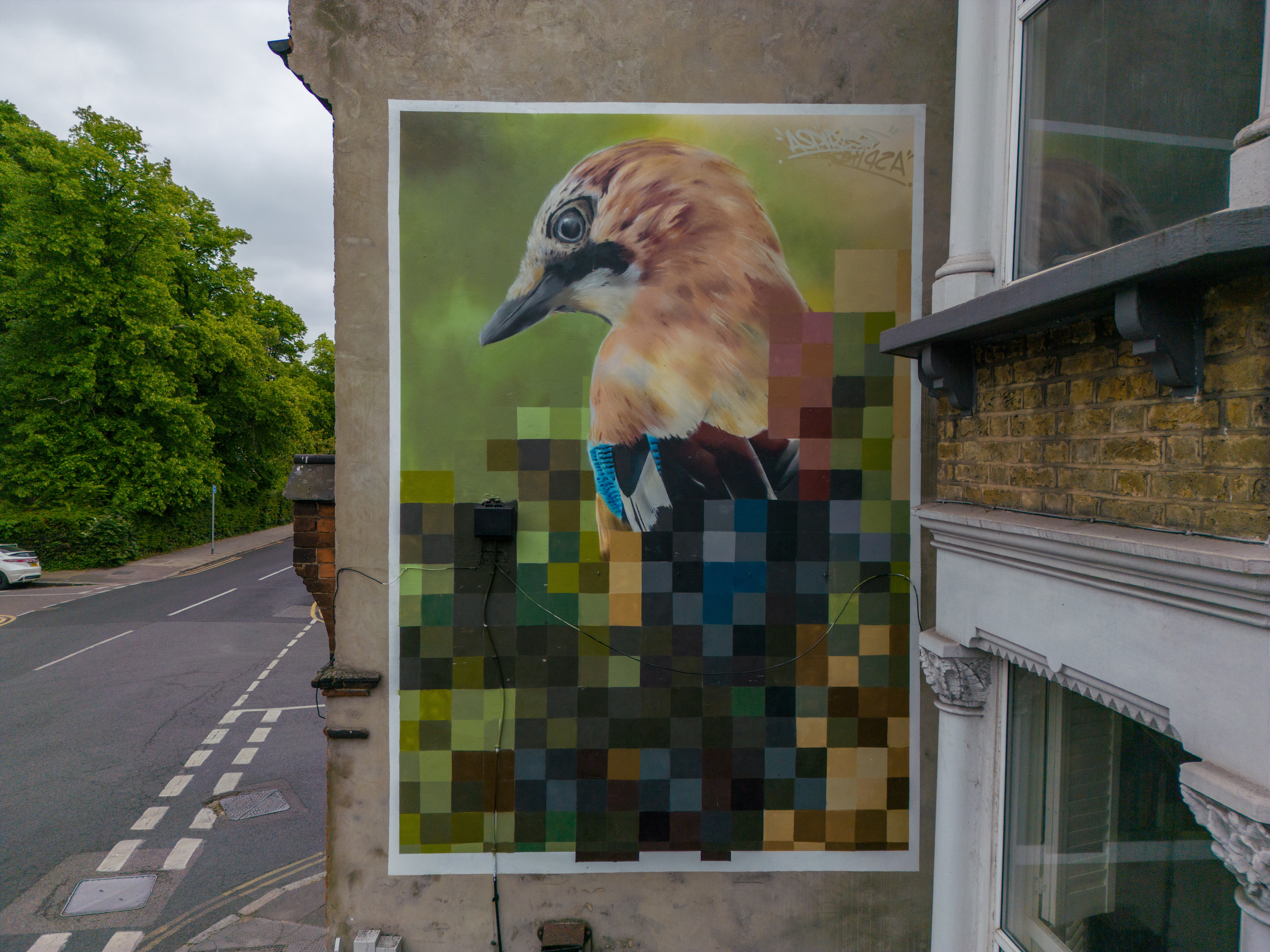 For this blog post we are taking a look a striking addition to Penge’s street art scene completed at the end of Spring by the ever prolific artist Aspire. Making excellent use of the raw render wall with this lovely calming piece featuring a Jay set in a frame to keep the raw aesthetic of the wall in the peripheral. Not only is this a lovely artwork, it is also one that is an absolute pleasure to photograph, with a number of viewing angles on offer. The striking work below was placed up in Lennard Road, Penge, with support from London Calling Blog for SprayExhibition20.