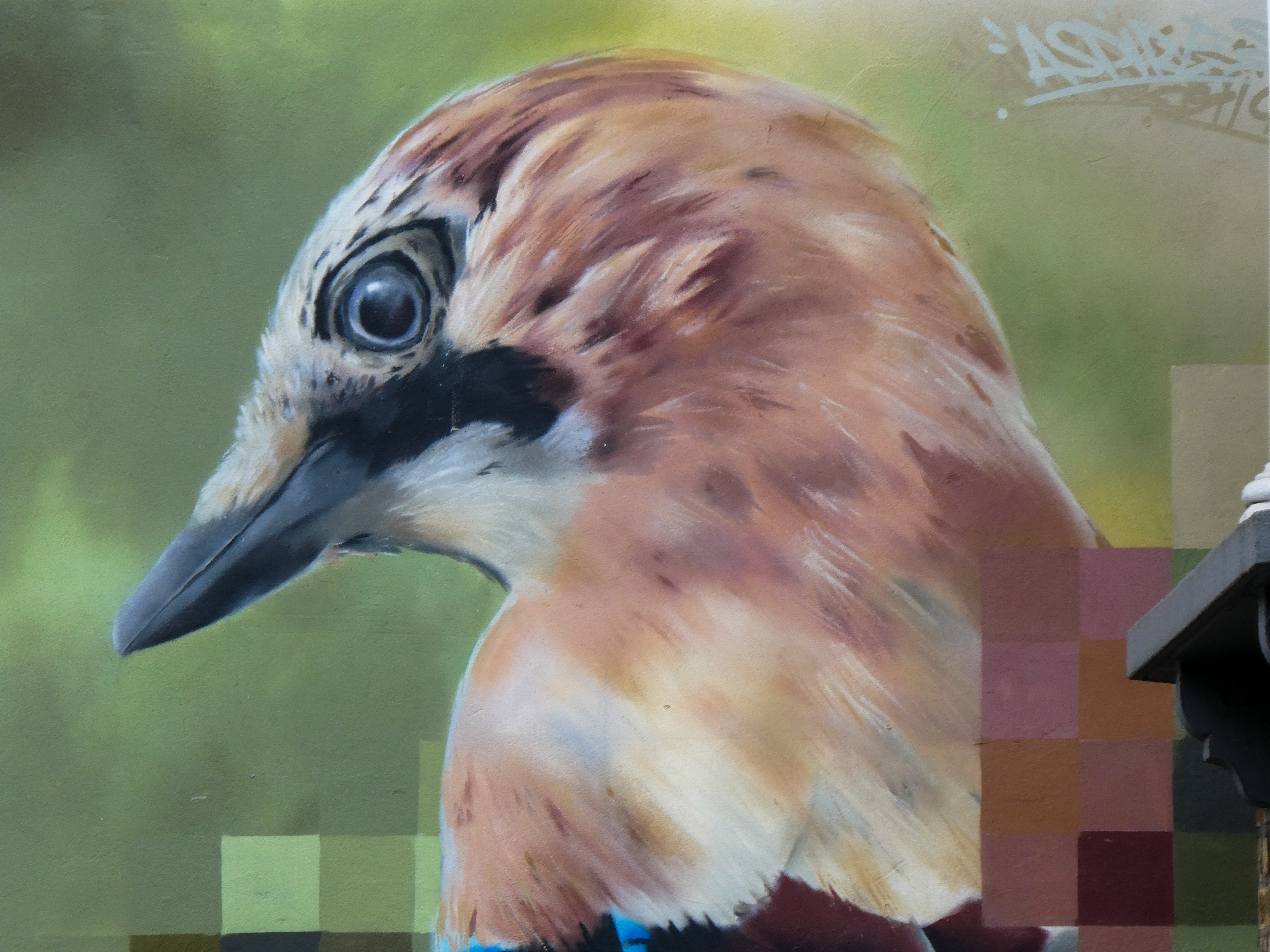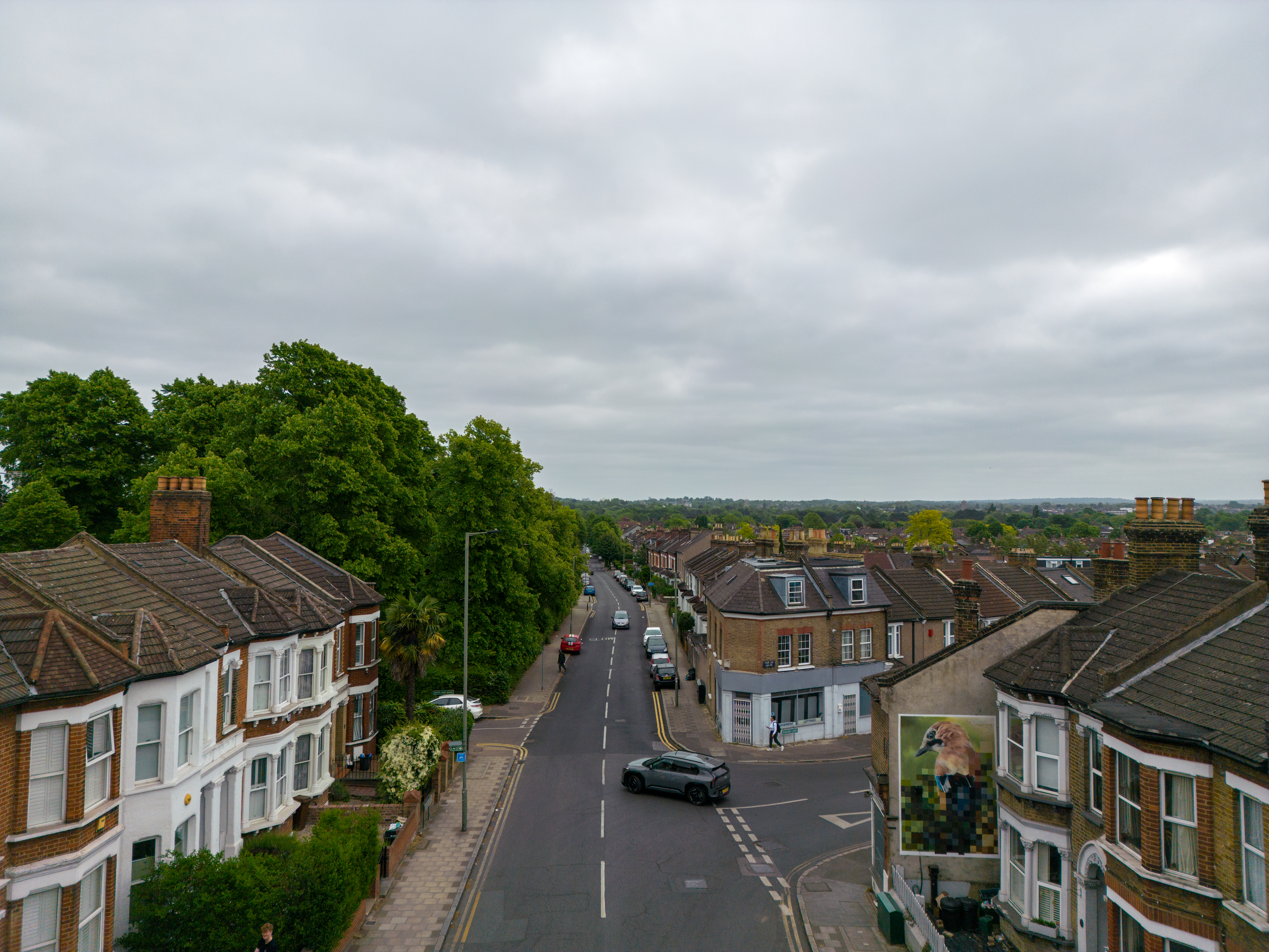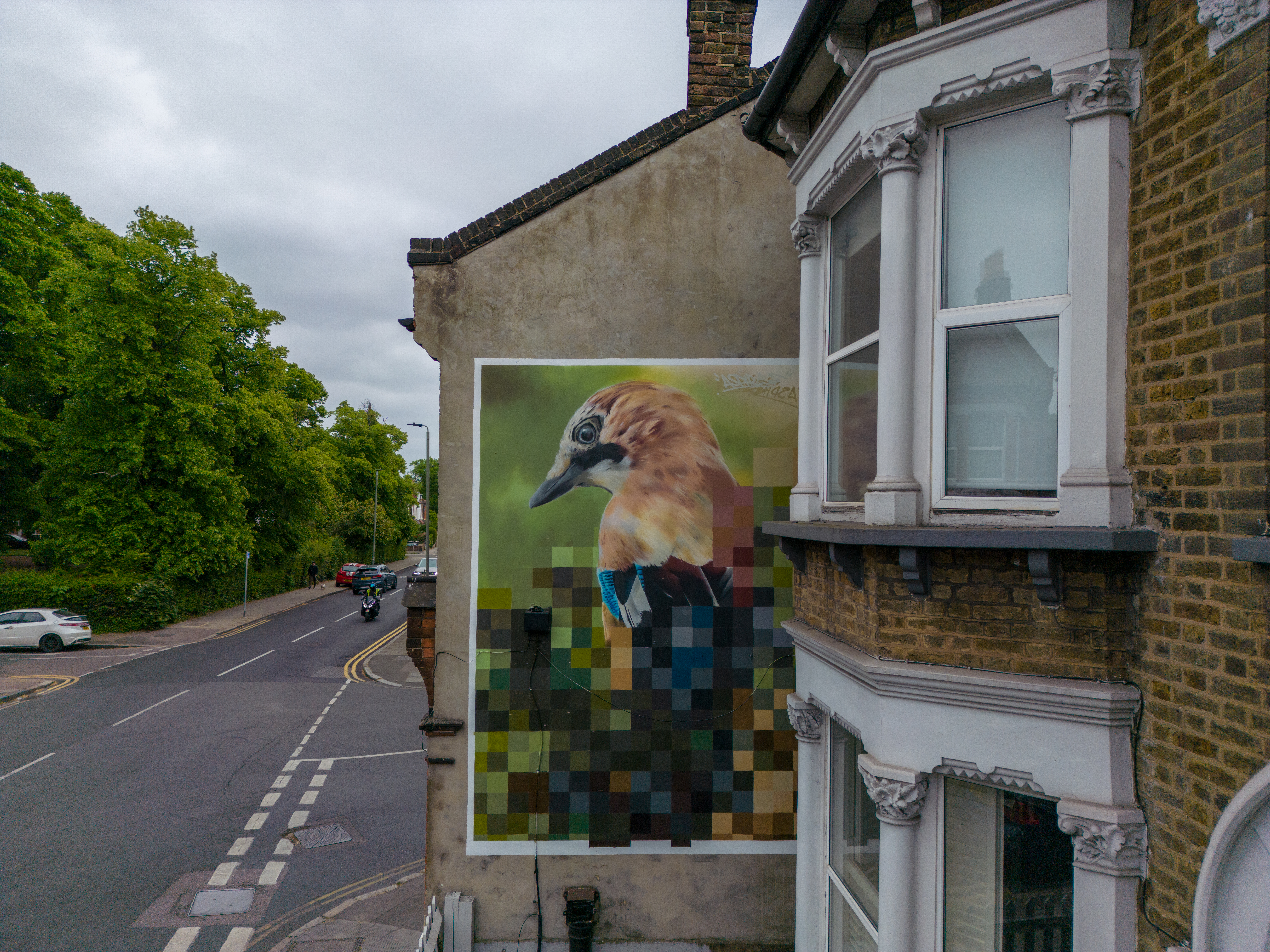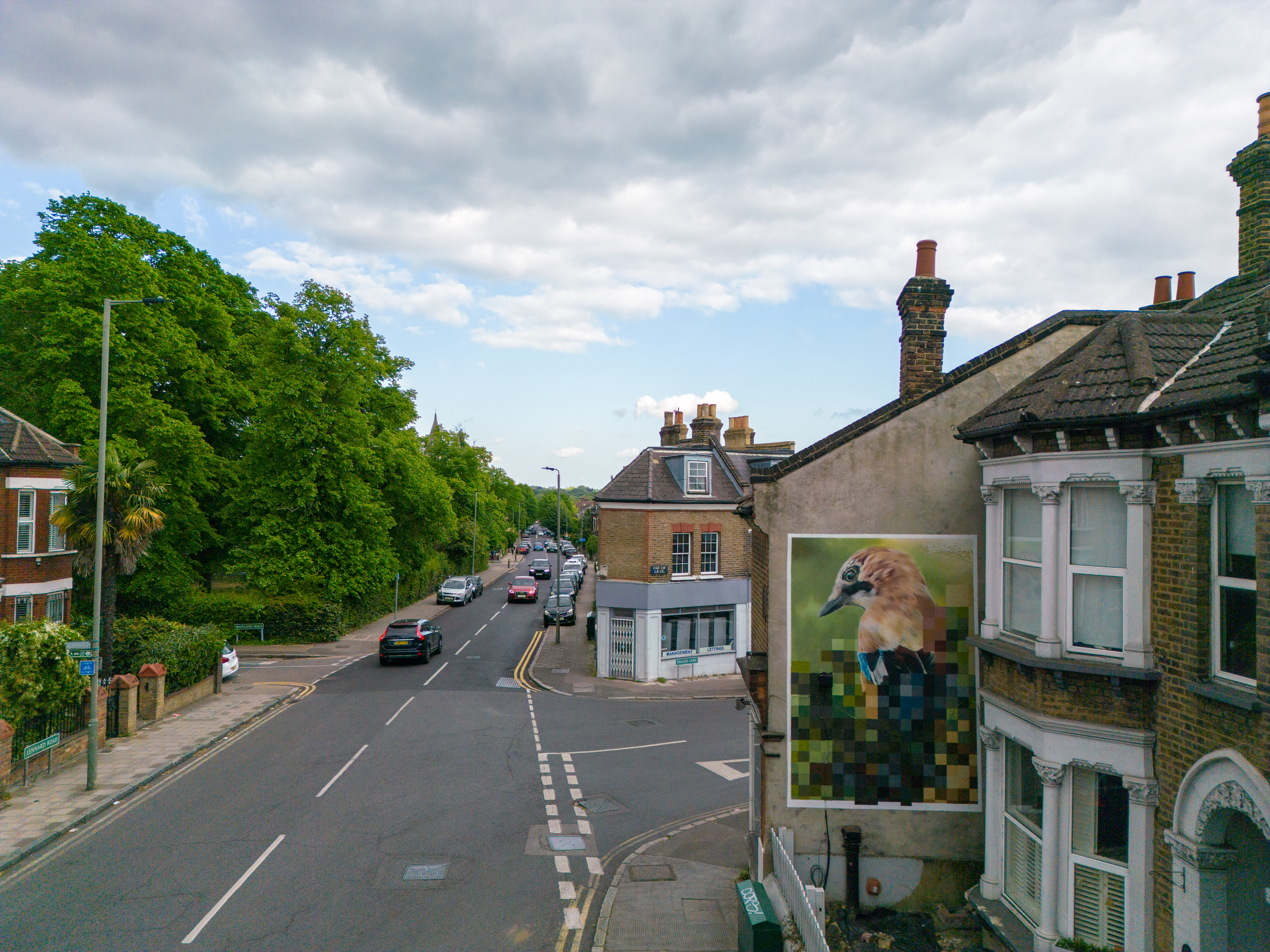 For this blog post we are taking a look a striking addition to Penge’s street art scene completed at the end of Spring by the ever prolific artist Aspire. Making excellent use of the raw render wall with this lovely calming piece featuring a Jay set in a frame to keep the raw aesthetic of the wall in the peripheral. Not only is this a lovely artwork, it is also one that is an absolute pleasure to photograph, with a number of viewing angles on offer. The striking work below was placed up in Lennard Road, Penge, with support from London Calling Blog for SprayExhibition20.