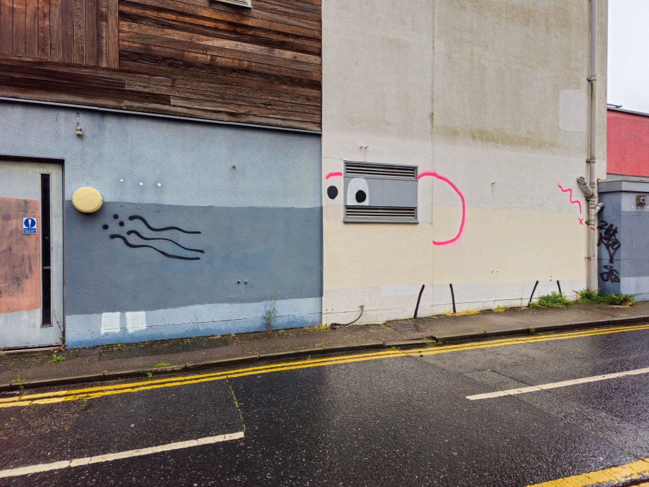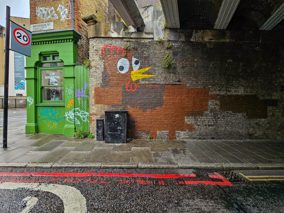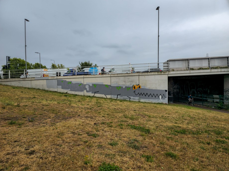 One of the most exciting things we have seen around London this year and for some time in general was a trio of works or interventions placed up by artist and graffiti writer Paul Insect – aka Pins – around East London. These works represent the absolute best of graffiti and street art, playing with the existing landscape, in this case in the form of transforming council or network rail buff jobs into fun animal characters. These pieces are exceptionally imaginative and superb for turning the attempts at removing creative expression into an artwork in their own right. It was well worth the 30 mile summer morning cycle to see these superb works and we hope to be lucky enough to see some more of these works in the future. Whilst it is a tough choice, the crocodile in Waltham Forest is our favourite of the three animals below.