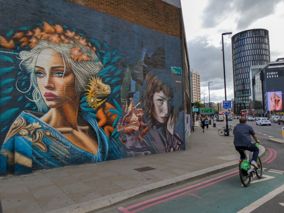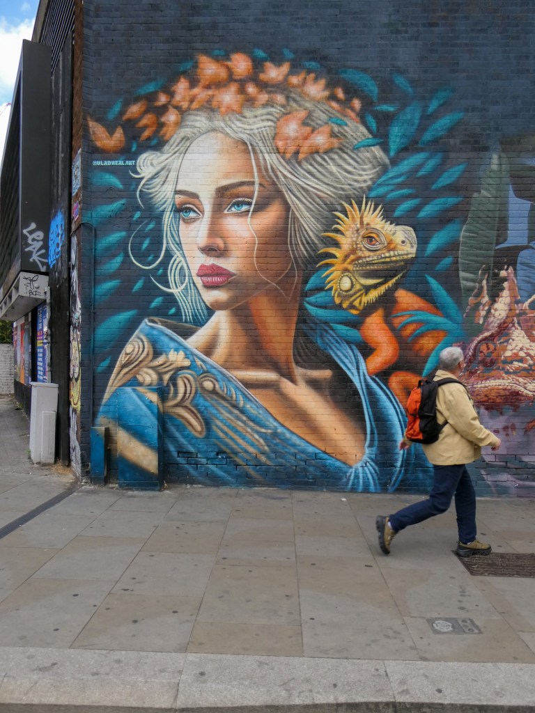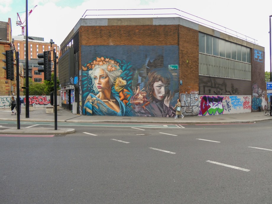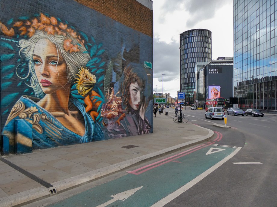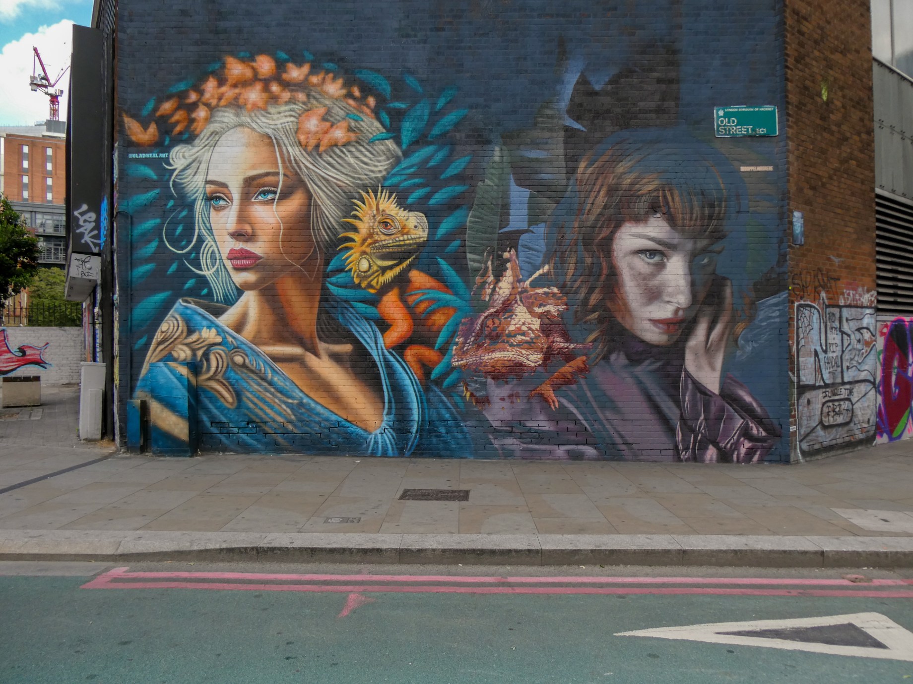 For our next blog post looking back on 2025, we are back up East London and taking a look at this striking large-scale collaboration between Vlad and Doppel. This is now the second time this duo have painted this spot, this time going rather bigger also. What is also great to see is how each of these individuals has pushed their art since they last painted this space in 2024, definite evidence of leveling up. In this work titled ‘In The Urban Jungle’ we have a pair of female subjects accompanied by reptiles in the form of an Iguana on Vlad’s portrait and a chameleon on Doppel’s portrait. A great piece that certainly owns and transforms this busy junction on the edge of the City. This striking work can be found on Old Street – at the corner of City Road.