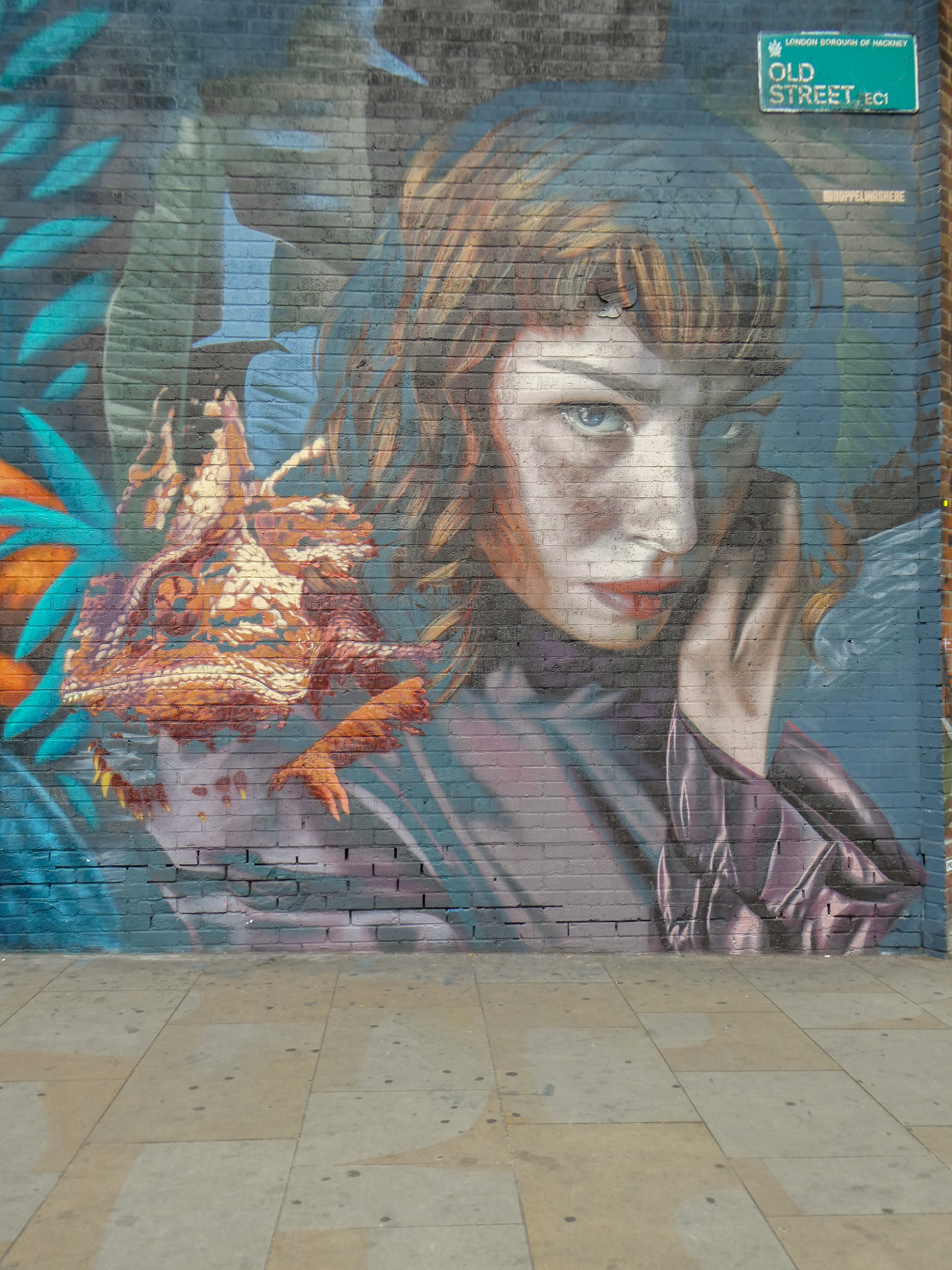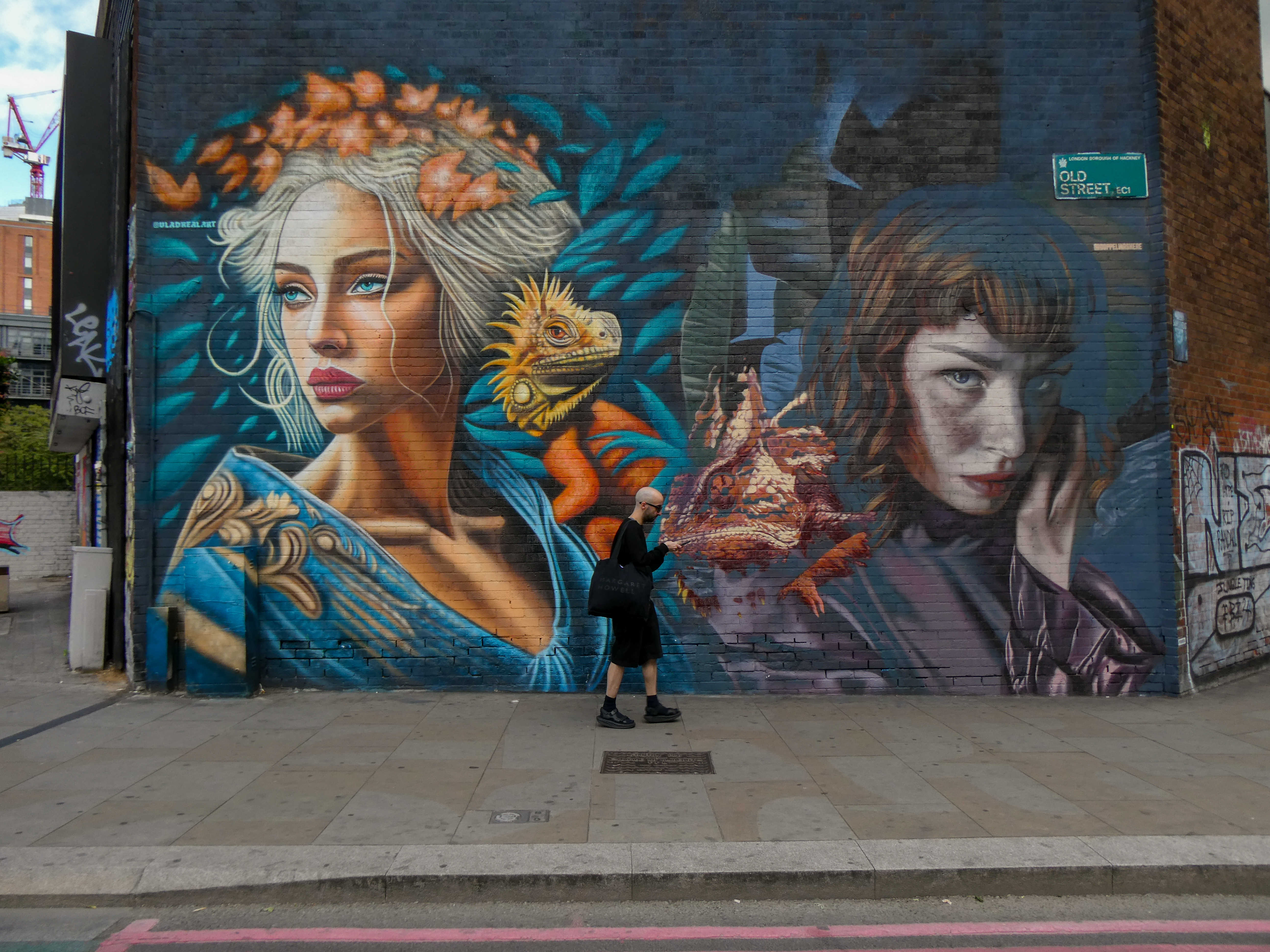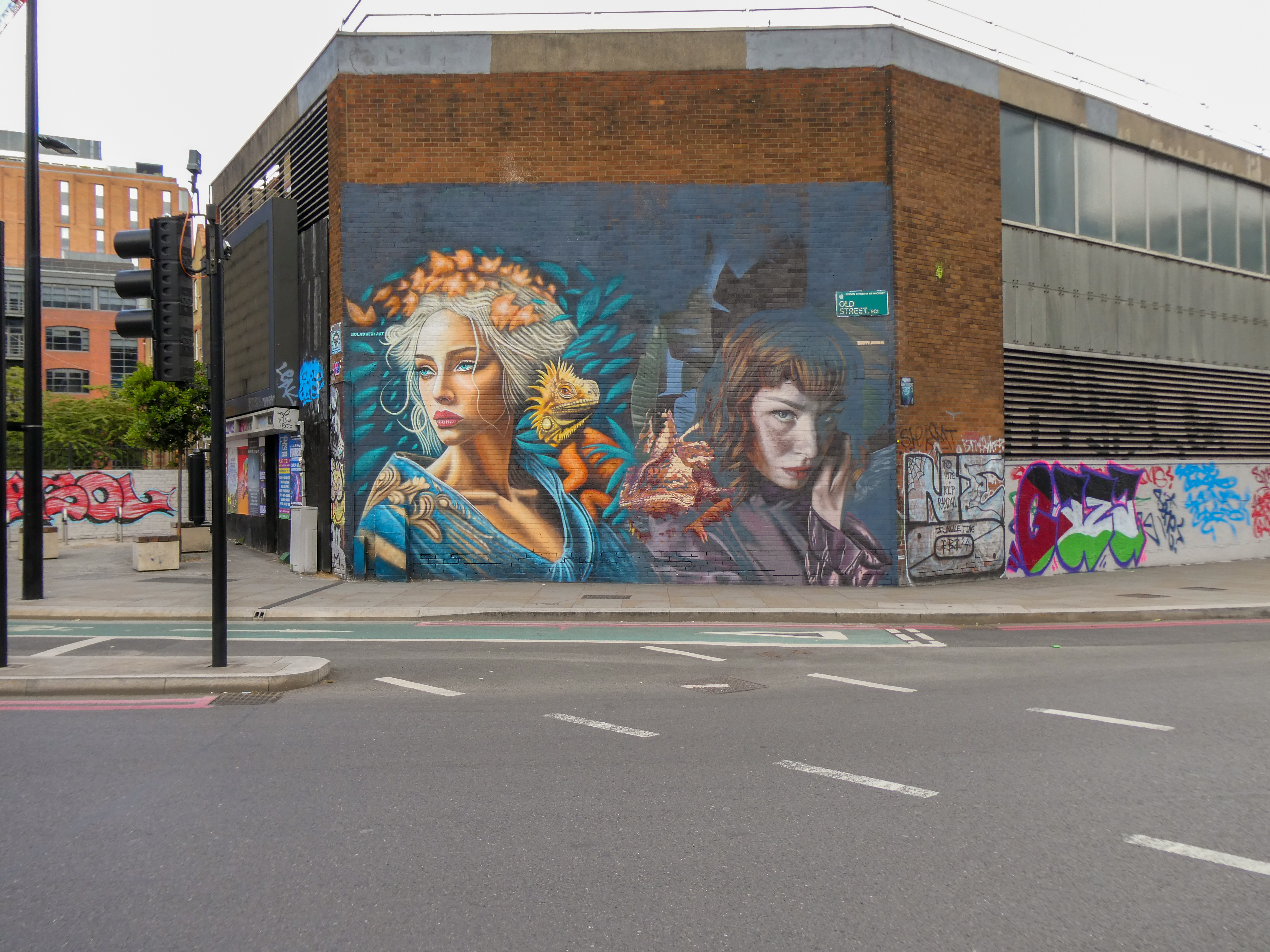 For our next blog post looking back on 2025, we are back up East London and taking a look at this striking large-scale collaboration between Vlad and Doppel. This is now the second time this duo have painted this spot, this time going rather bigger also. What is also great to see is how each of these individuals has pushed their art since they last painted this space in 2024, definite evidence of leveling up. In this work titled ‘In The Urban Jungle’ we have a pair of female subjects accompanied by reptiles in the form of an Iguana on Vlad’s portrait and a chameleon on Doppel’s portrait. A great piece that certainly owns and transforms this busy junction on the edge of the City. This striking work can be found on Old Street – at the corner of City Road.