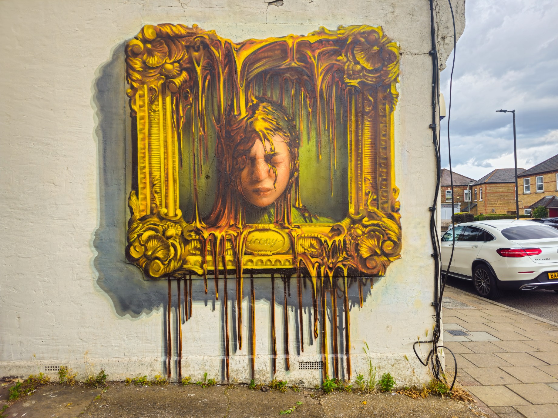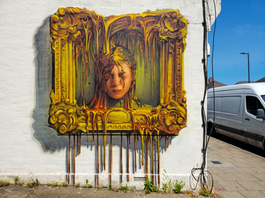 Next up we are taking a look at another one of the standout pieces of 2025 for us, that went up in Penge during the summer. This work is particularly interesting as it is a reworking of a design and concept used by the artist Irony eight years previously on the same spot. The striking work titled ‘The Price Of Everything’ makes excellent use of the space available, something which is very prevalent in Irony’s compositions, on this occasion a concrete billboard frame that adorns this wall in a former market street. Using the pre-existing frame Irony set to make it appear – to excellent effect – that someone has hung a painting on the wall, which is in-turn melting into the image and down to the floor. The inspiration behind the work sets to examine the intricate value of an artwork or indeed any given object, how something can become valuable just because it is expected to be or someone deems it to be that price irrespective of the quality or value of the work in question. This concept is exemplified by how the subject of Irony’s portrait has been consumed by the packaging and all that comes with this, obscuring the true intent of an otherwise classical portraiture tradition – don’t always buy the hype of the packaging.
