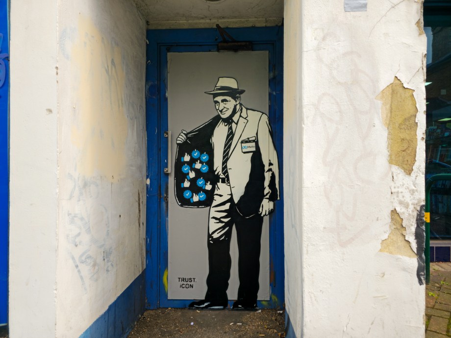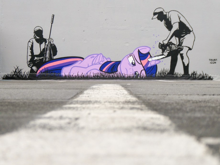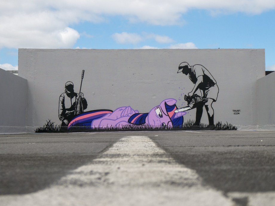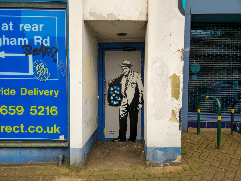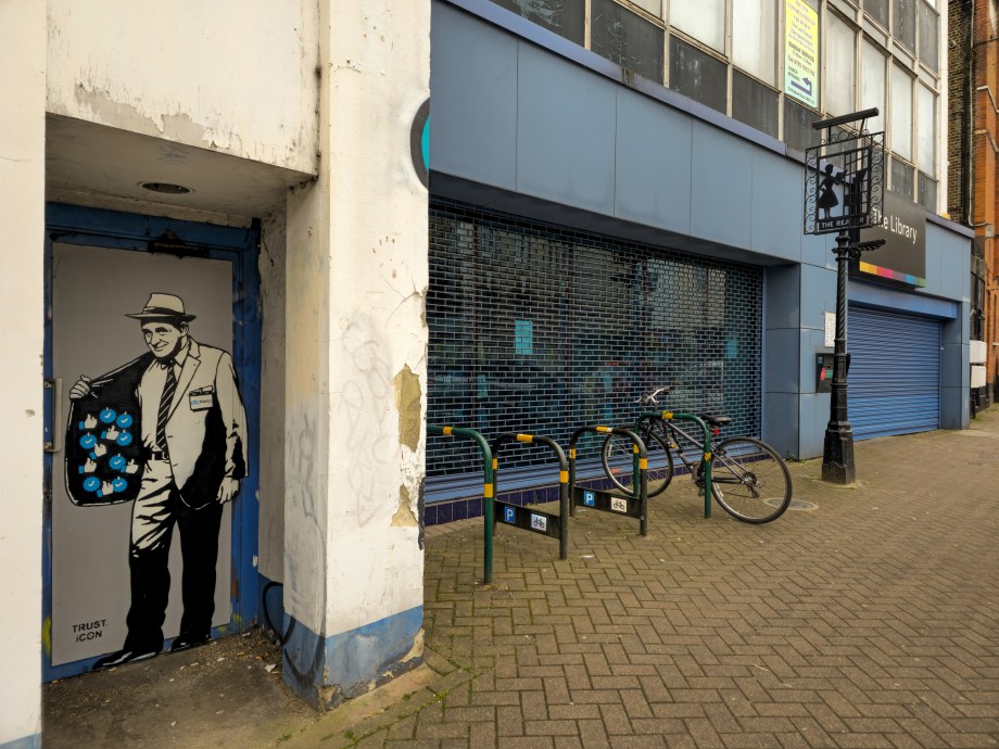 For our next blog post we are taking a look back at a trio of excellent additions to Penge over the summer by stencil artist TRUST.iCON for our community mural project SprayExhibition20. Through his artistic output TRUST.iCON sets to capture a moment or a snapshot from his, and many peoples childhood, combined with his own style of poignant insight or humour often based on subjects from popular culture injected into each design, making his style his very own and his works what they are. His latest additions to SE20 over the last year are no exception. TRUST.iCON has also continued to demonstrate his ability to come up with designs that suit quirky and unconventional spots absolutely perfectly. It had been a couple of years since we had seen any fresh artwork from this artist, and it is definitely safe to say he hasn’t lost his edge or knack. We are also exceptionally privileged to have been able to host Icon’s largest artwork to date at the Penge Rooftop Gallery. It is always a pleasure to see art from this artist and all the more so when it’s in our home town. These fantastic works below were put up around Penge with support from ourselves London Calling Blog.