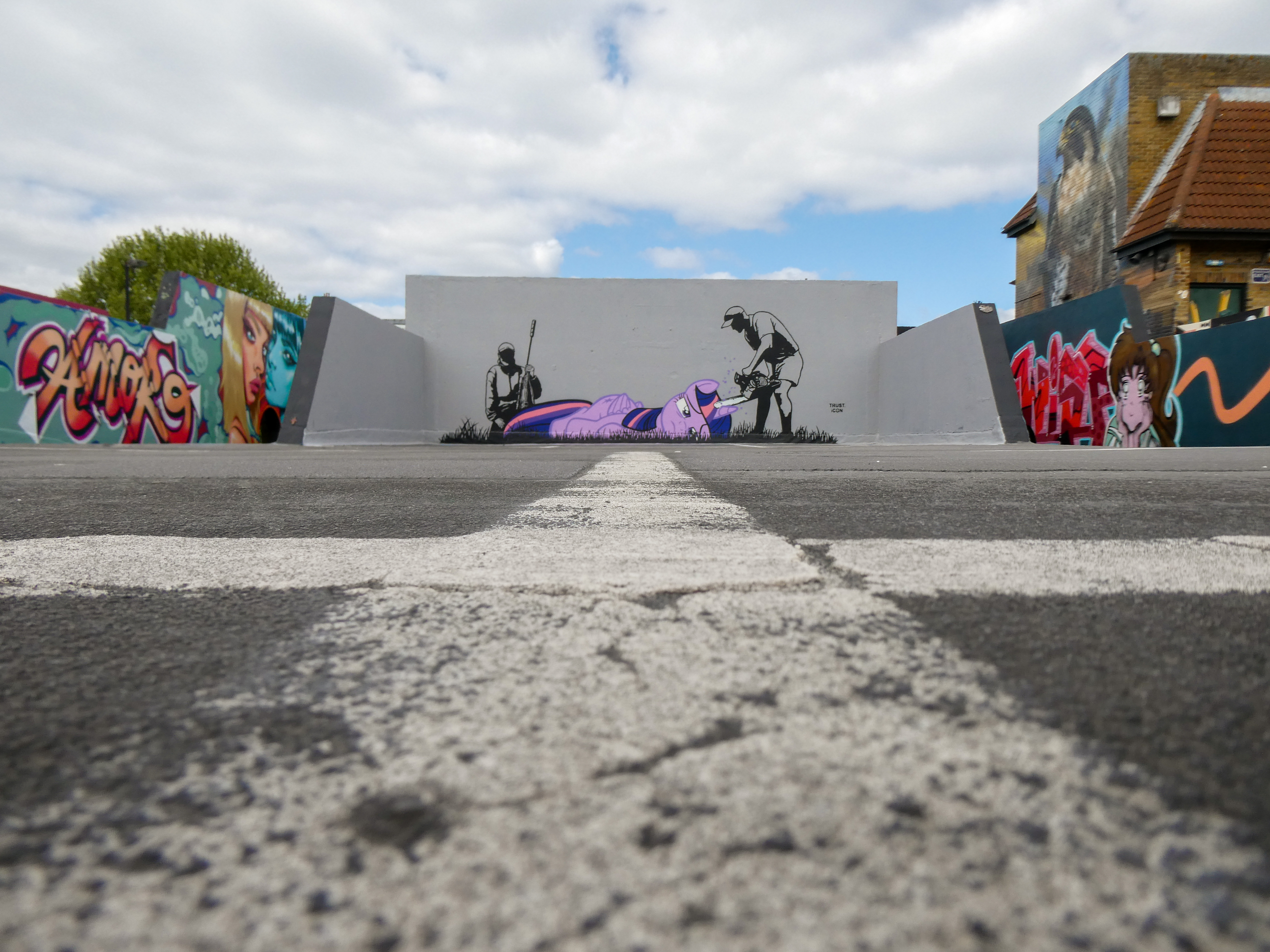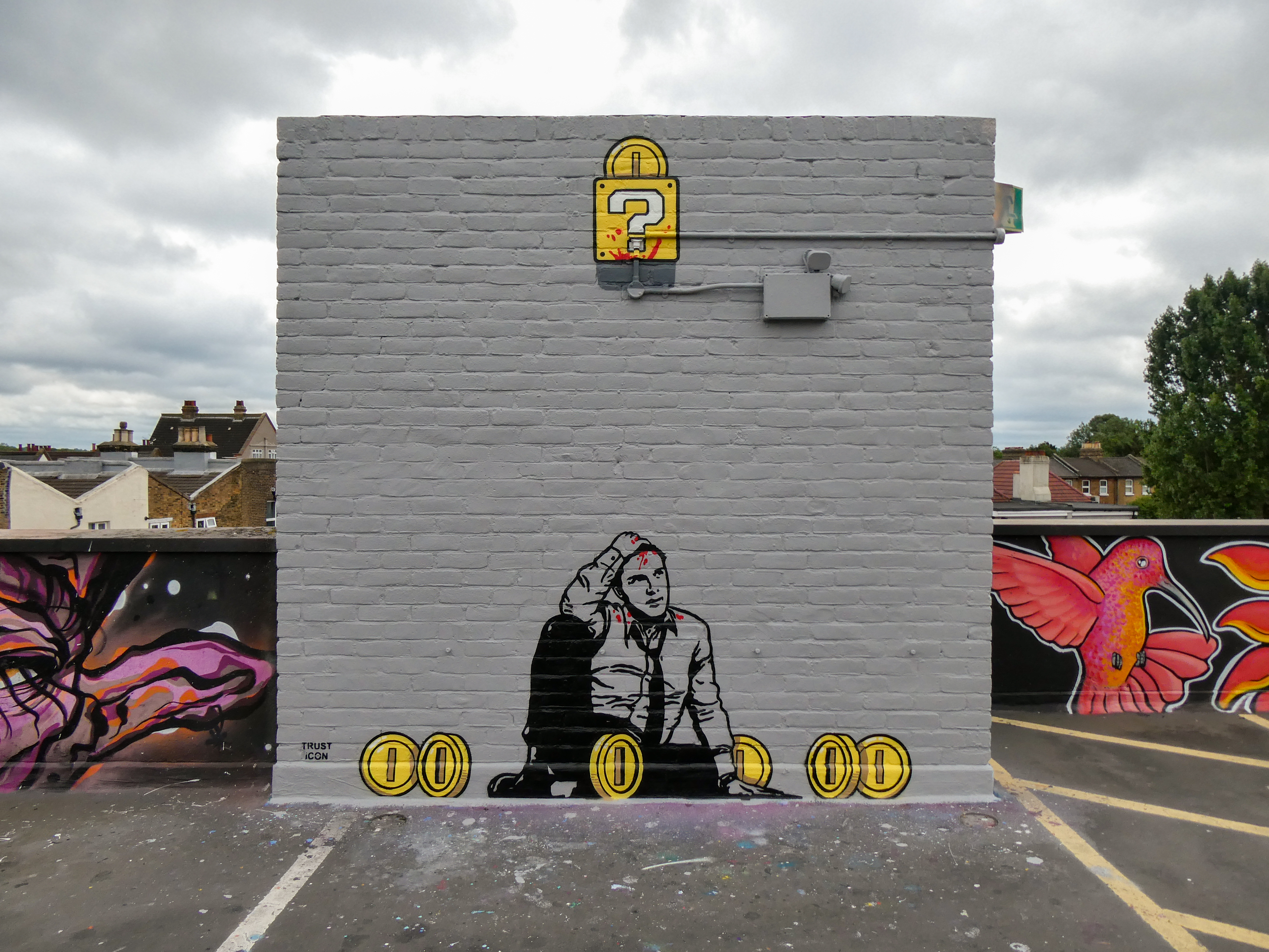 For our next blog post we are taking a look back at a trio of excellent additions to Penge over the summer by stencil artist TRUST.iCON for our community mural project SprayExhibition20. Through his artistic output TRUST.iCON sets to capture a moment or a snapshot from his, and many peoples childhood, combined with his own style of poignant insight or humour often based on subjects from popular culture injected into each design, making his style his very own and his works what they are. His latest additions to SE20 over the last year are no exception. TRUST.iCON has also continued to demonstrate his ability to come up with designs that suit quirky and unconventional spots absolutely perfectly. It had been a couple of years since we had seen any fresh artwork from this artist, and it is definitely safe to say he hasn’t lost his edge or knack. We are also exceptionally privileged to have been able to host Icon’s largest artwork to date at the Penge Rooftop Gallery. It is always a pleasure to see art from this artist and all the more so when it’s in our home town. These fantastic works below were put up around Penge with support from ourselves London Calling Blog.