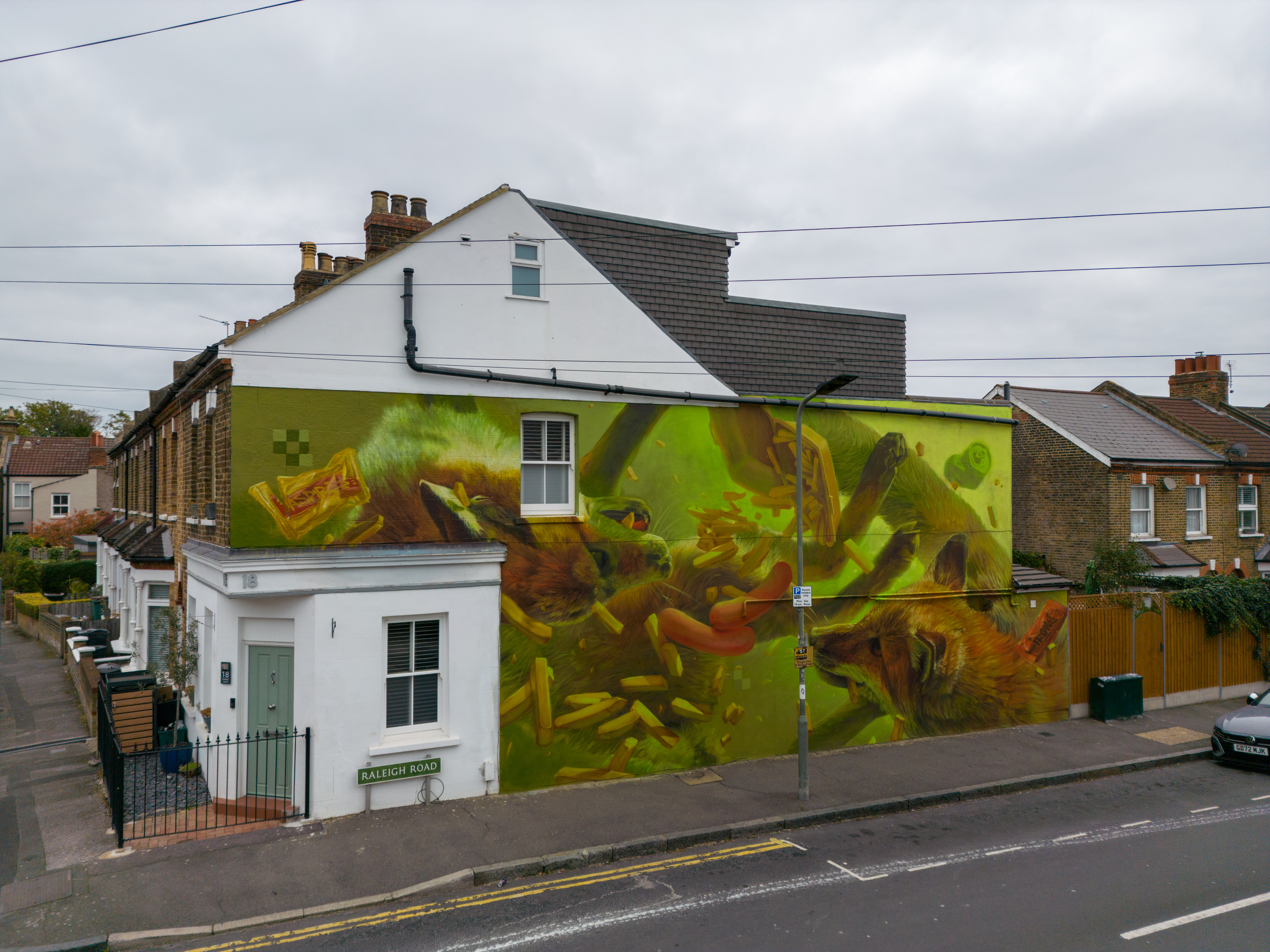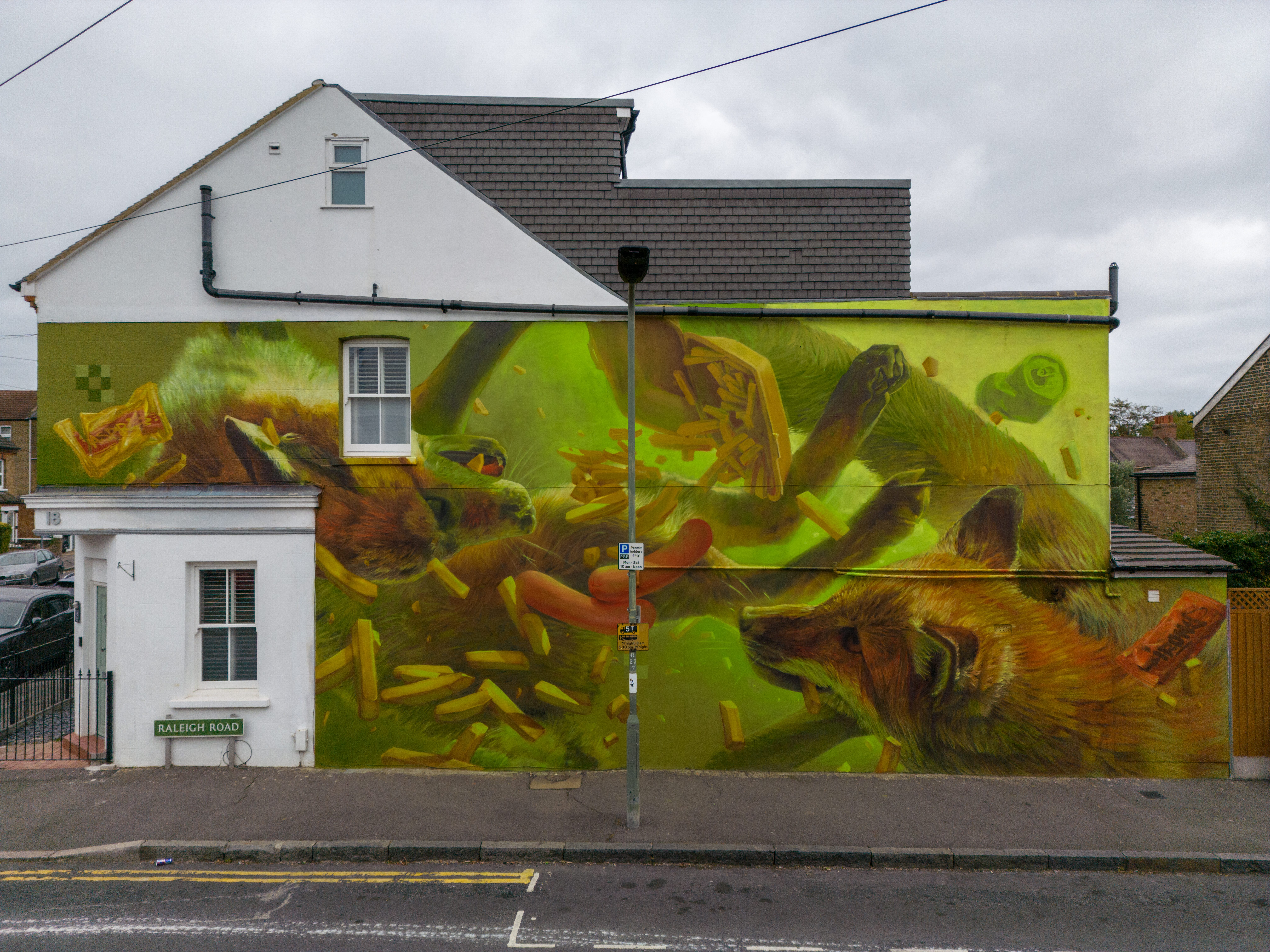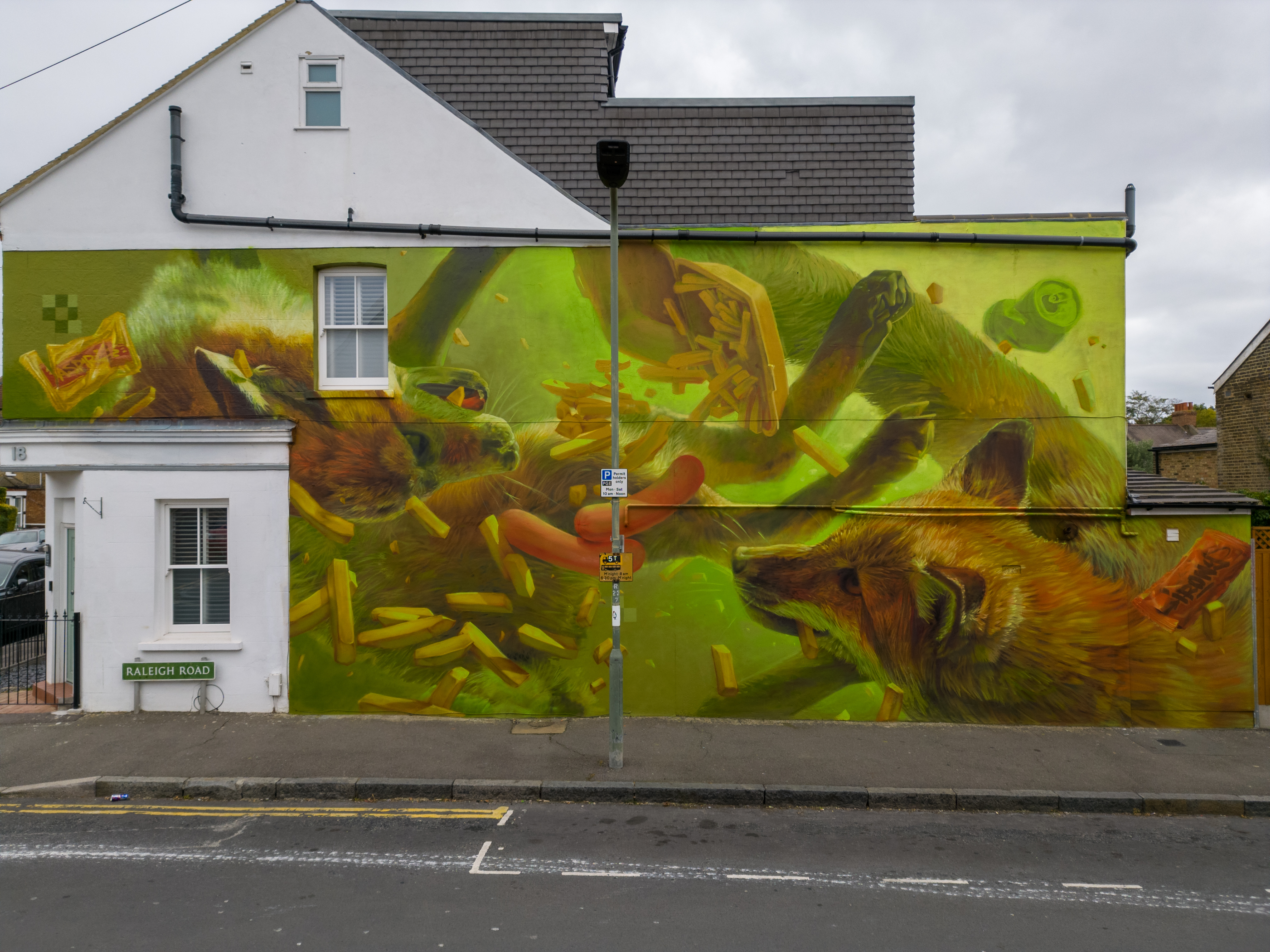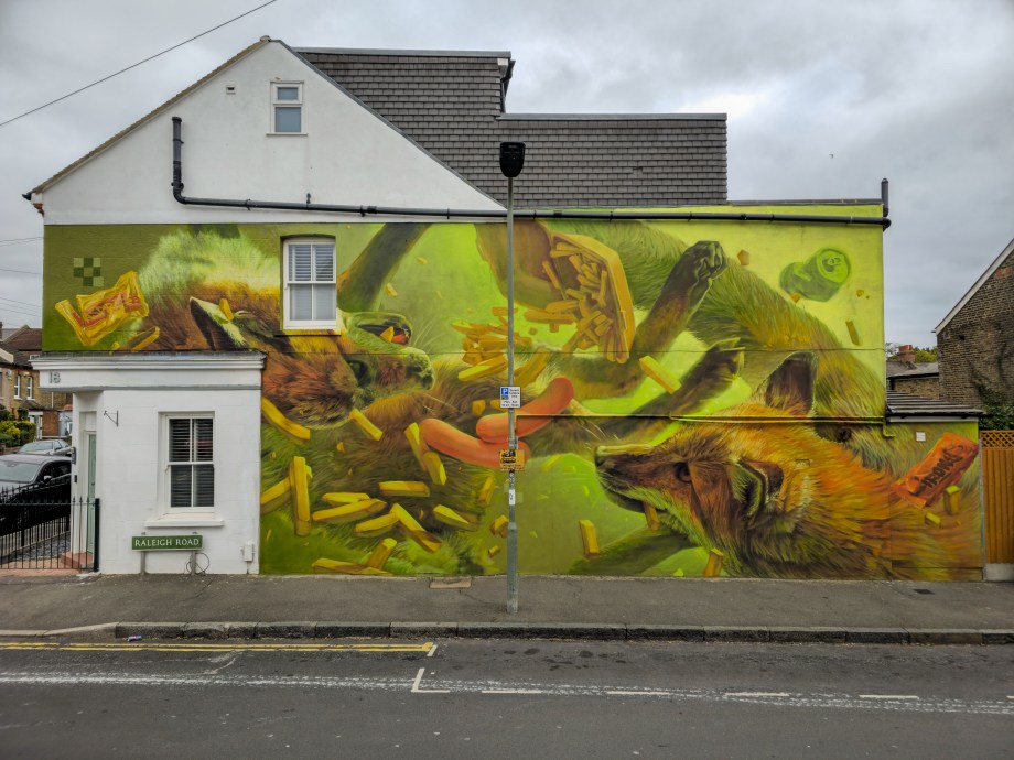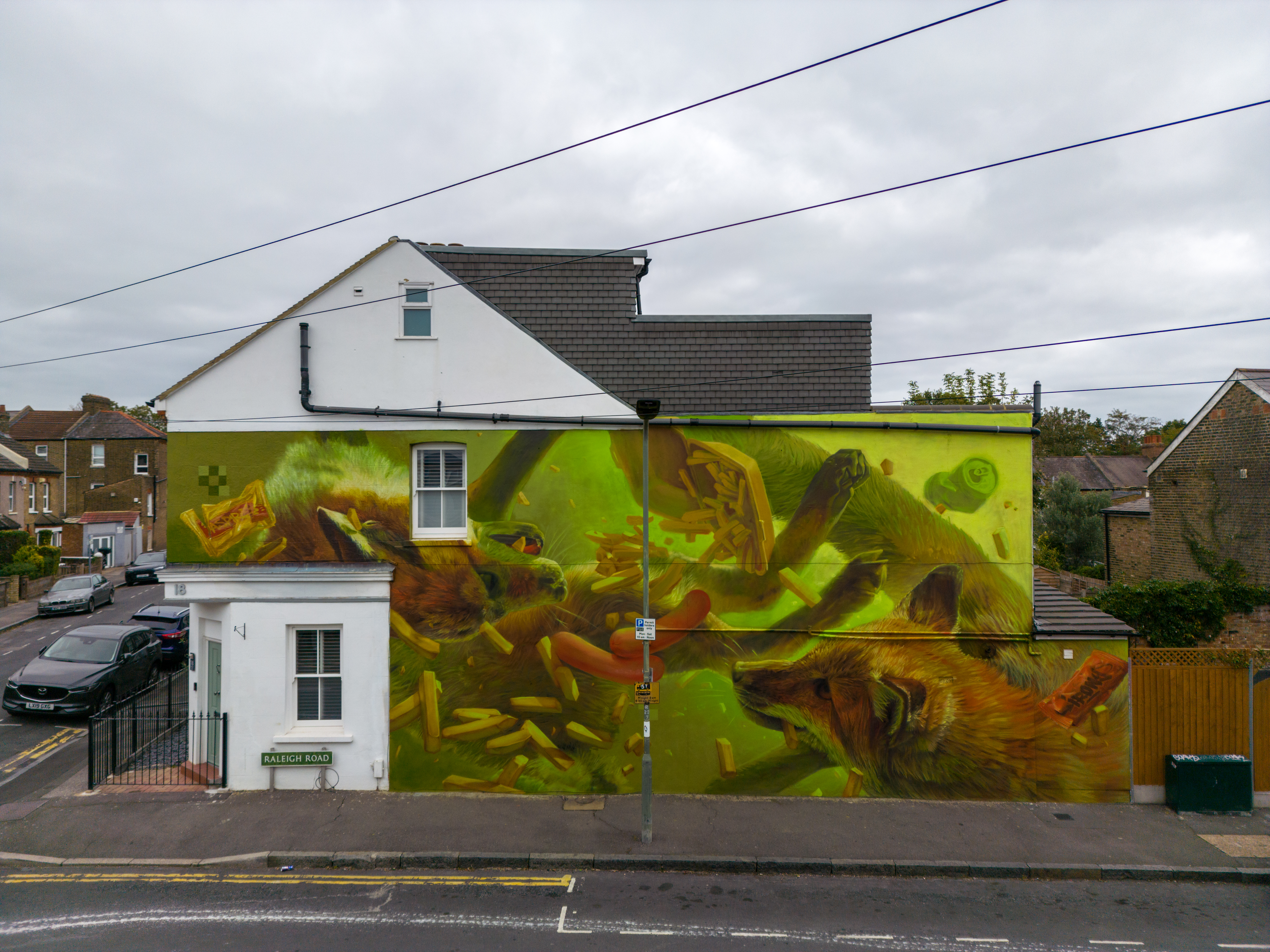 During the extreme heatwave of the summer in London, two of Penge’s most active artists over the previous nine years took to a gable end wall just off of the high street to paint this exceptional large-scale collaboration which is firstly exceptionally fun and secondly is masterfully painted. The artists being Aspire and Irony, set to paint his incredible urban nature scene worthy of any David Attenborough special, depicting a pair of city foxes fighting over a box of saveloy and chips. The piece is so harmonious in its execution that it is at a glance not immendiately visible as to which fox is done by which artist. However, the clue for those who may not recognise the finer aspects of each respective artists individual styles, the clues are in the sauce packets where Aspire (top left) and Irony (bottom right) signed the work. No two artists have contributed so much paint and creativity to SE20 over the last decade, so it was an absolute pleasure to see the two come together to paint this stunning artwork. This outstanding collaborative work can be found in Raleigh Road, Penge, and was put up with support from London Calling Blog for our community mural project SprayExhibition20.