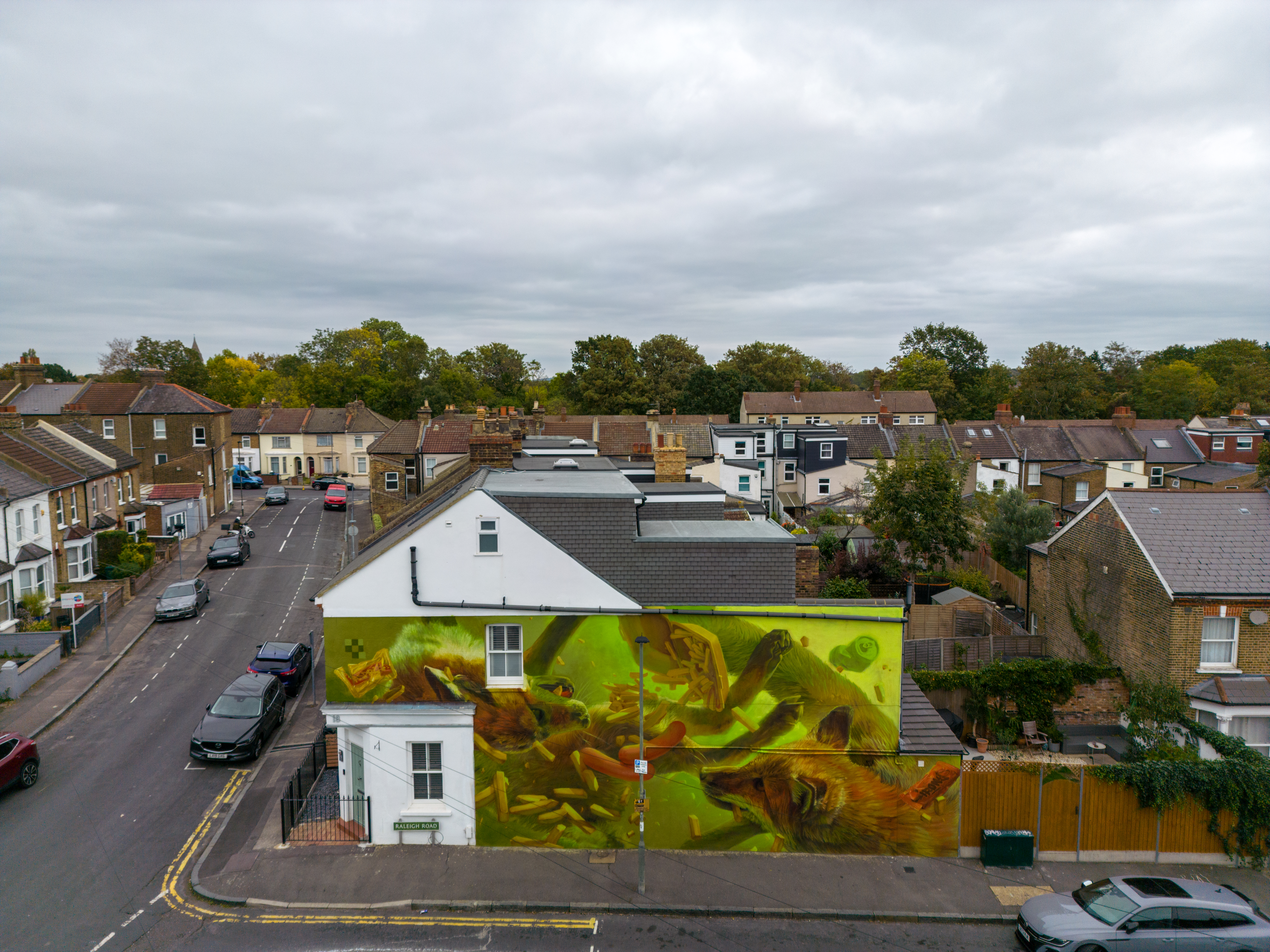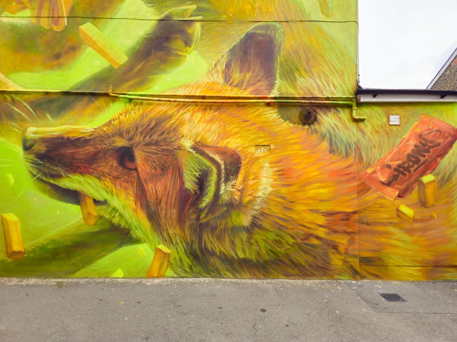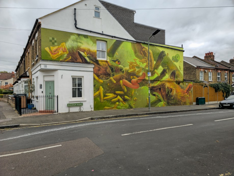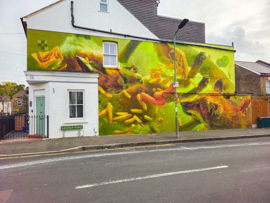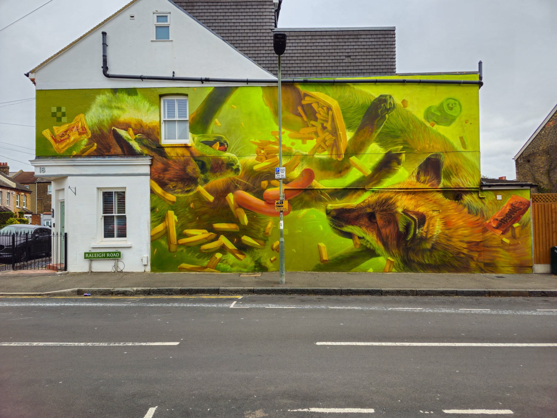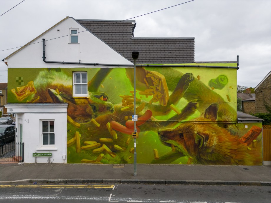 During the extreme heatwave of the summer in London, two of Penge’s most active artists over the previous nine years took to a gable end wall just off of the high street to paint this exceptional large-scale collaboration which is firstly exceptionally fun and secondly is masterfully painted. The artists being Aspire and Irony, set to paint his incredible urban nature scene worthy of any David Attenborough special, depicting a pair of city foxes fighting over a box of saveloy and chips. The piece is so harmonious in its execution that it is at a glance not immendiately visible as to which fox is done by which artist. However, the clue for those who may not recognise the finer aspects of each respective artists individual styles, the clues are in the sauce packets where Aspire (top left) and Irony (bottom right) signed the work. No two artists have contributed so much paint and creativity to SE20 over the last decade, so it was an absolute pleasure to see the two come together to paint this stunning artwork. This outstanding collaborative work can be found in Raleigh Road, Penge, and was put up with support from London Calling Blog for our community mural project SprayExhibition20.