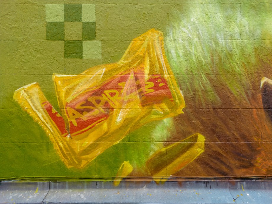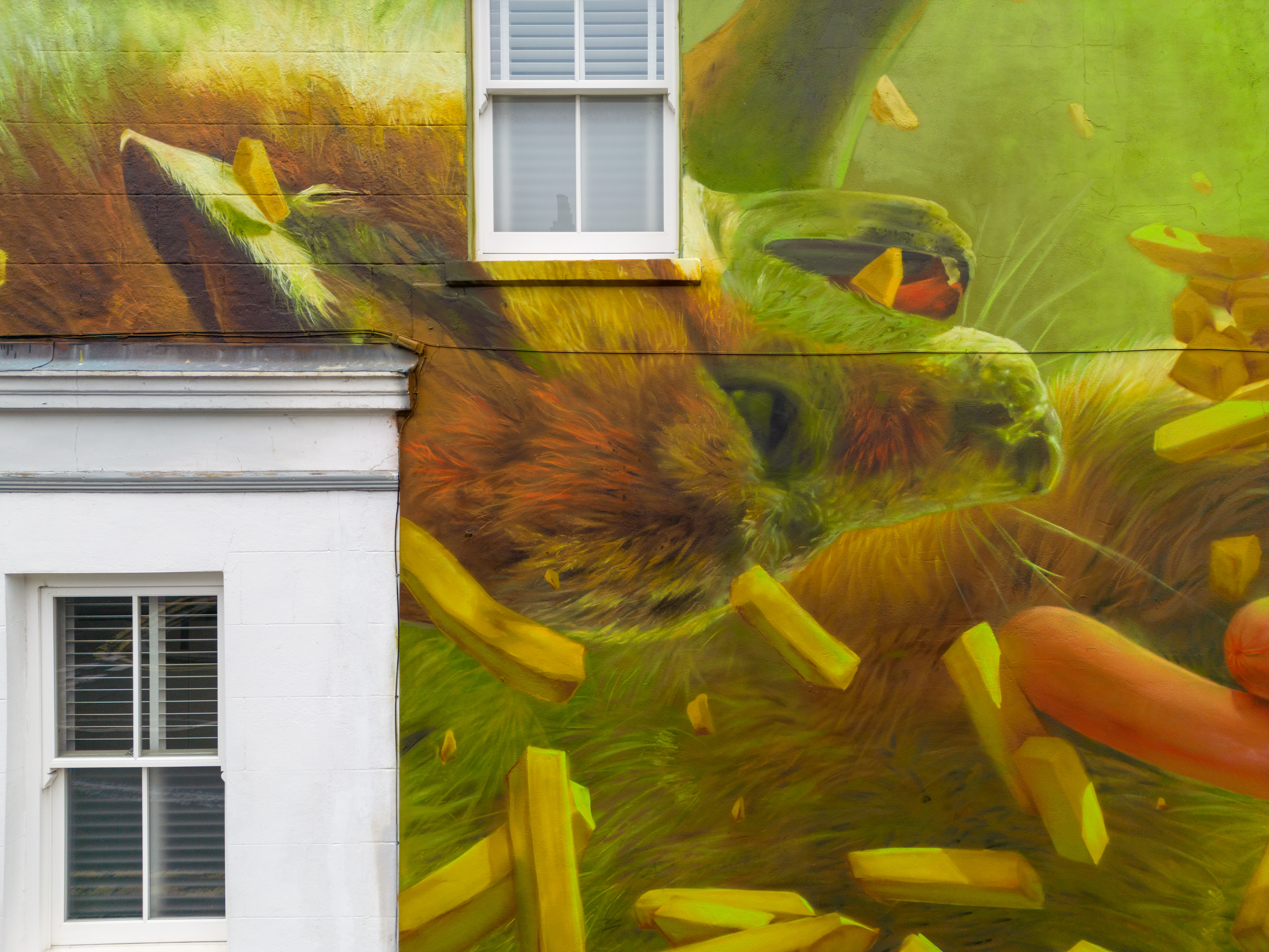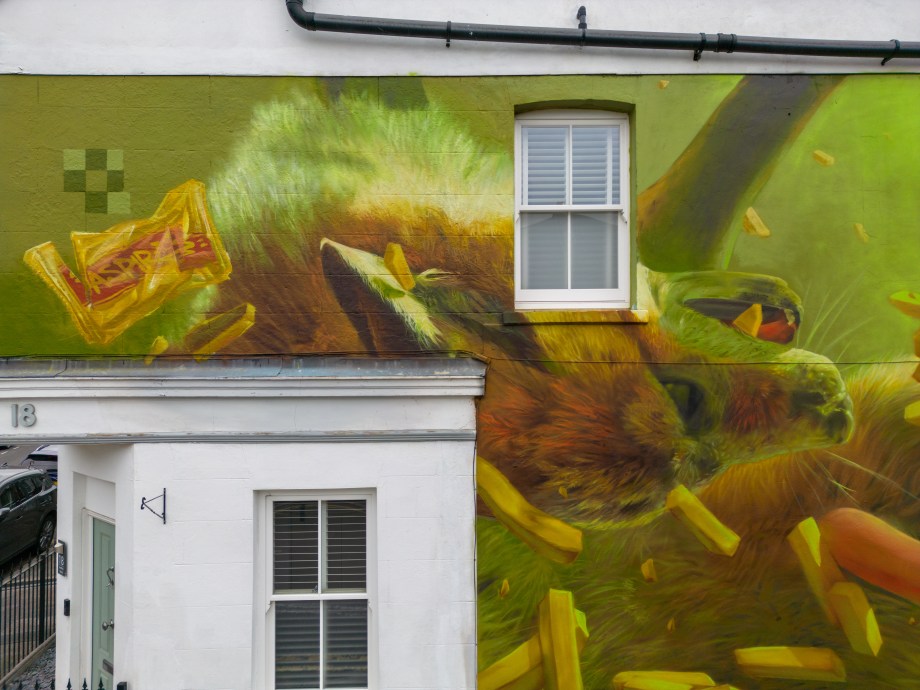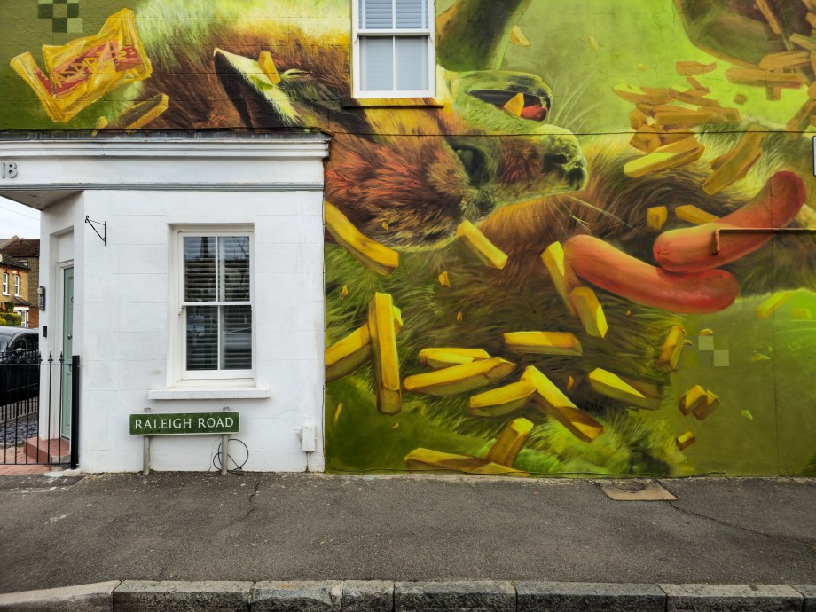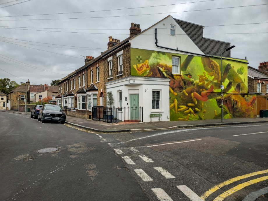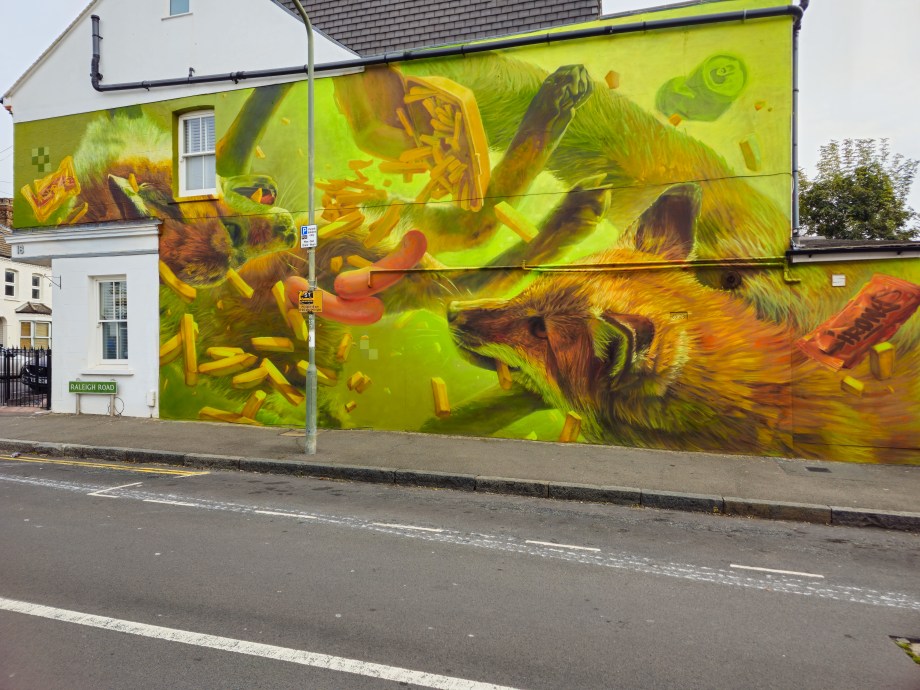 During the extreme heatwave of the summer in London, two of Penge’s most active artists over the previous nine years took to a gable end wall just off of the high street to paint this exceptional large-scale collaboration which is firstly exceptionally fun and secondly is masterfully painted. The artists being Aspire and Irony, set to paint his incredible urban nature scene worthy of any David Attenborough special, depicting a pair of city foxes fighting over a box of saveloy and chips. The piece is so harmonious in its execution that it is at a glance not immendiately visible as to which fox is done by which artist. However, the clue for those who may not recognise the finer aspects of each respective artists individual styles, the clues are in the sauce packets where Aspire (top left) and Irony (bottom right) signed the work. No two artists have contributed so much paint and creativity to SE20 over the last decade, so it was an absolute pleasure to see the two come together to paint this stunning artwork. This outstanding collaborative work can be found in Raleigh Road, Penge, and was put up with support from London Calling Blog for our community mural project SprayExhibition20.