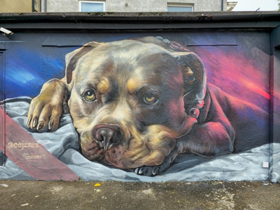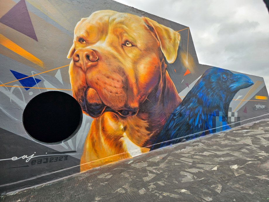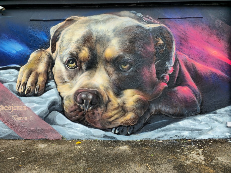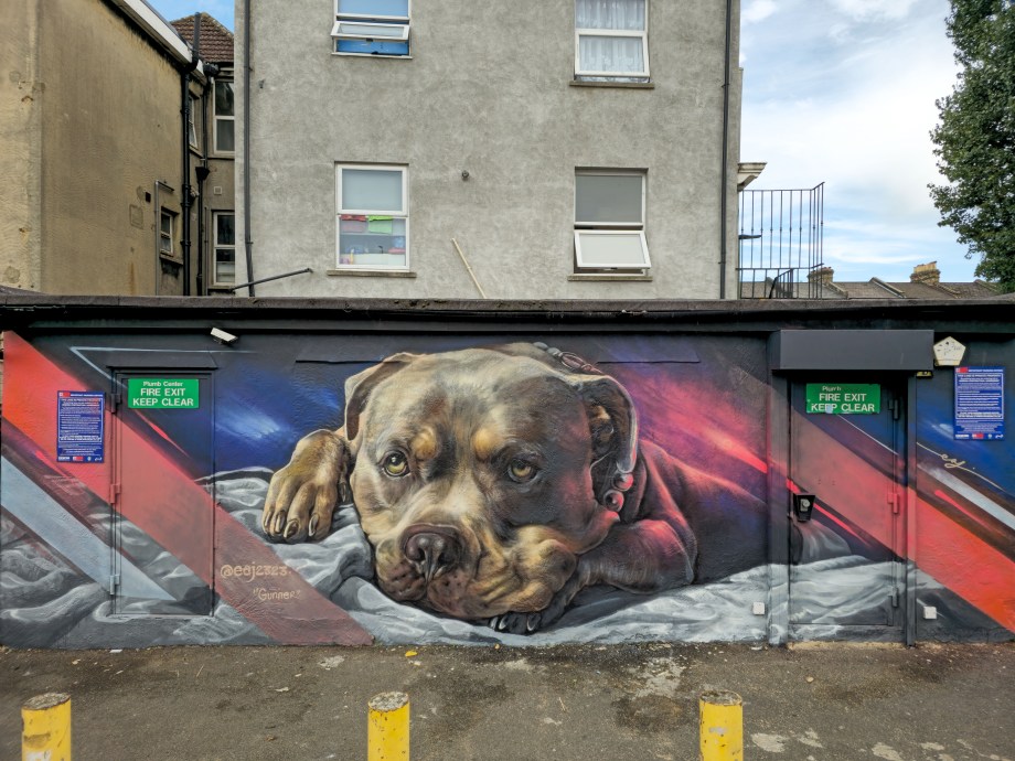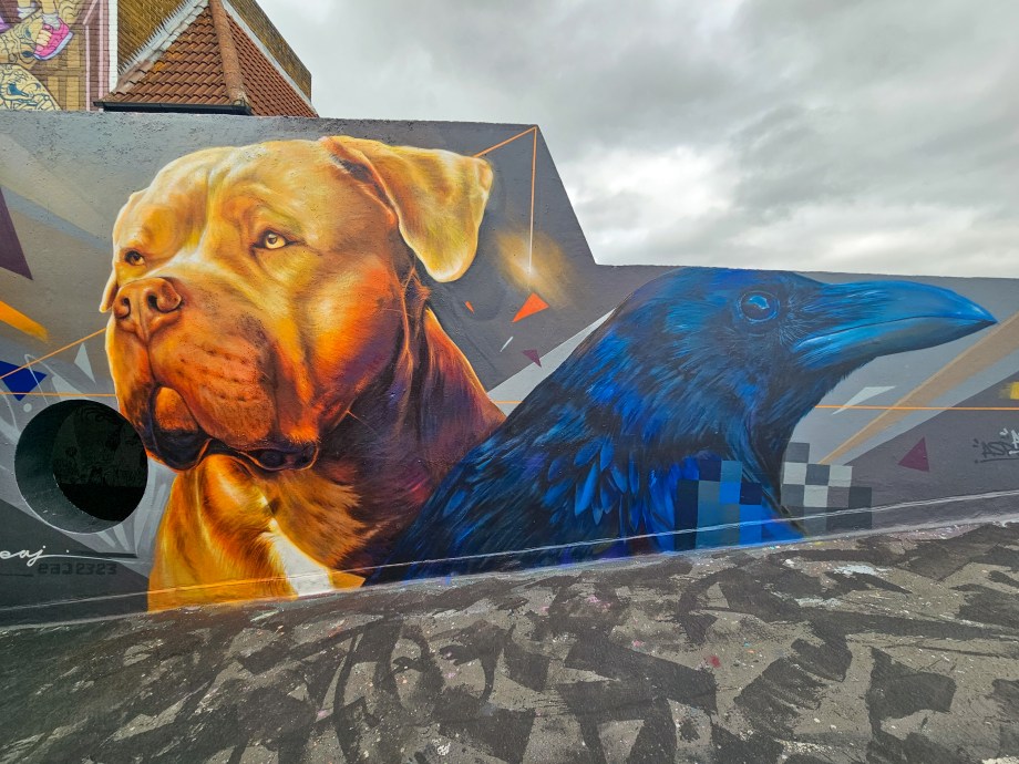 During the summer London received a visit from French street artist EAJ, who whilst over took the time to visit Penge in South-East London and hit up a couple of stunning photo-realistic dog portraits, one a solo work and one a collaboration with street artist Aspire, who brought his brand of realistic aviary subjects to the table. Through his artistic output dogs which are characterised as exclusively being dangerous dogs that shouldn’t exist. In his art EAJ sets to capture the warmth and gentle aspects of their individual character and that of the breeds in general. This summer marked the first time EAJ has visited London to paint and for the occasion he painted a pair of dogs who reside in the UK and based on the feedback we saw online from each of their respective owners he certainly did each of the individual dogs justice. The superb works below were placed up with support from London Calling Blog, for SprayExhibition20.