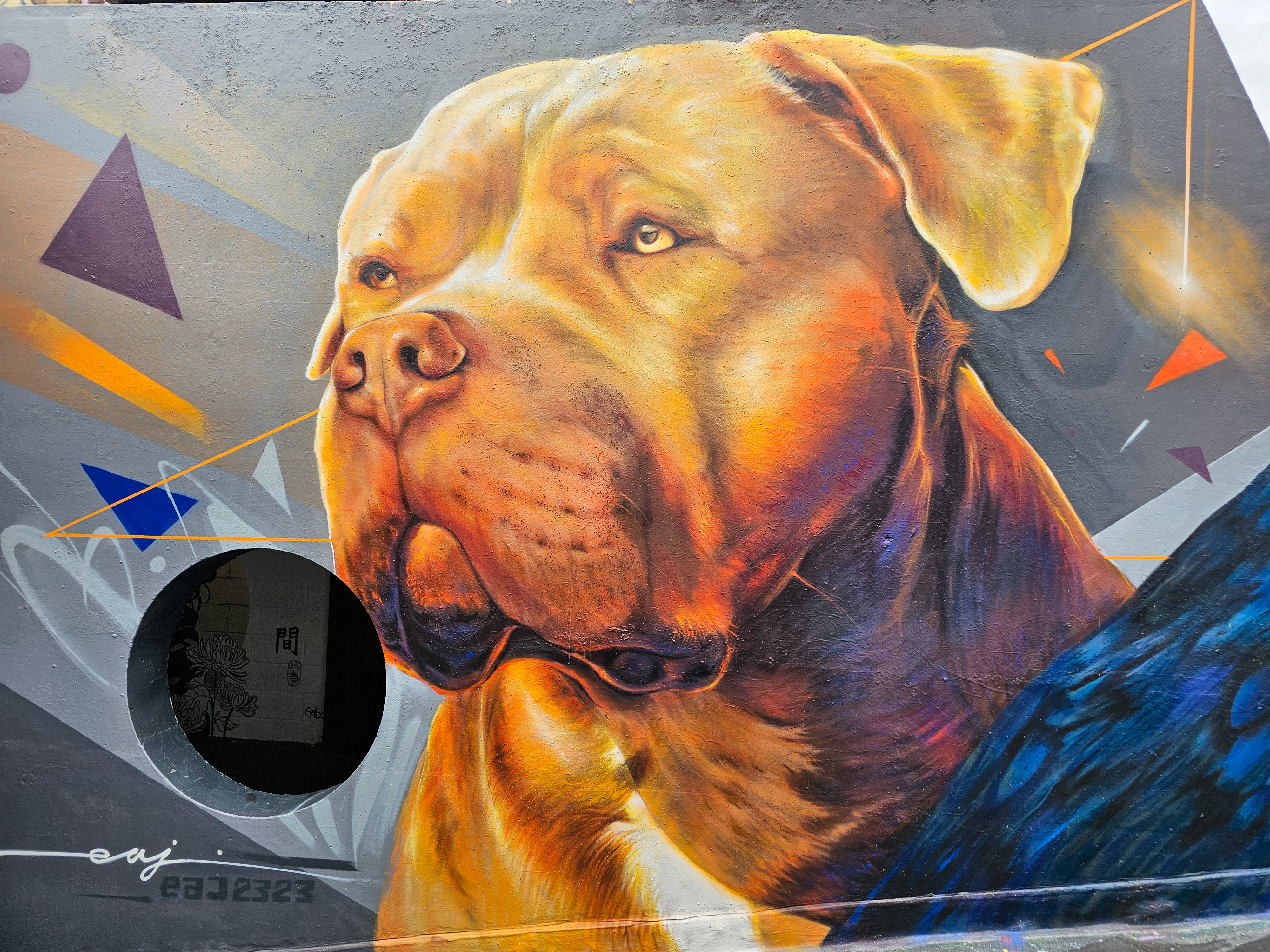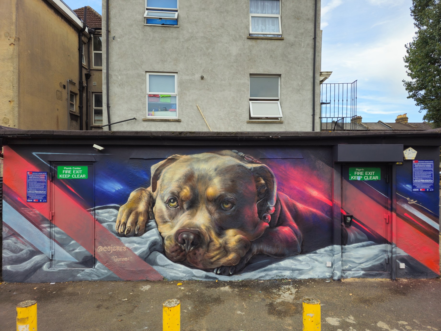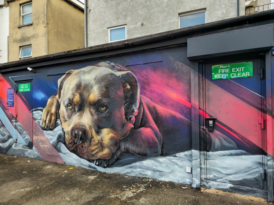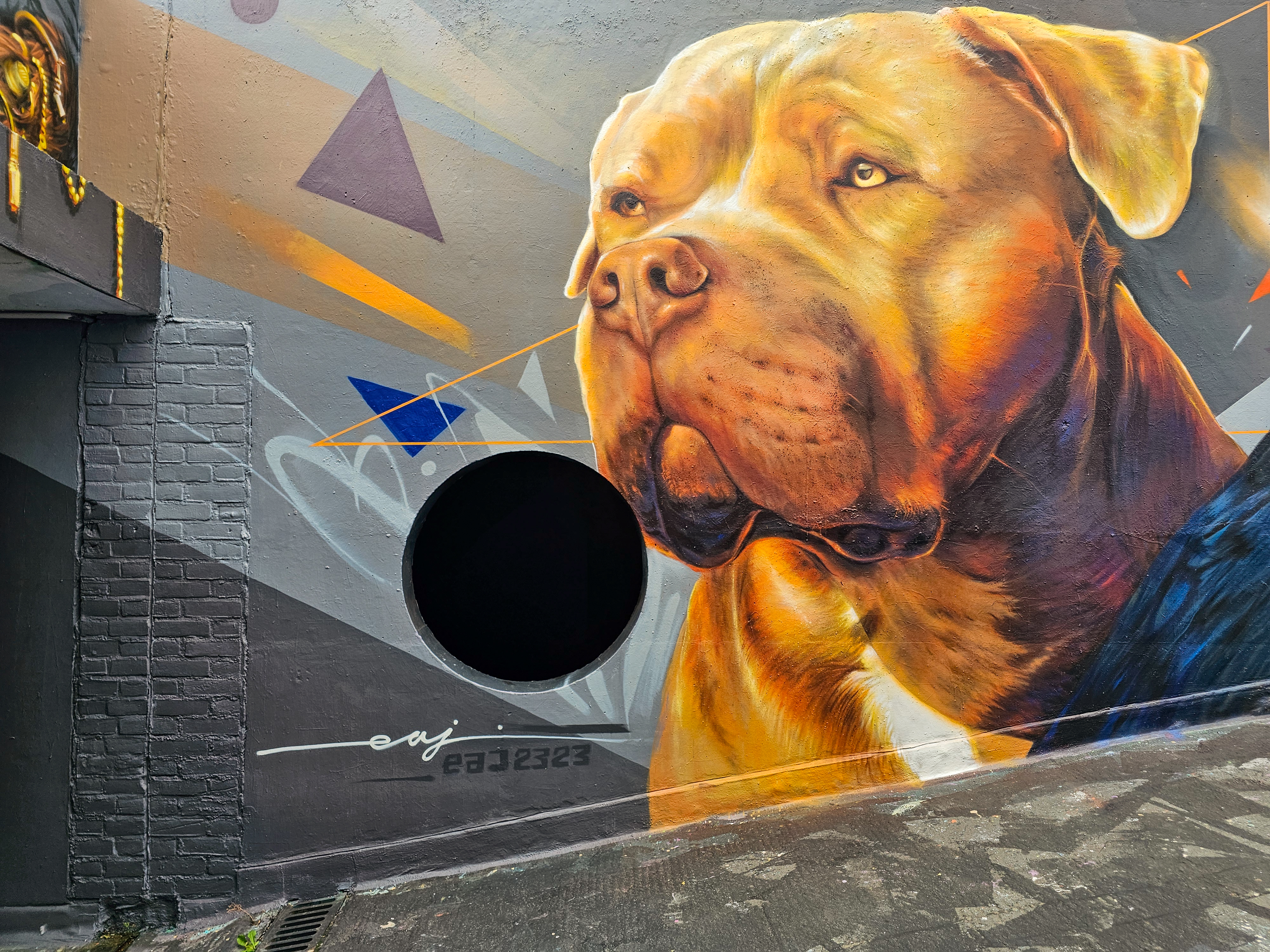 During the summer London received a visit from French street artist EAJ, who whilst over took the time to visit Penge in South-East London and hit up a couple of stunning photo-realistic dog portraits, one a solo work and one a collaboration with street artist Aspire, who brought his brand of realistic aviary subjects to the table. Through his artistic output dogs which are characterised as exclusively being dangerous dogs that shouldn’t exist. In his art EAJ sets to capture the warmth and gentle aspects of their individual character and that of the breeds in general. This summer marked the first time EAJ has visited London to paint and for the occasion he painted a pair of dogs who reside in the UK and based on the feedback we saw online from each of their respective owners he certainly did each of the individual dogs justice. The superb works below were placed up with support from London Calling Blog, for SprayExhibition20.