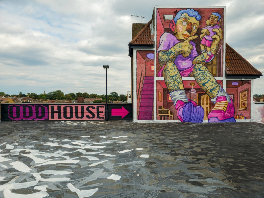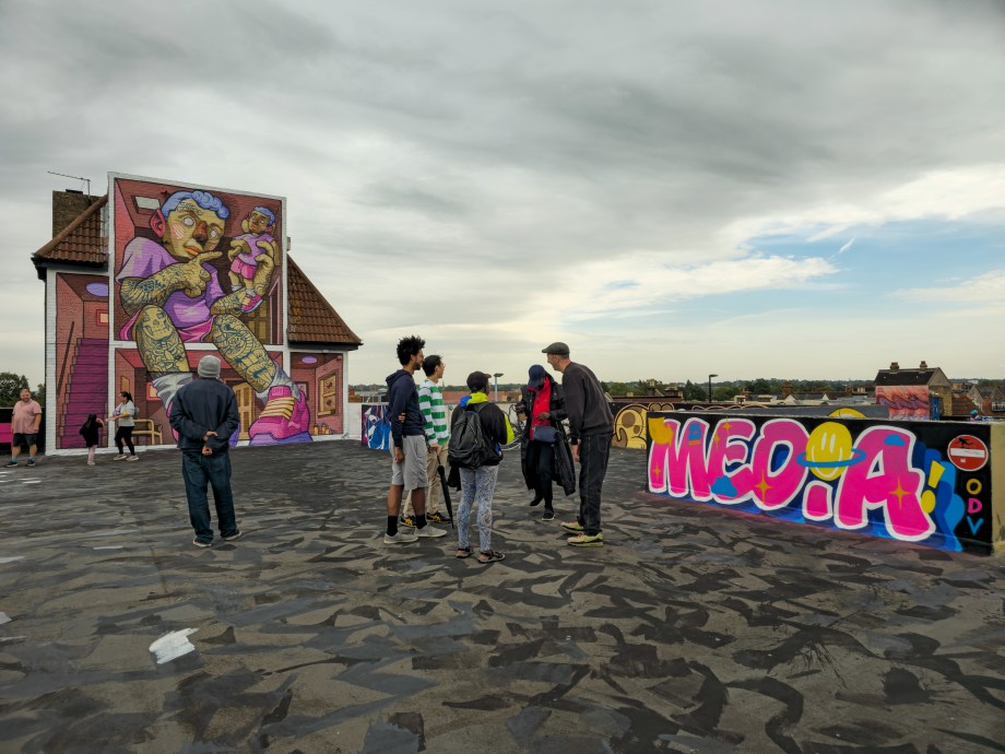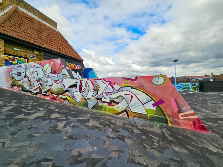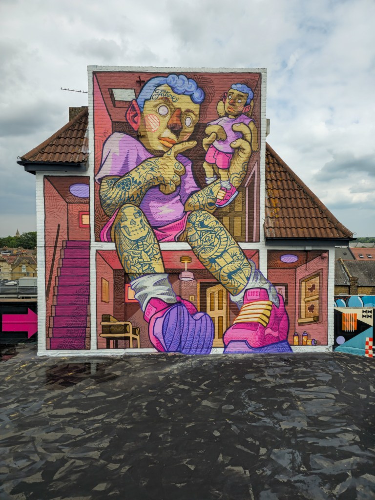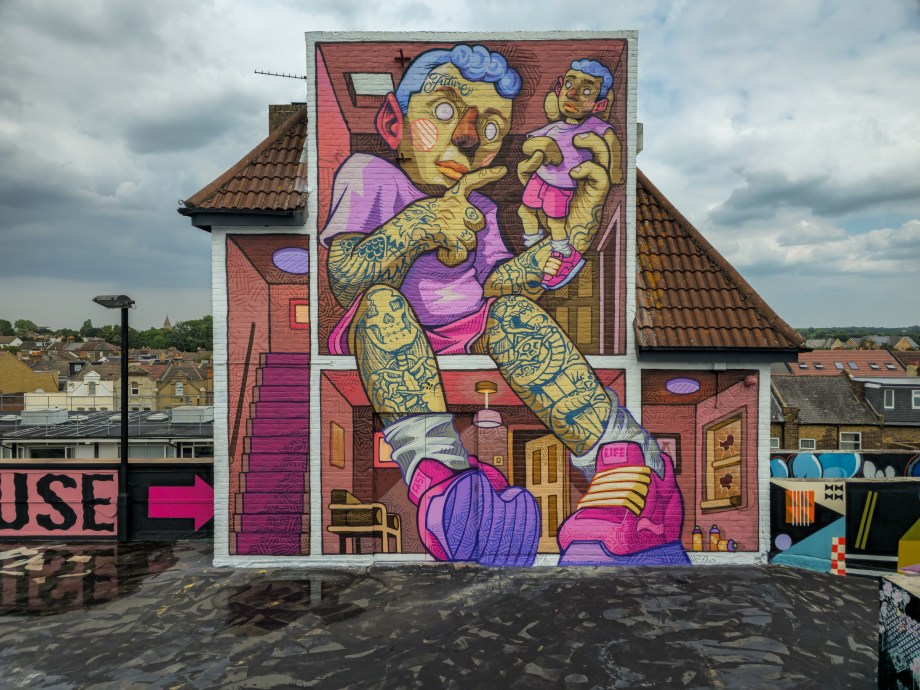 Work at the Penge Rooftop Gallery, Penge. This epic piece made masterful use of the space, as well as being a perfect finale piece on this once in a lifetime large-scale skyline wall. First class and for ourselves an absolute highlight of 2025 in Penge and London.