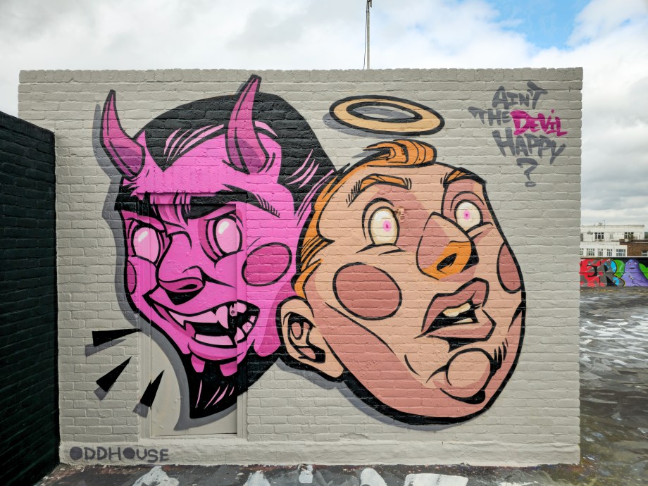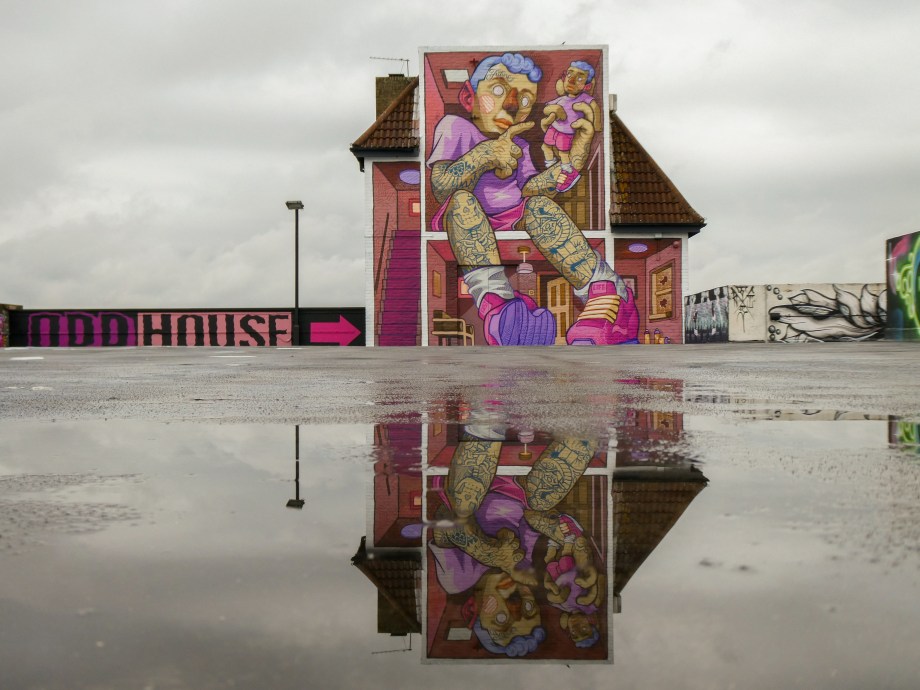 Painting with a combination of spray paint and brushes with bucket paint, Odisy takes his rich illustration style and effortlessly makes his characters and scenes transition perfectly from paper to wall and to skin in his tattoo work. This striking series of works were put up with support from ourselves London Calling Blog as part of our SprayExhibition20 community street art project.
