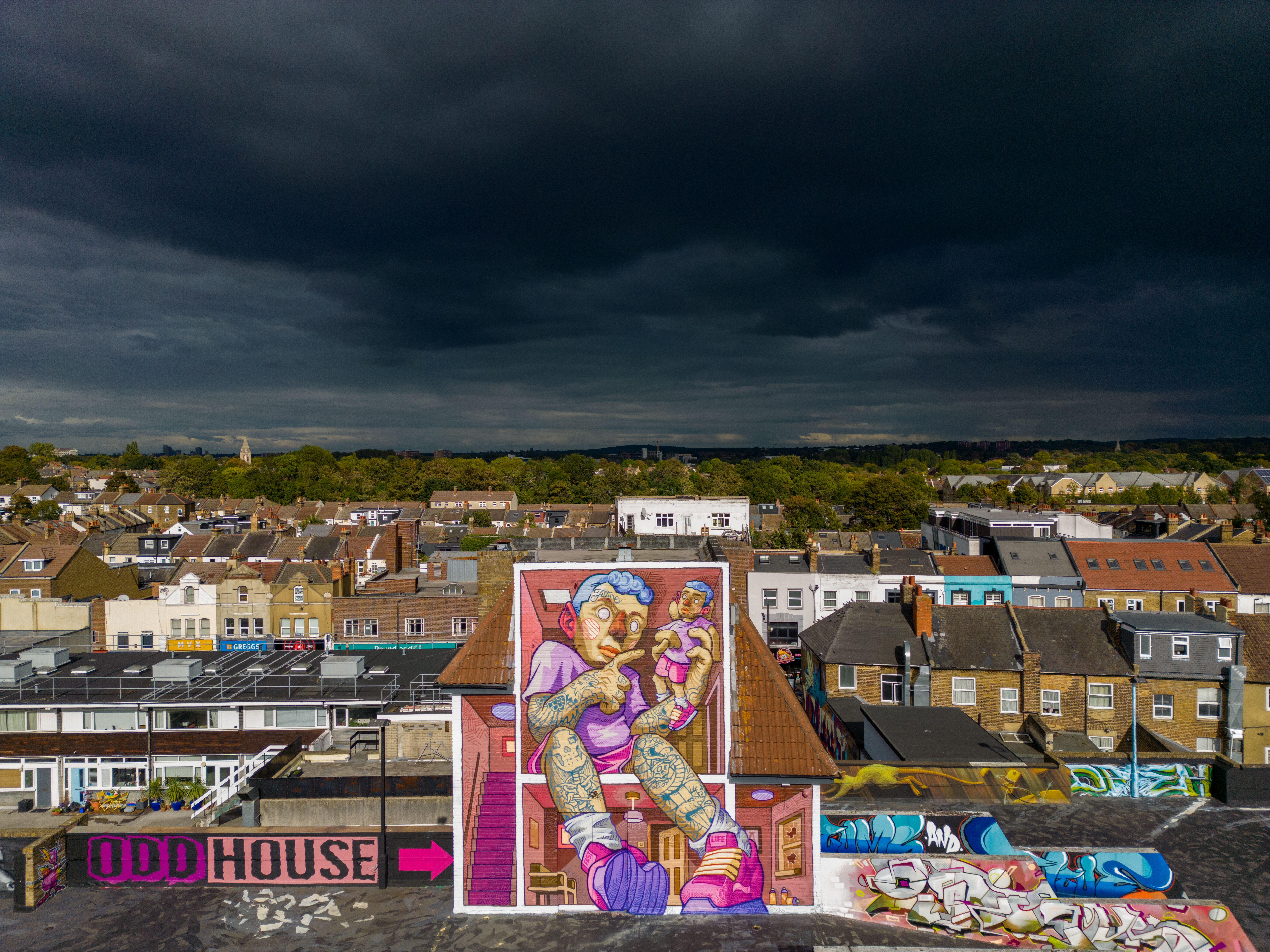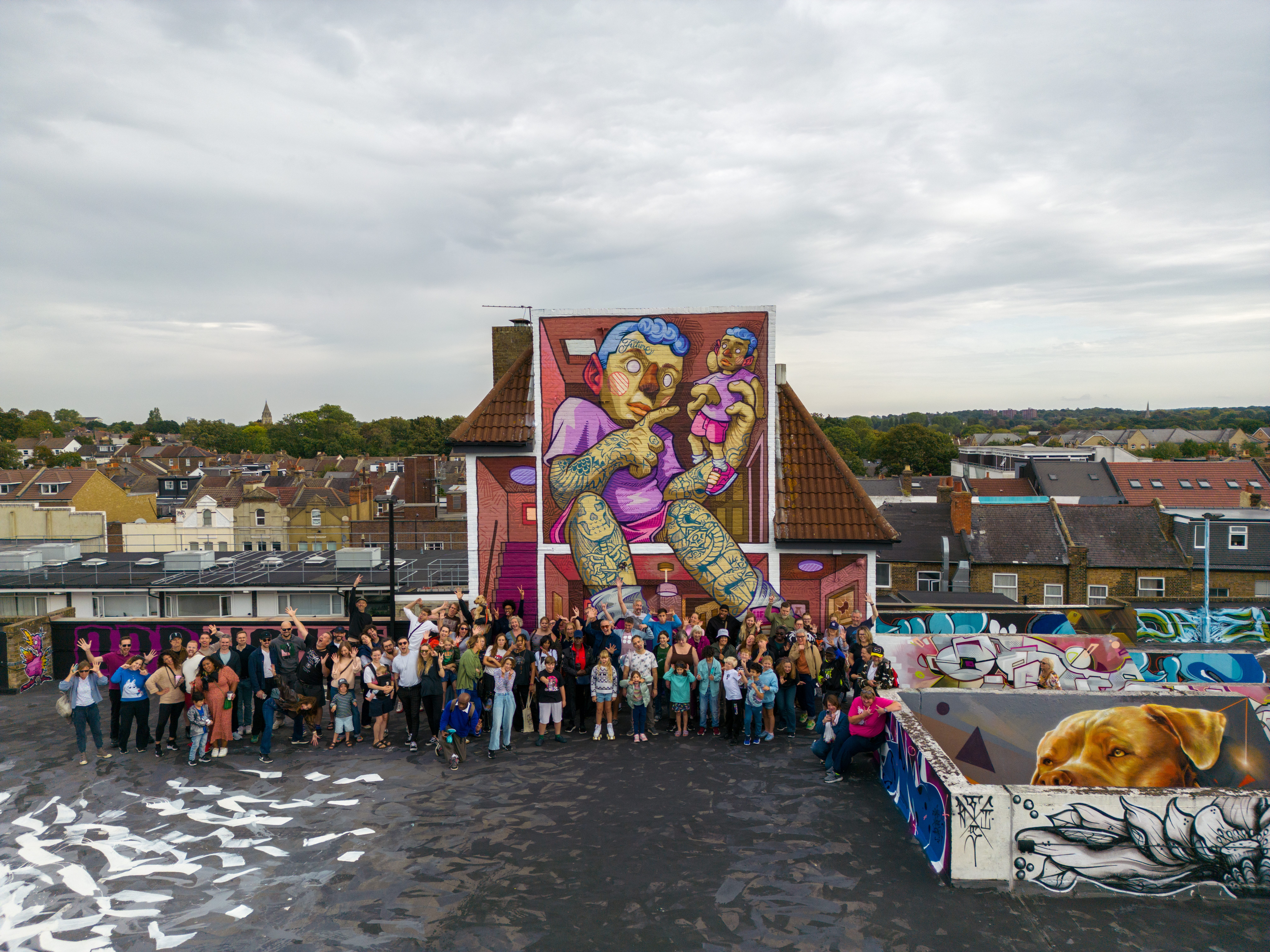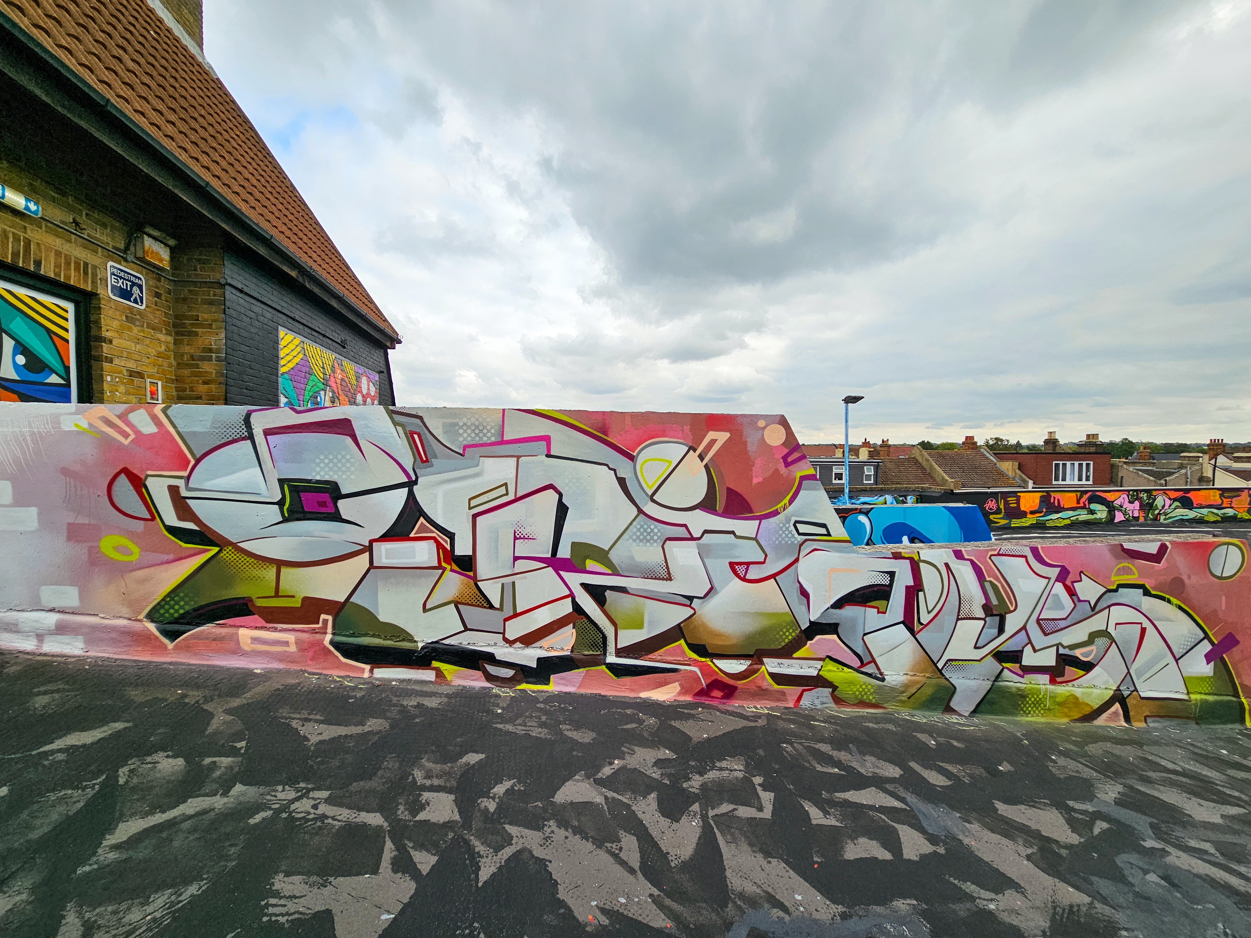 Work at the Penge Rooftop Gallery, Penge. This epic piece made masterful use of the space, as well as being a perfect finale piece on this once in a lifetime large-scale skyline wall. First class and for ourselves an absolute highlight of 2025 in Penge and London.