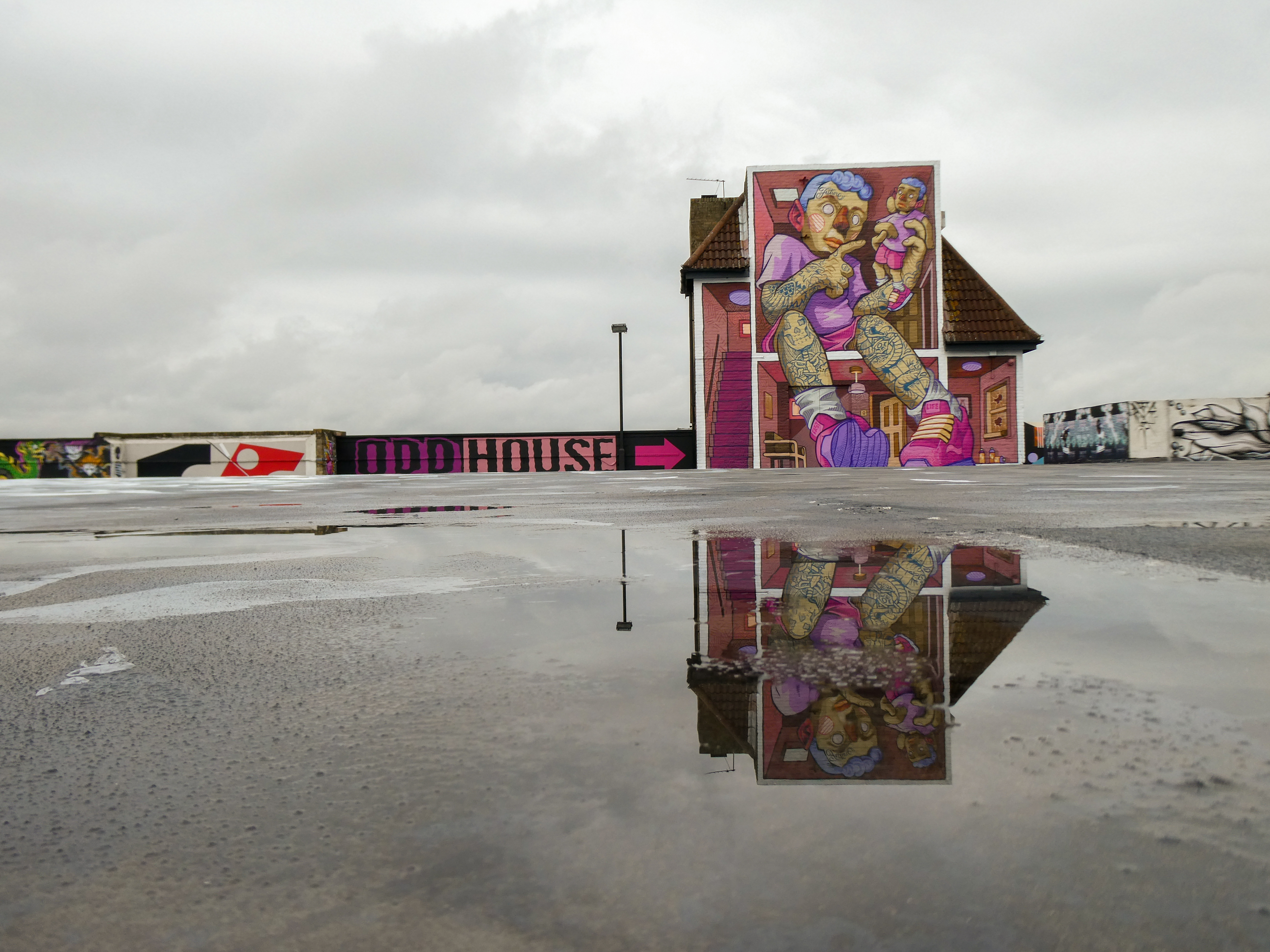 Painting with a combination of spray paint and brushes with bucket paint, Odisy takes his rich illustration style and effortlessly makes his characters and scenes transition perfectly from paper to wall and to skin in his tattoo work. This striking series of works were put up with support from ourselves London Calling Blog as part of our SprayExhibition20 community street art project.