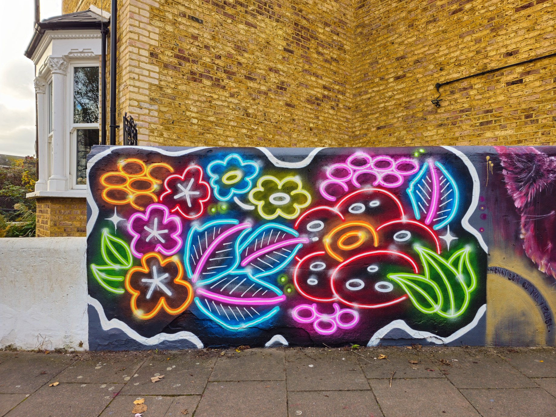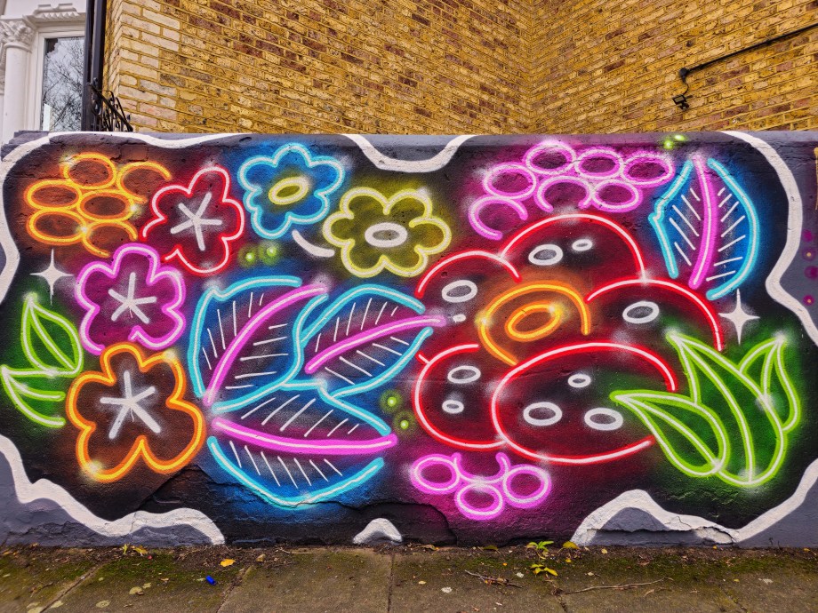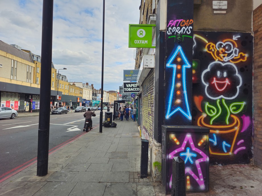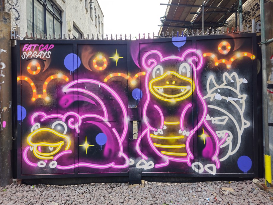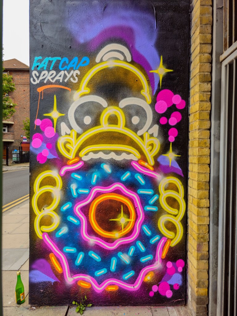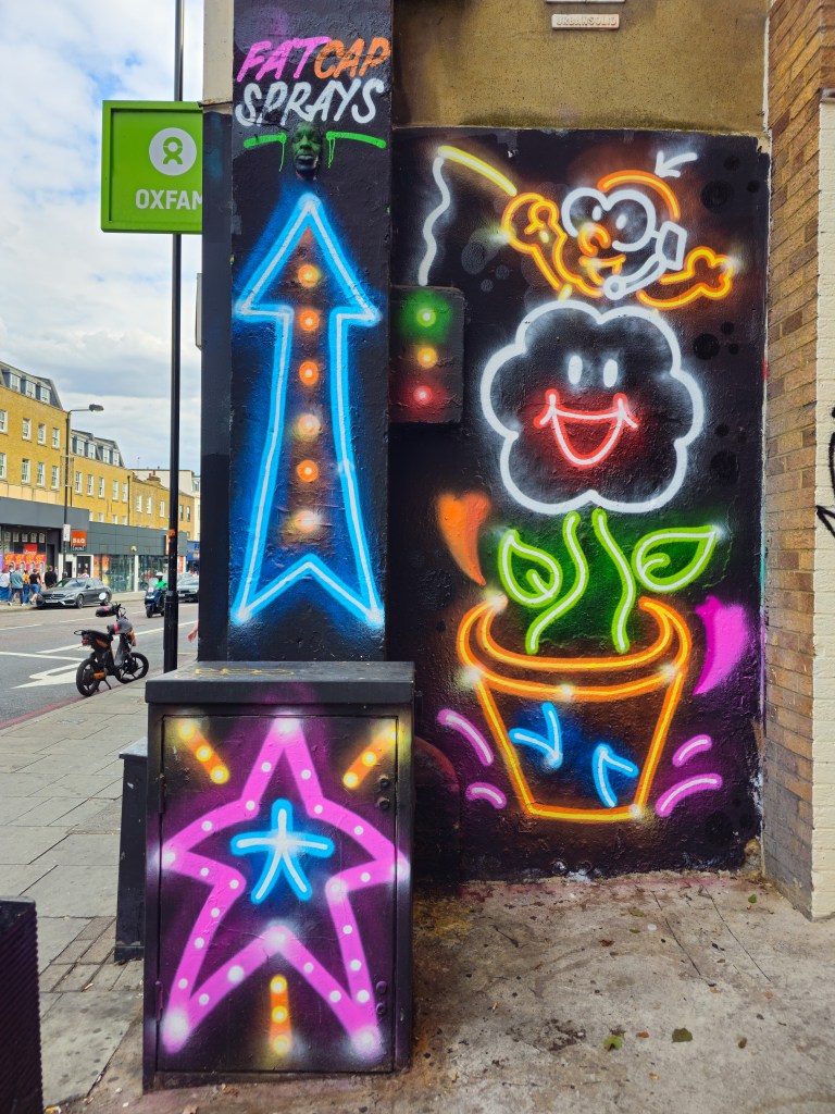 For our next blog post catching up with 2025 features a series of 17 pieces we have seen around North, East and South London from Fat Cap Sprays. It’s always a pleasure see fresh works from this prolific artist and thankfully we never have to go to far and wait to long to do so, this artist is always getting up all over London. All of the below works have been depicted in the artist’s own distinct take on neon style illustration that bring these characters to life and really pop from the surface they adorn. It is also always interesting to look back at the end of a year and see how this artist’s style has evolved in subjects and/or composition. The works below placed up in Penge were put up with support from London Calling Blog, for SprayExhibtion20.