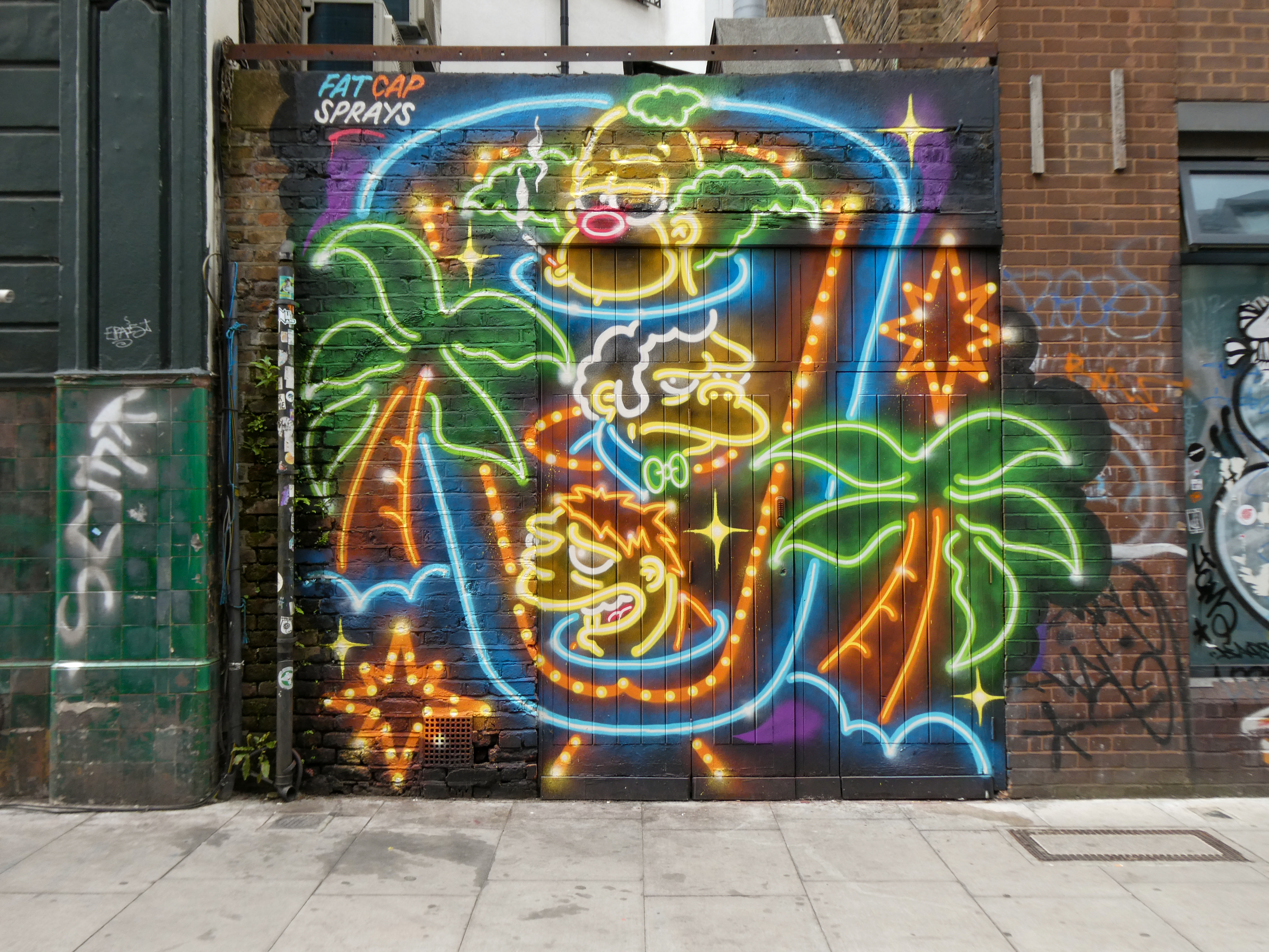 For our next blog post catching up with 2025 features a series of 17 pieces we have seen around North, East and South London from Fat Cap Sprays. It’s always a pleasure see fresh works from this prolific artist and thankfully we never have to go to far and wait to long to do so, this artist is always getting up all over London. All of the below works have been depicted in the artist’s own distinct take on neon style illustration that bring these characters to life and really pop from the surface they adorn. It is also always interesting to look back at the end of a year and see how this artist’s style has evolved in subjects and/or composition. The works below placed up in Penge were put up with support from London Calling Blog, for SprayExhibtion20.