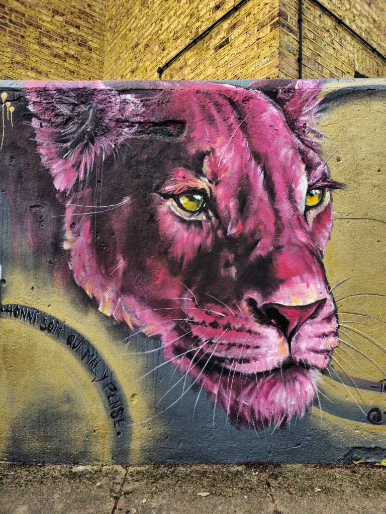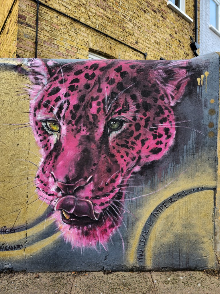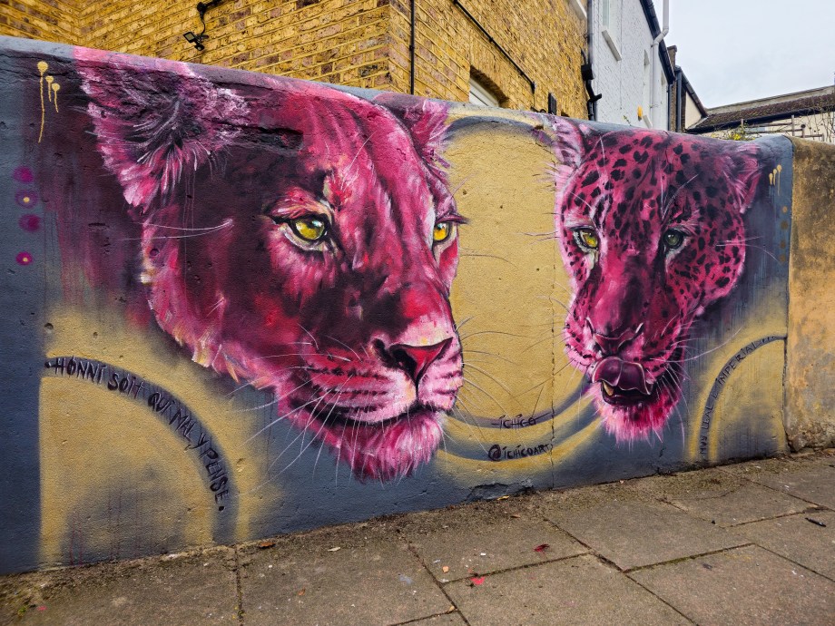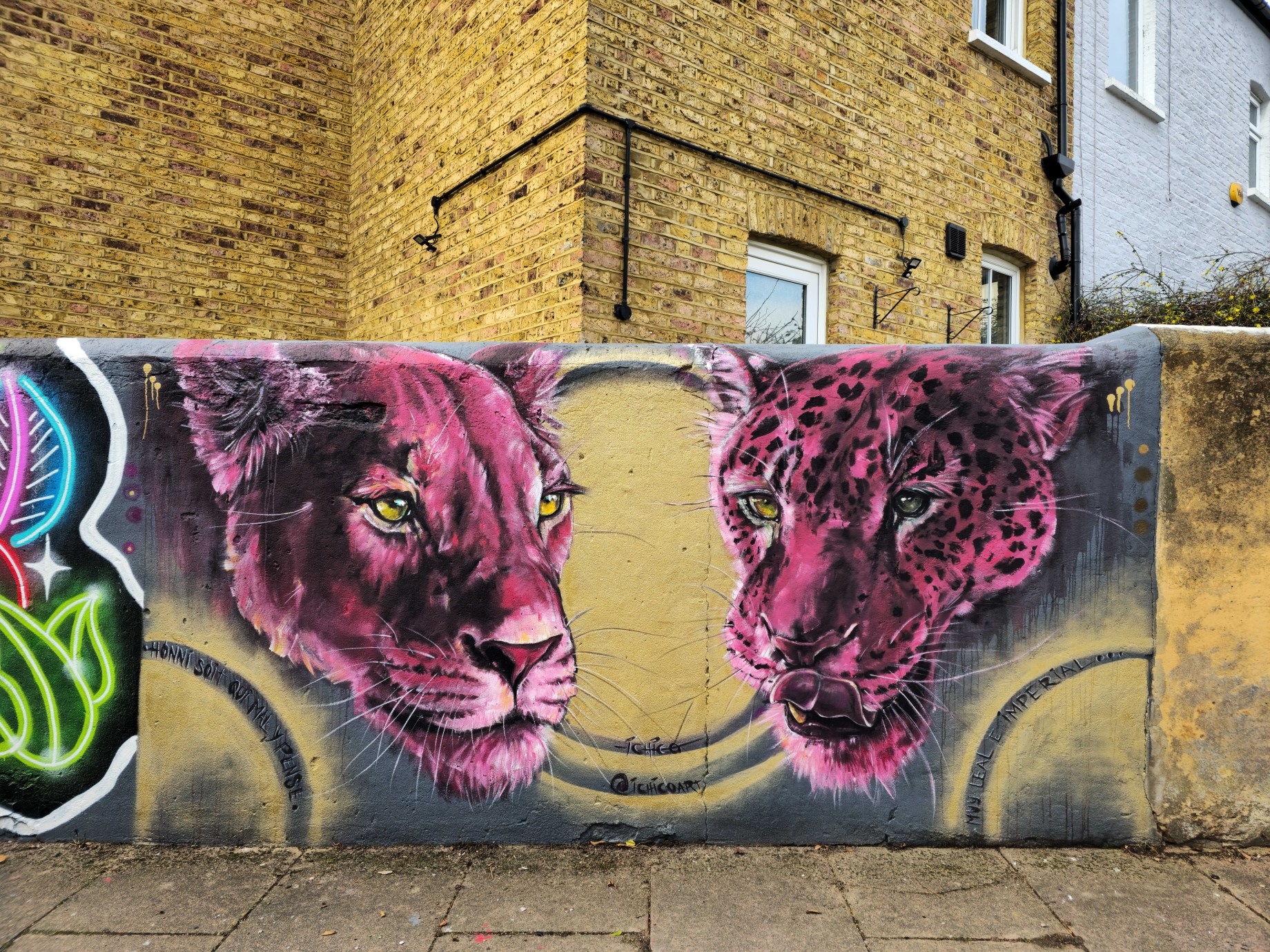 As winter rolled in London received a visit from Mexican street artist and tattooist Ichico, who whilst over took to time to visit Penge to leave a beautiful nature inspired scene. The work painted primarily with brushes and bucket paint features a lioness and jaguar, drawing a connection between England and her homeland of Mexico. Such a striking artwork – cats of all sizes are among our absolute favourite animals in the world and this pair have made a beautiful addition to Penge. It is always a pleasure to discover new artists, even more so when the come and paint in our corner of the city, and Ichico’s visit was certainly a highlight of 2025 for ourselves. We hope it isn’t to long before this artist returns to London to share her creative talent. The beautiful work below were put up with support from ourselves London Calling Blog as part of our SprayExhibition20 community street art project.