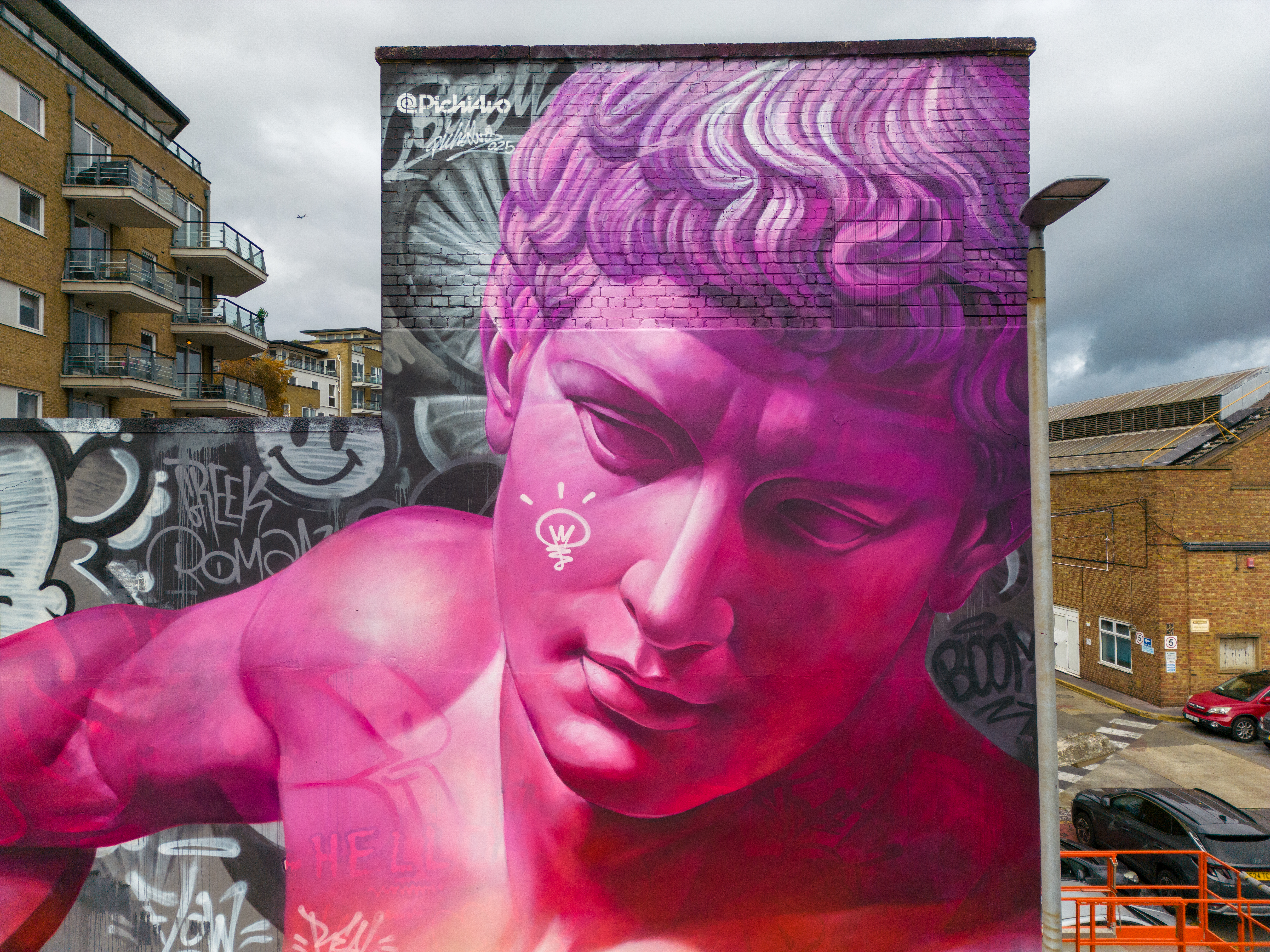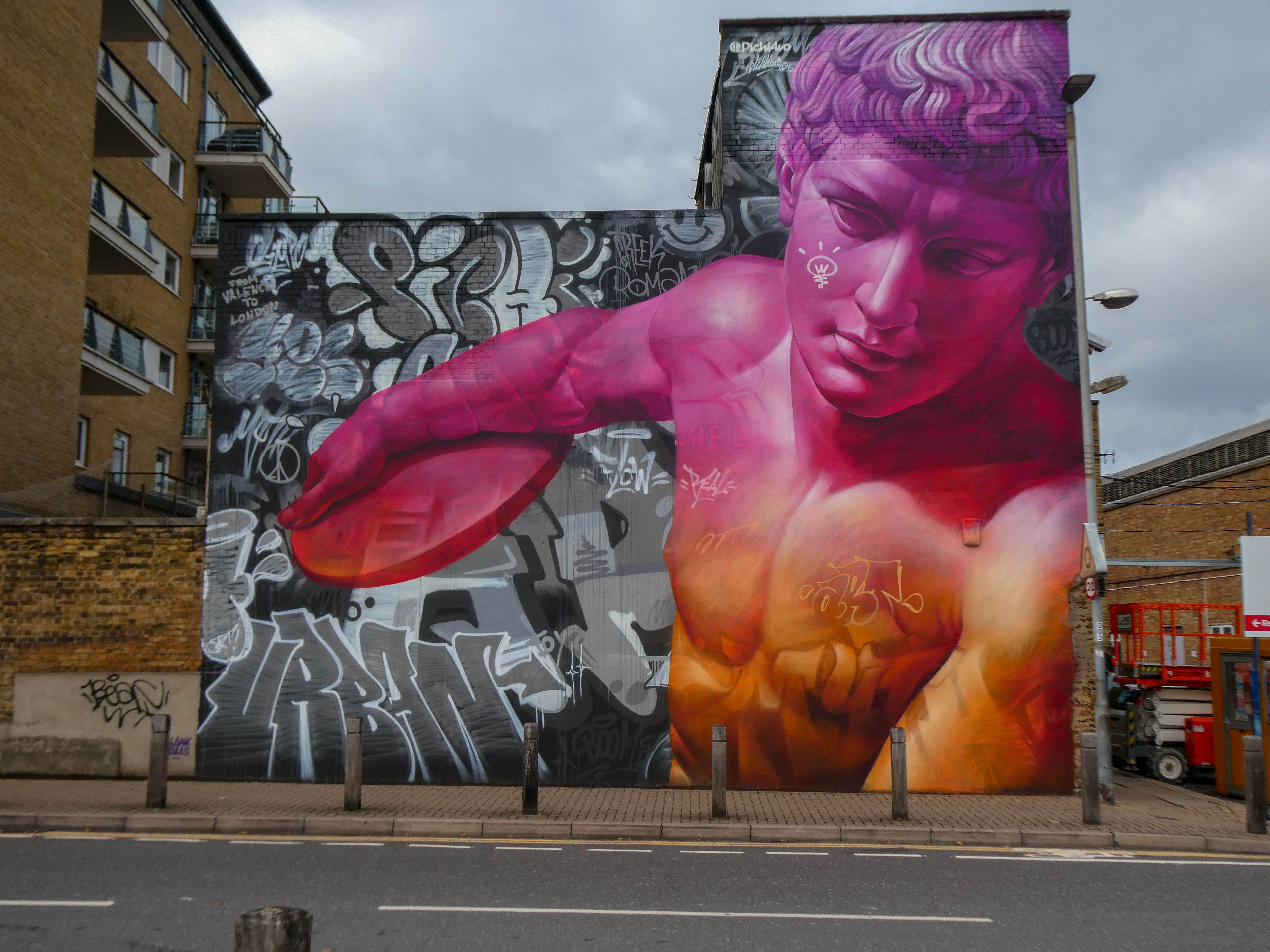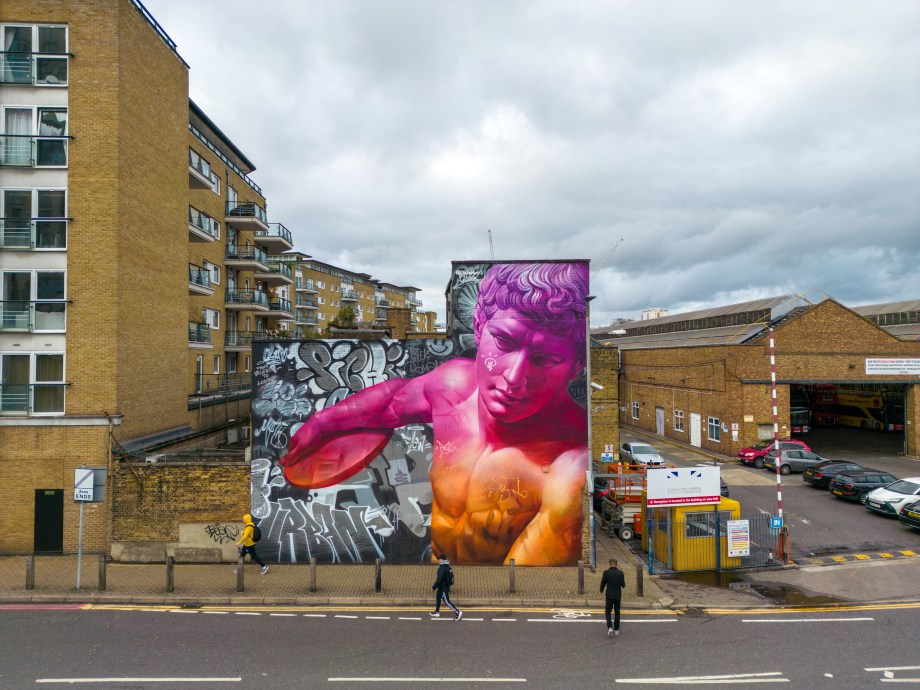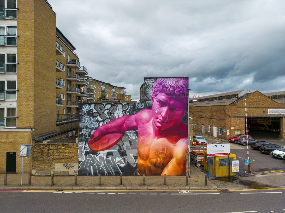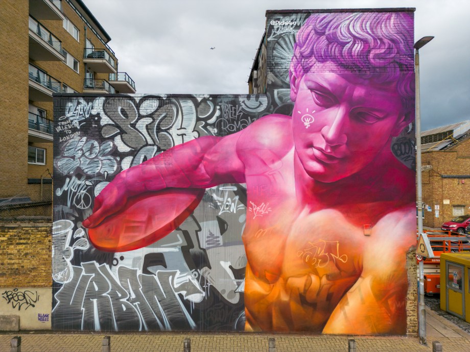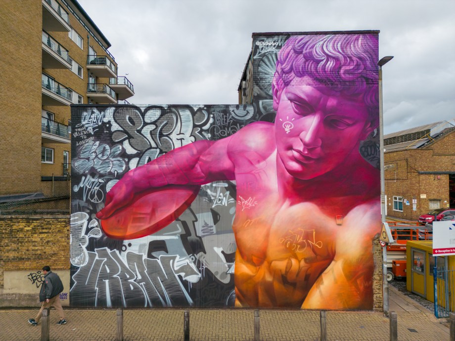 As Autumn took hold, London received a visit from Spanish duo Pichi & Avo aka PichiAvo, who placed up a large-scale piece in Wandsworth that is first rate. Presenting a work in their unique style fusing classical antiquities from Ancient Greece or Ancient Rome and placing them amid a modern graffiti setting that sets to make the traditional and subversive collide into something so fantastically magical, as is the case with this great work in Soho. It is interesting to see how the duo’s work has evolved since we last saw their work in person back in 2017, being much more rounded, depth driven and colourful. This exceptional work can be found in Marl Road, Wandsworth and was put up with support from Blank Walls.