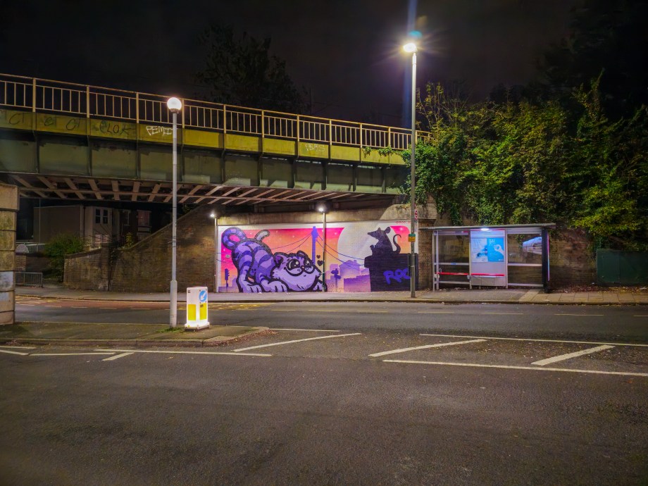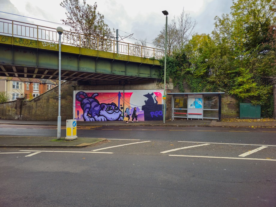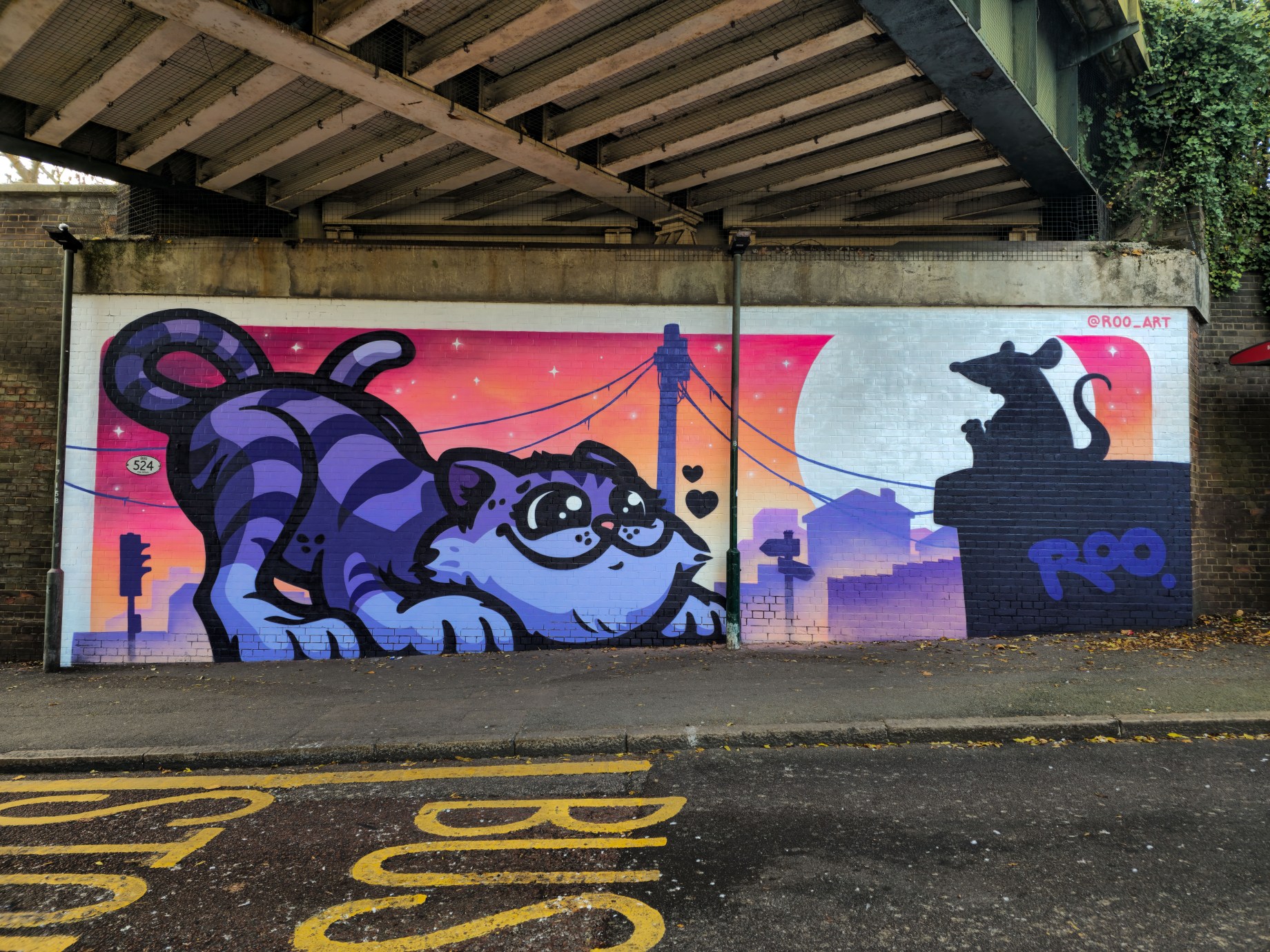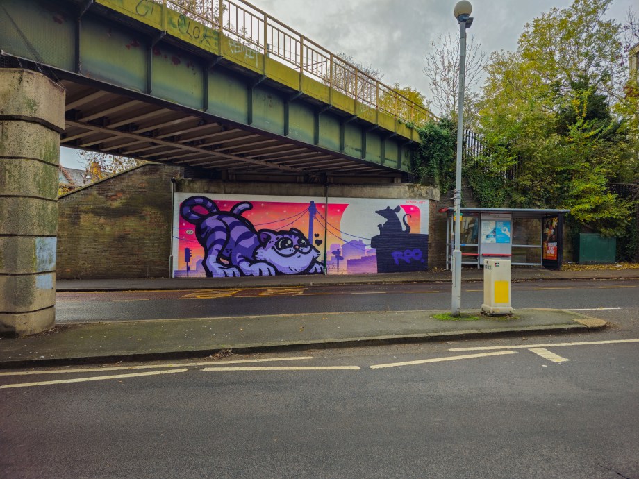 Next up we are taking a look at a superb addition to Penge – well just over the border in neighbouring Beckenham – by street artist Roo, which was placed up at the end of Autumn 2025. It’s always a pleasure to have Roo visit our corner of London and leave some of her exceptional illustrative work for us to admire, and this work below is no exception. The work features Roo’s trademark humour and sweetness – not to mention the exceptionally clean manner in which her artworks are produced – in this case featuring a rather happy and excited city kitty ready to pounce on the silhouetted rat perched on a bin. Beyond the humour and meticulous execution of this piece, we absolutely love the colour scheme of the work. The fantastic work below were put up with support from ourselves London Calling Blog as part of our SprayExhibition20 community street art project.