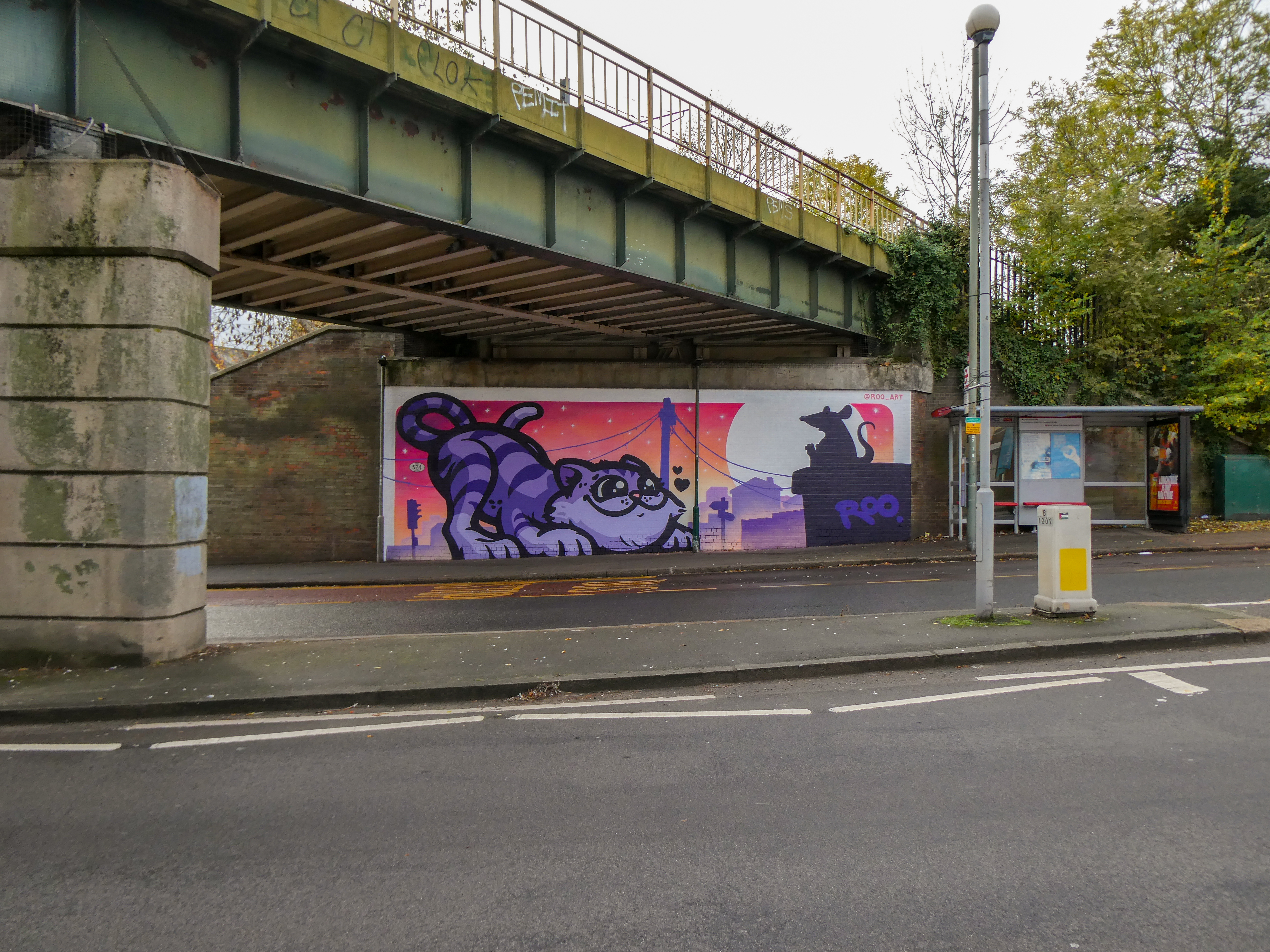 Next up we are taking a look at a superb addition to Penge – well just over the border in neighbouring Beckenham – by street artist Roo, which was placed up at the end of Autumn 2025. It’s always a pleasure to have Roo visit our corner of London and leave some of her exceptional illustrative work for us to admire, and this work below is no exception. The work features Roo’s trademark humour and sweetness – not to mention the exceptionally clean manner in which her artworks are produced – in this case featuring a rather happy and excited city kitty ready to pounce on the silhouetted rat perched on a bin. Beyond the humour and meticulous execution of this piece, we absolutely love the colour scheme of the work. The fantastic work below were put up with support from ourselves London Calling Blog as part of our SprayExhibition20 community street art project.