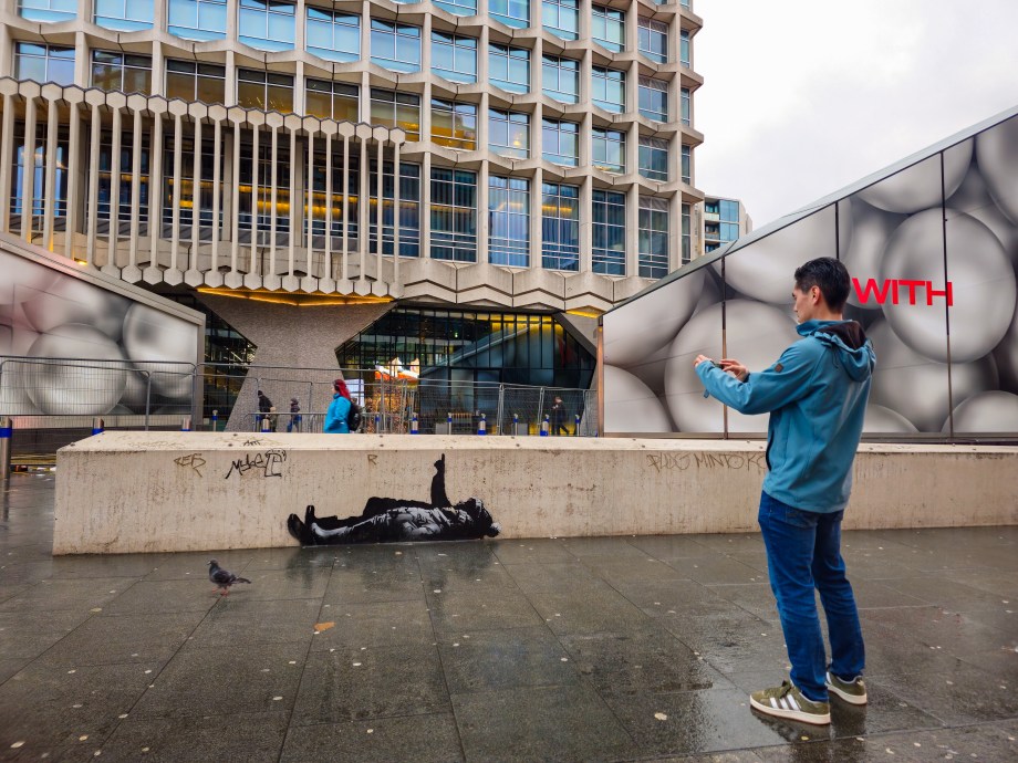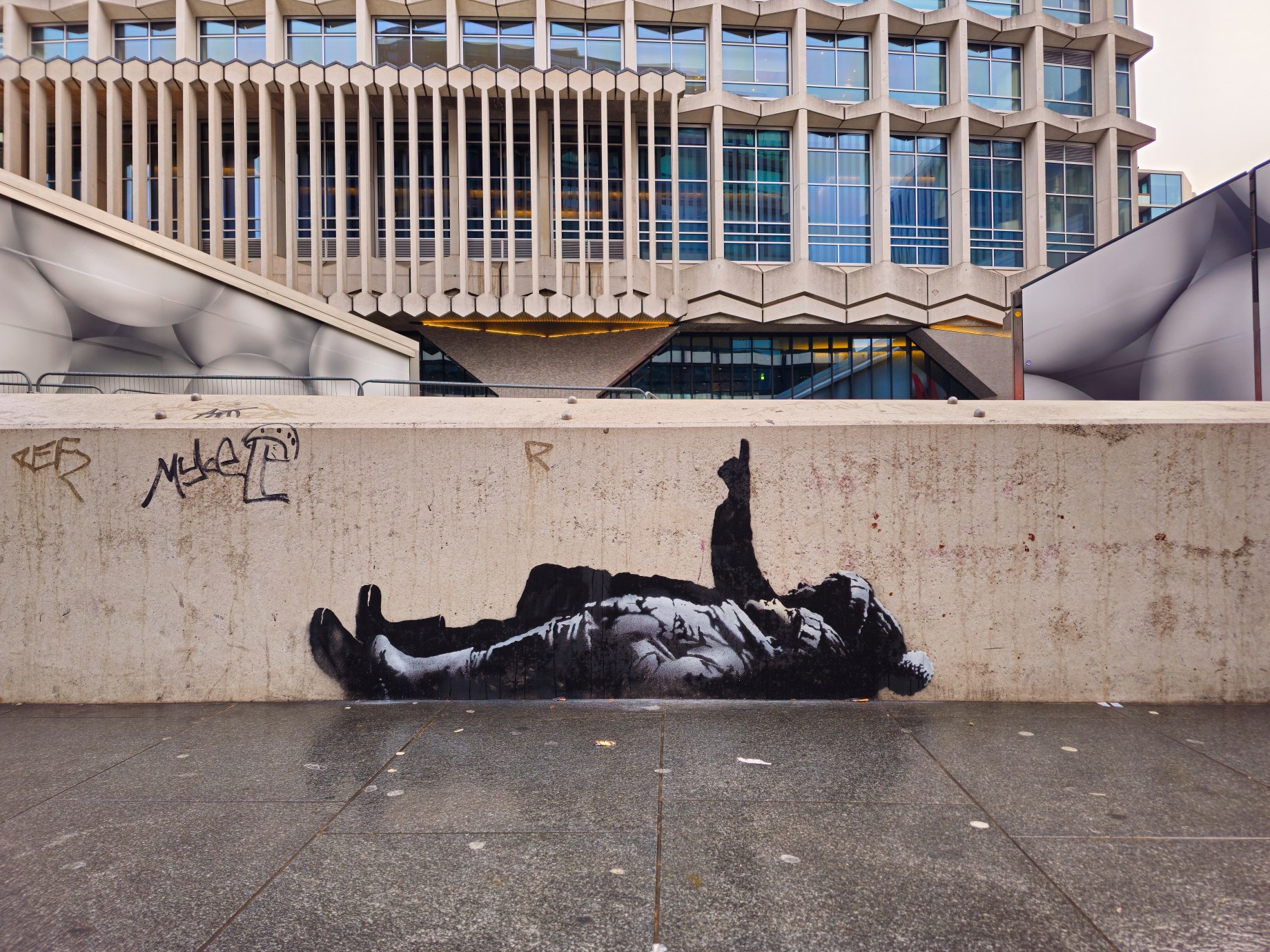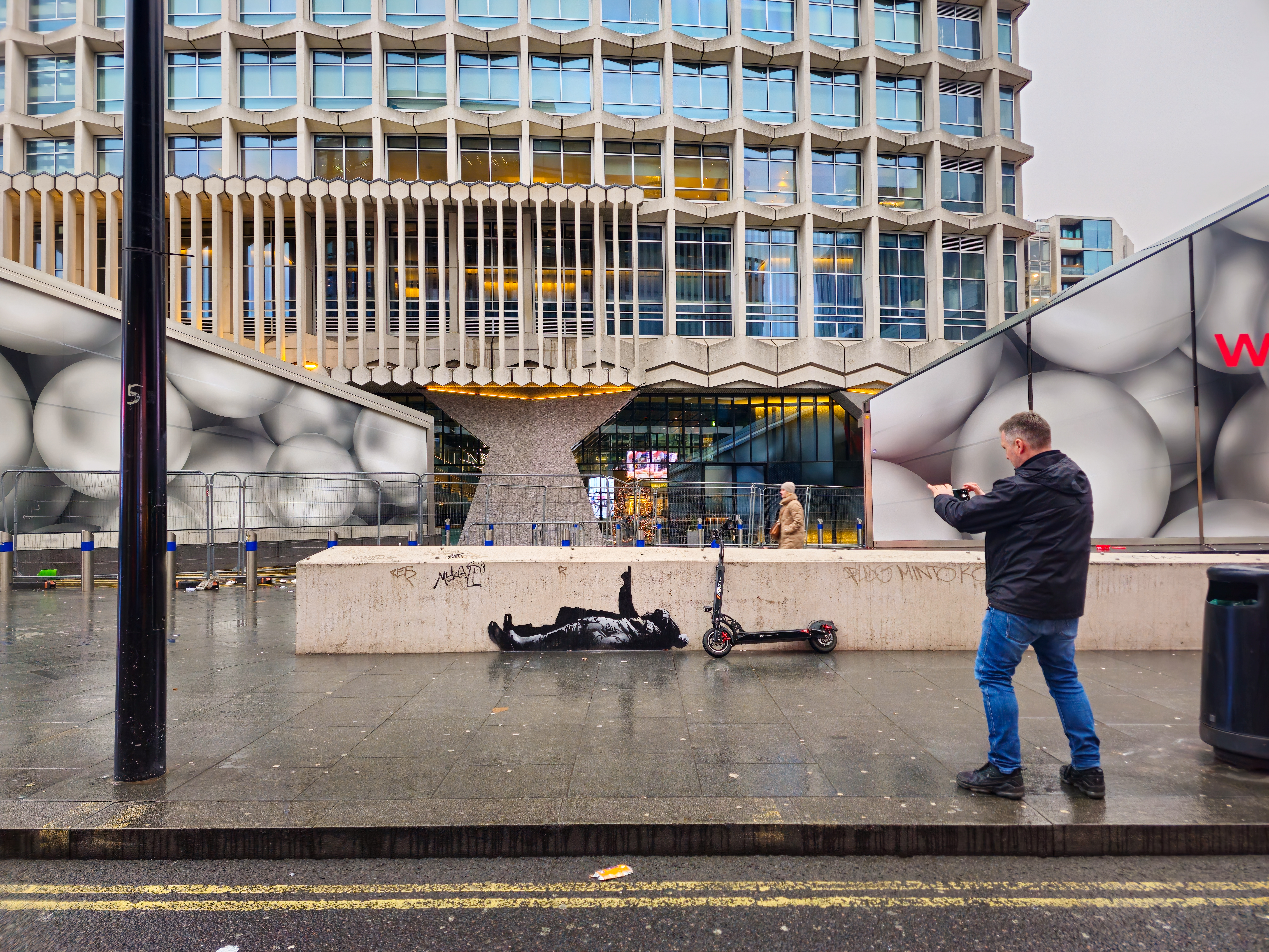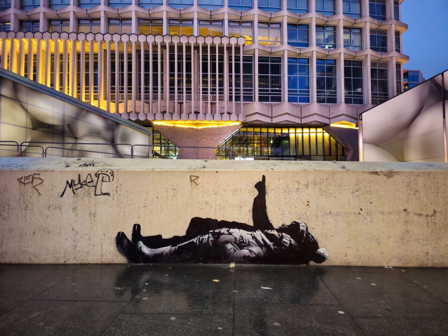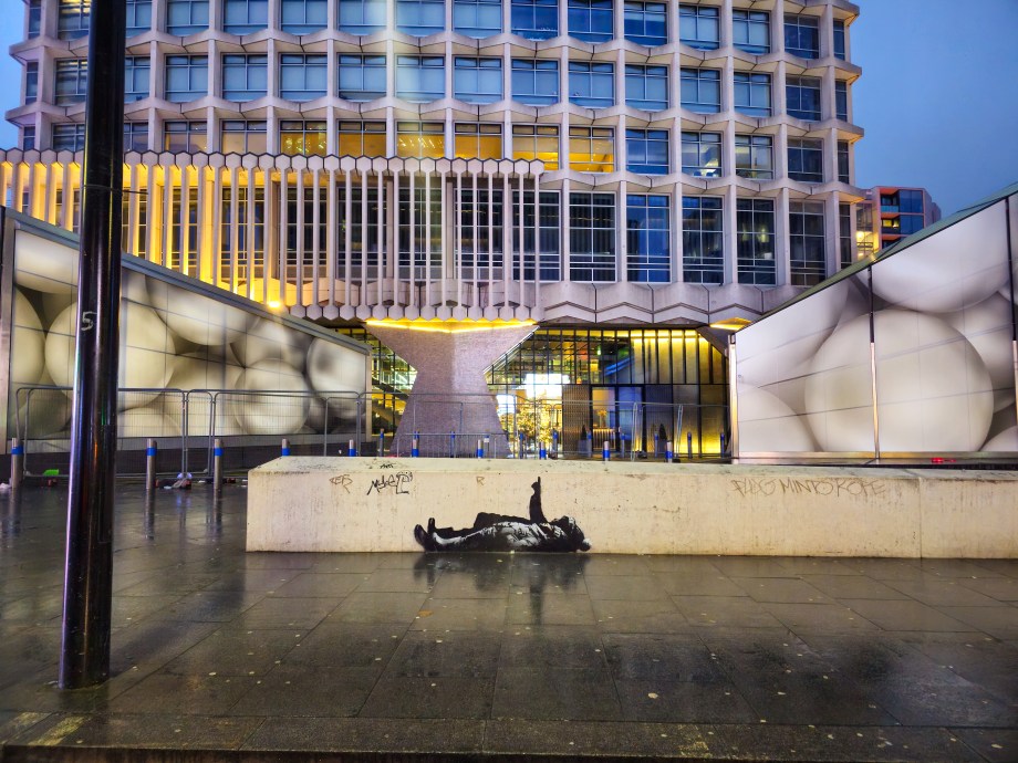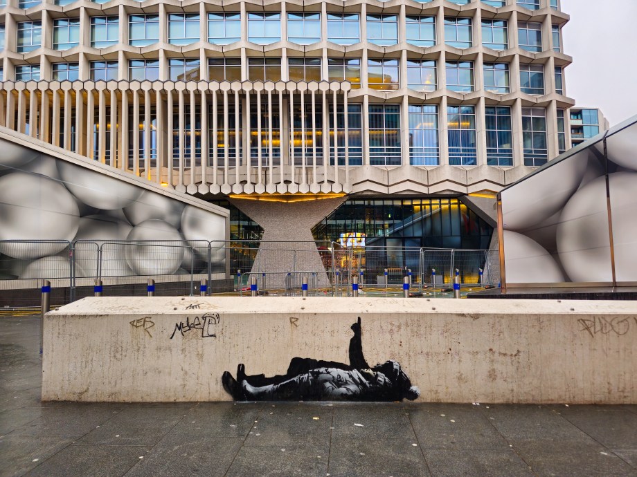 Next up in our blog posts playing catch up with works and pieces we have had the pleasure of seeing through 2025, we are taking a look at what turned out to be the first of two artworks placed up by the ever illusive and mythical Street Artist Banksy ahead of Christmas. This design was placed up in two locations in London – a first for Banksy – with one work tucked away at the back of a residential street hidden away and the one below in London’s primary shopping area, hidden in plain sight. The work below was placed up in Tottenham Court Road in front of Centre Point – almost certainly chosen for the history of this building, which upon its initial completion remained vacant for may years and in time was dubbed by the nearby homeless charity Centrepoint as “an affront to the homeless” as it was left empty to make money for the property developer. Additionally the placement highlighted how homeless people can be in such a busy and high-profile area and be completely ignored by everyone passing by and going about their lives.
