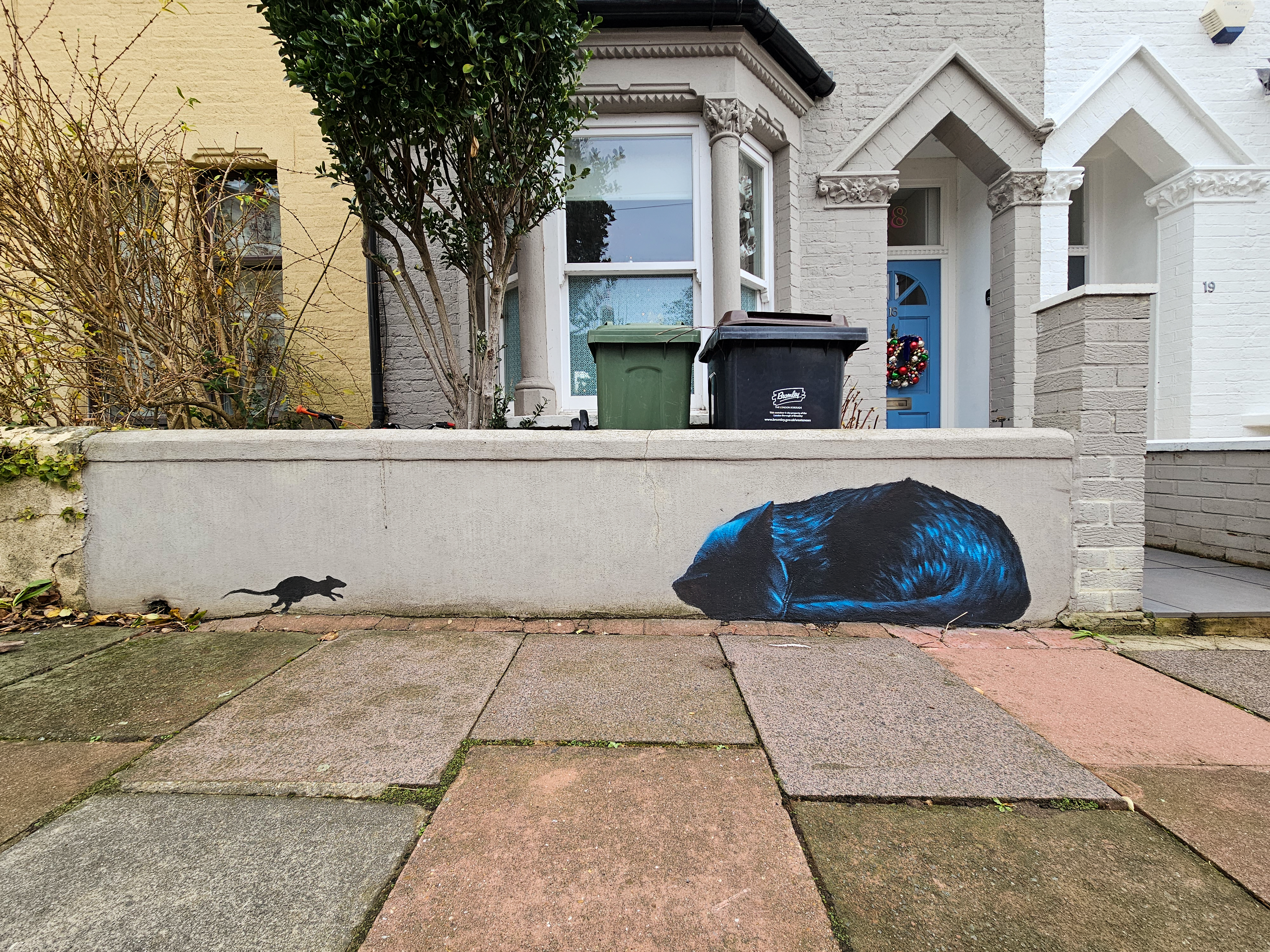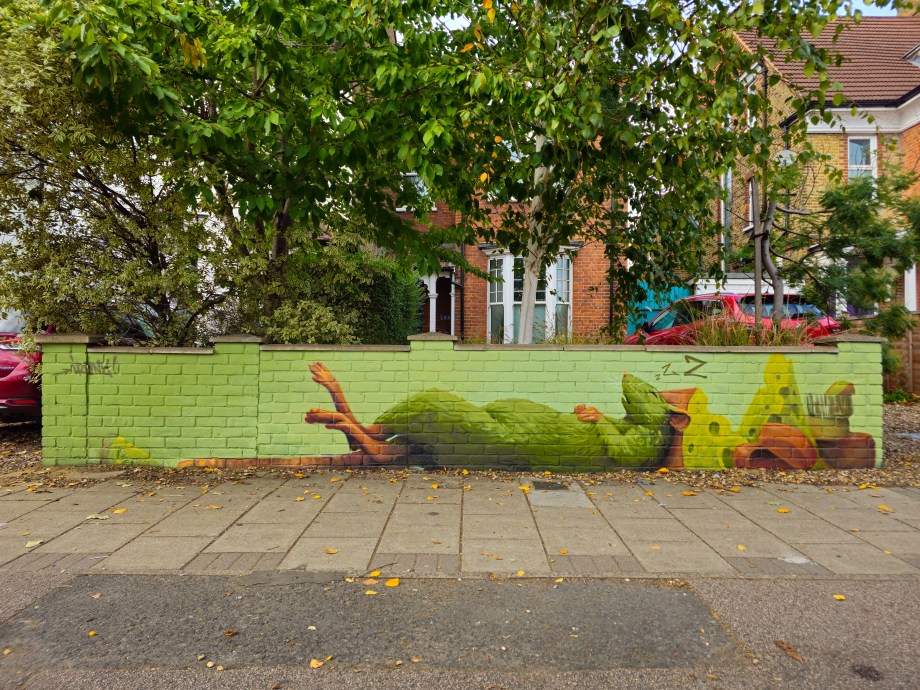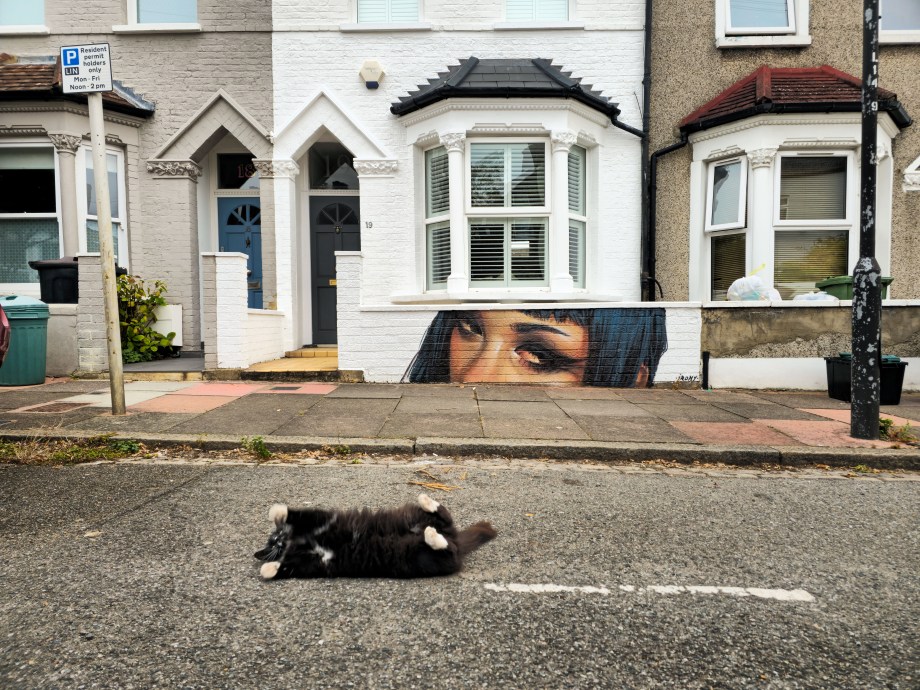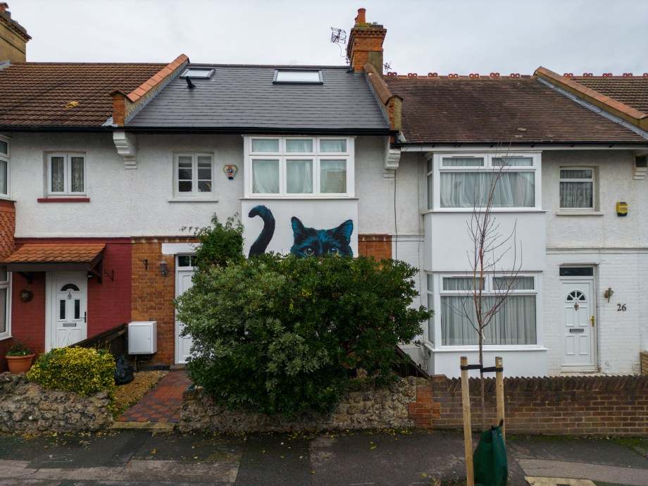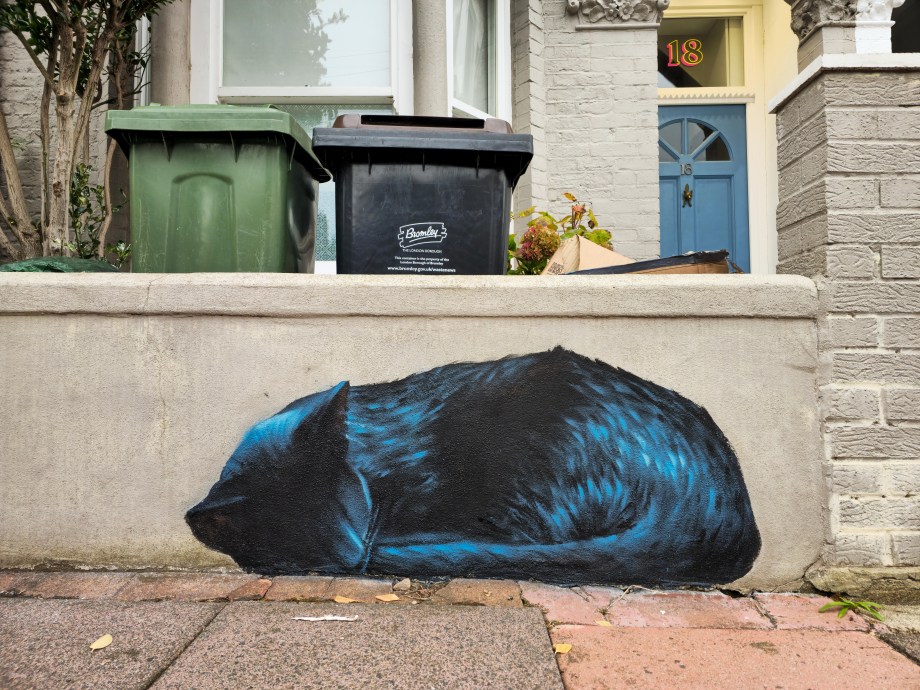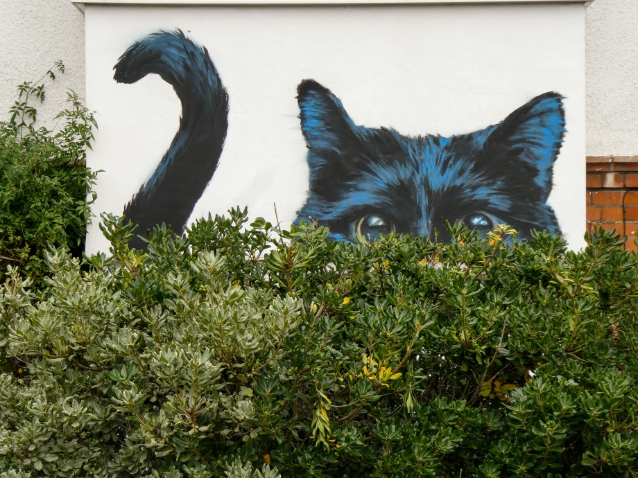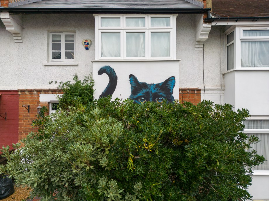 As Autumn rolled into winter the Penge area was lucky to gain a series 0f seven incredible artworks from street artist Irony. Certainly no stranger to the area, Irony was one of the first artists to paint for our community initiative ten years ago, and in that time they have hit up a substantial number of pieces which have always been some of the best contributions to the project. These works are no exception. Our favourite aspect of Irony’s street pieces is their ability to consistently take on awkward or unconventional spots and completely own them – this is best demonstrated below by the recent addition to Westbury Road in the form of a black cat peering over a bush. The fantastic array of works below were put up with support from ourselves London Calling Blog as part of our SprayExhibition20 community street art project.